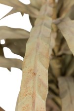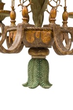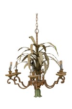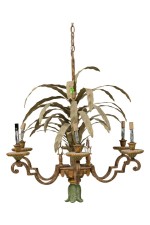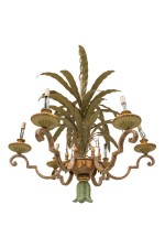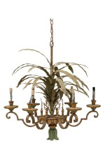 Italian Venetian style 6 armed tole chandelier, gilt and polychrome painted sheet and cast metal, the central standard modeled as a draped pedestal on foliate foot, issuing a frond of palm leaves, the six scrolling arms ending in cups topped with electrified candlesticks