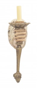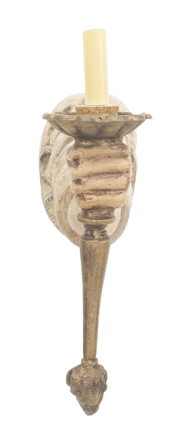 PAIR of Italian Venetian-style (20th Century) painted tole metal wall sconces in the shape of arms holding torches with candles. (PRICED AS PAIR).