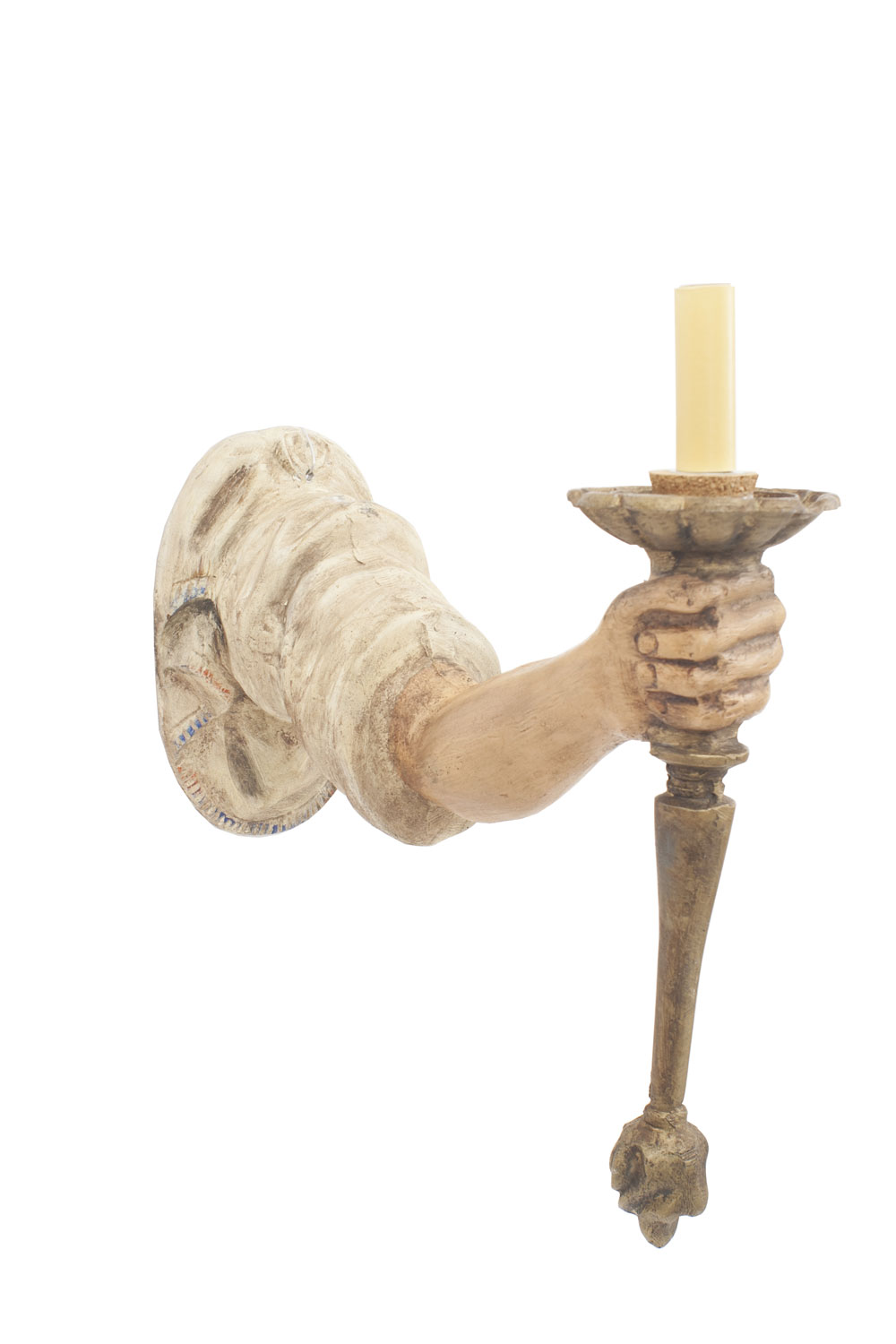 PAIR of Italian Venetian-style (20th Century) painted tole metal wall sconces in the shape of arms holding torches with candles. (PRICED AS PAIR)