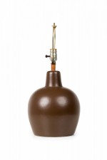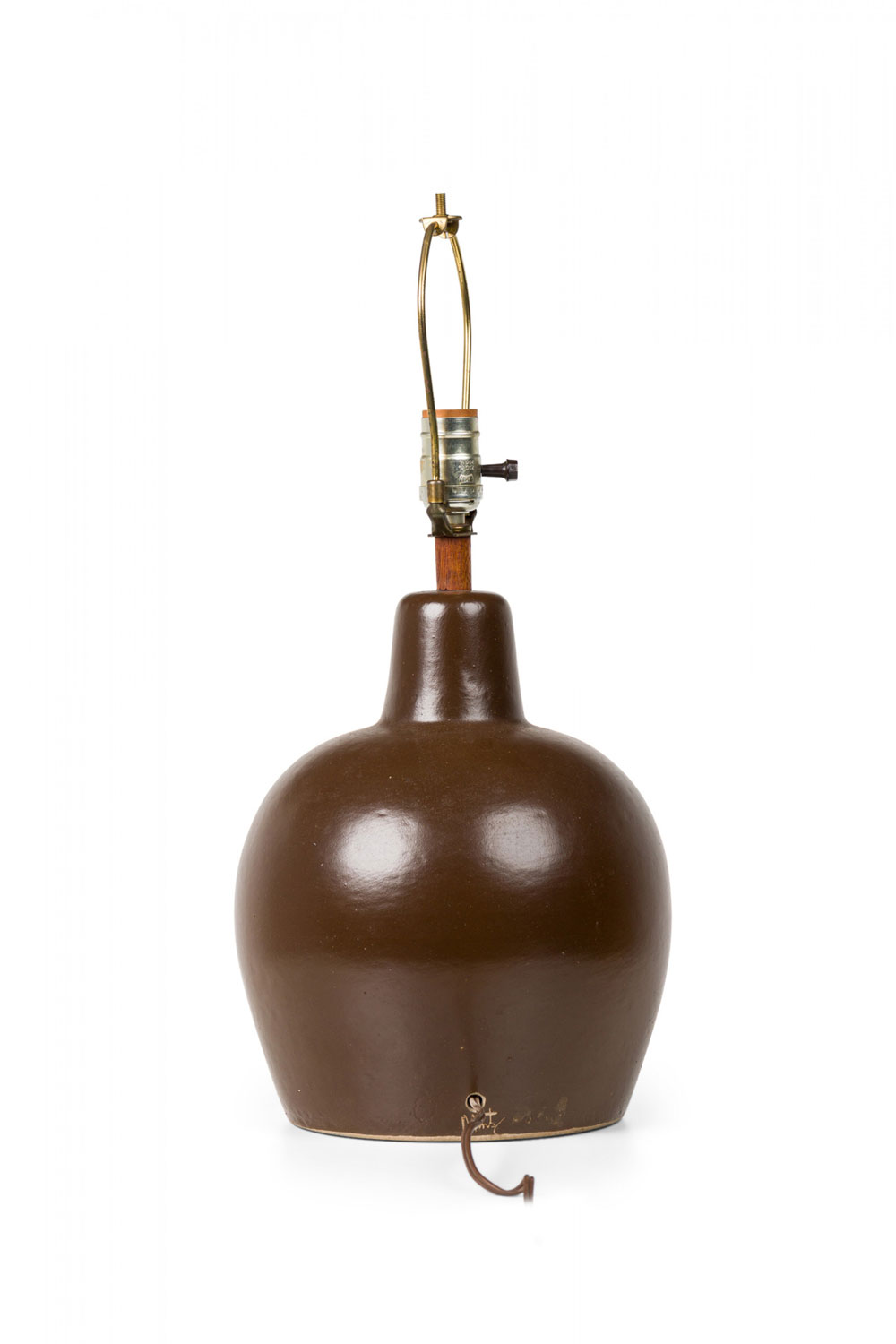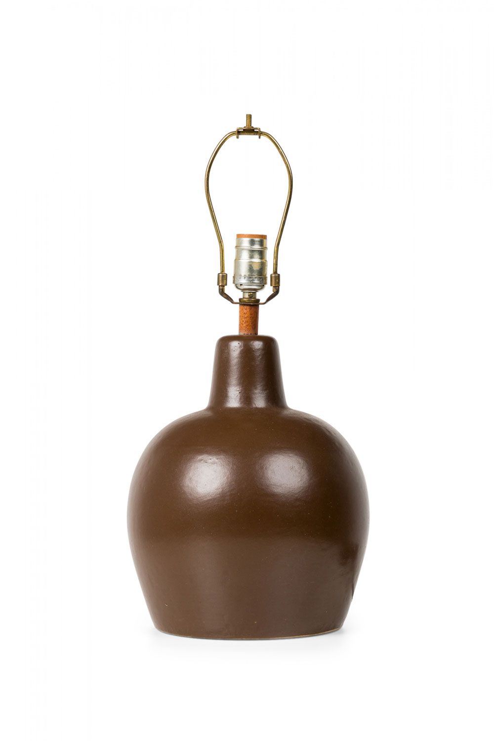 Mid-Century American stoneware ceramic table lamp (Model #51-30) in globular form with tapered neck extending to a walnut stem with functioning brass light socket and harp, glazed in a dark matte brown, sitting on a flattened bottom. (JANE AND GORDON MARTZ FOR MARSHALL STUDIOS)