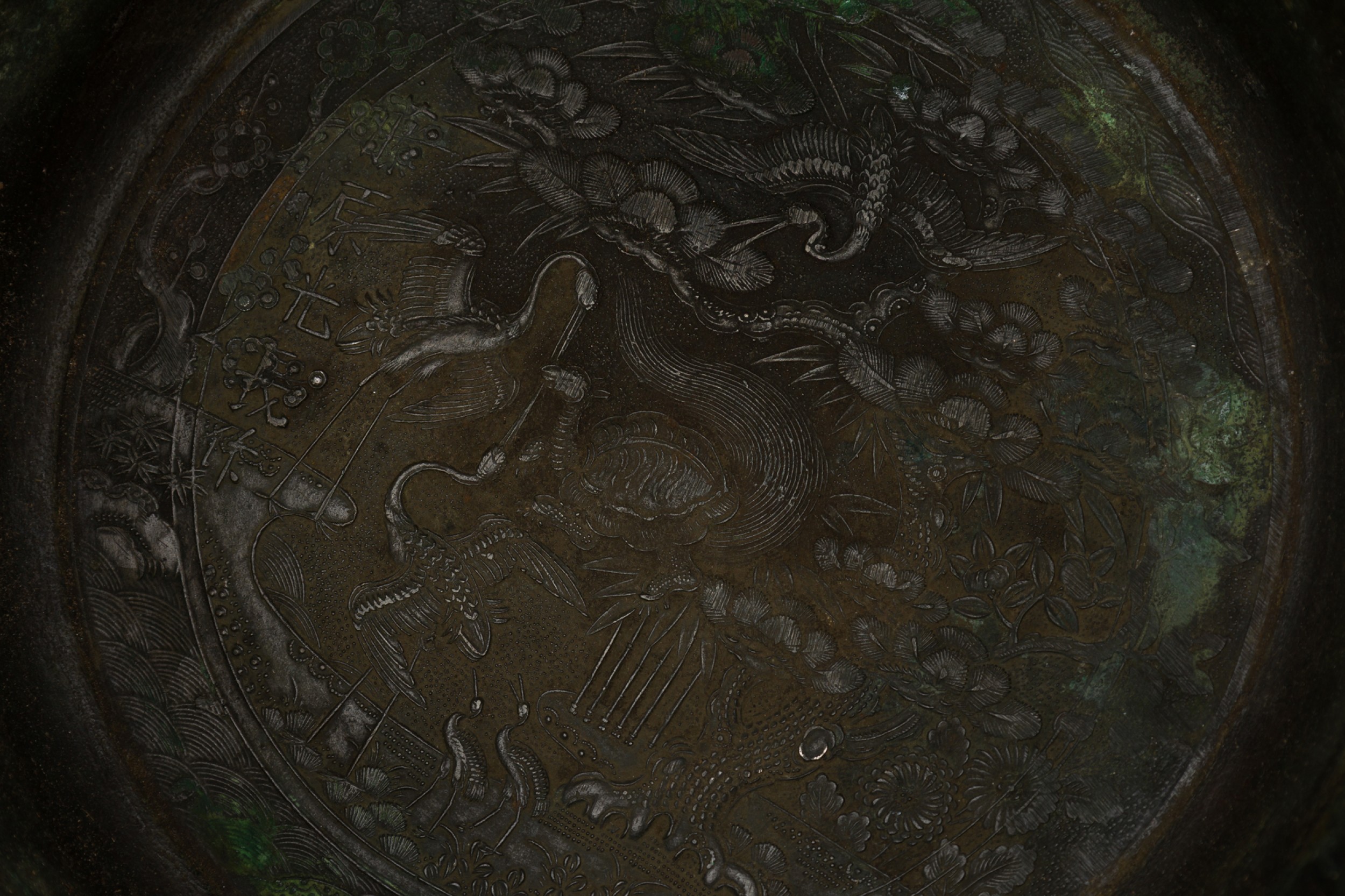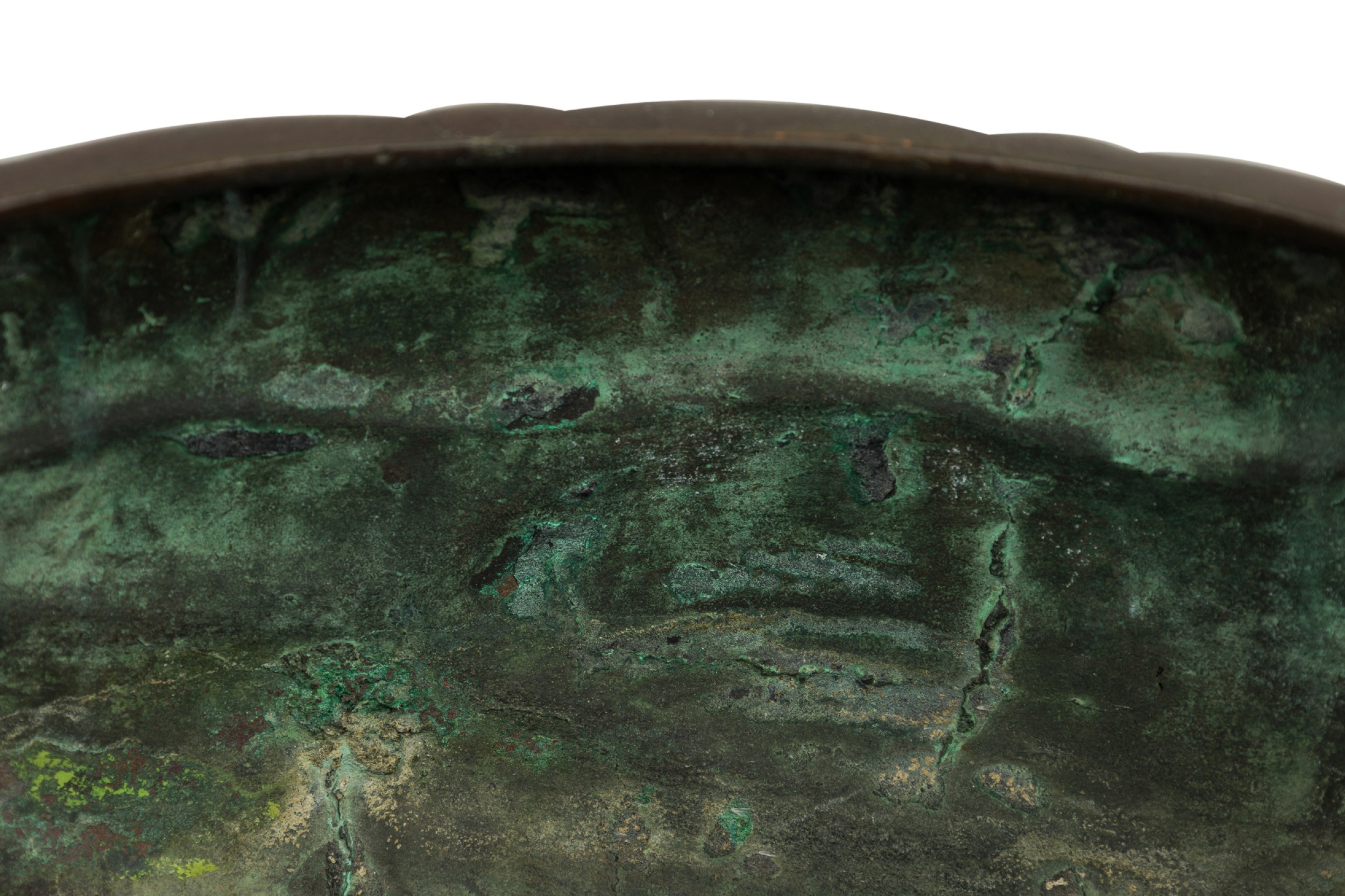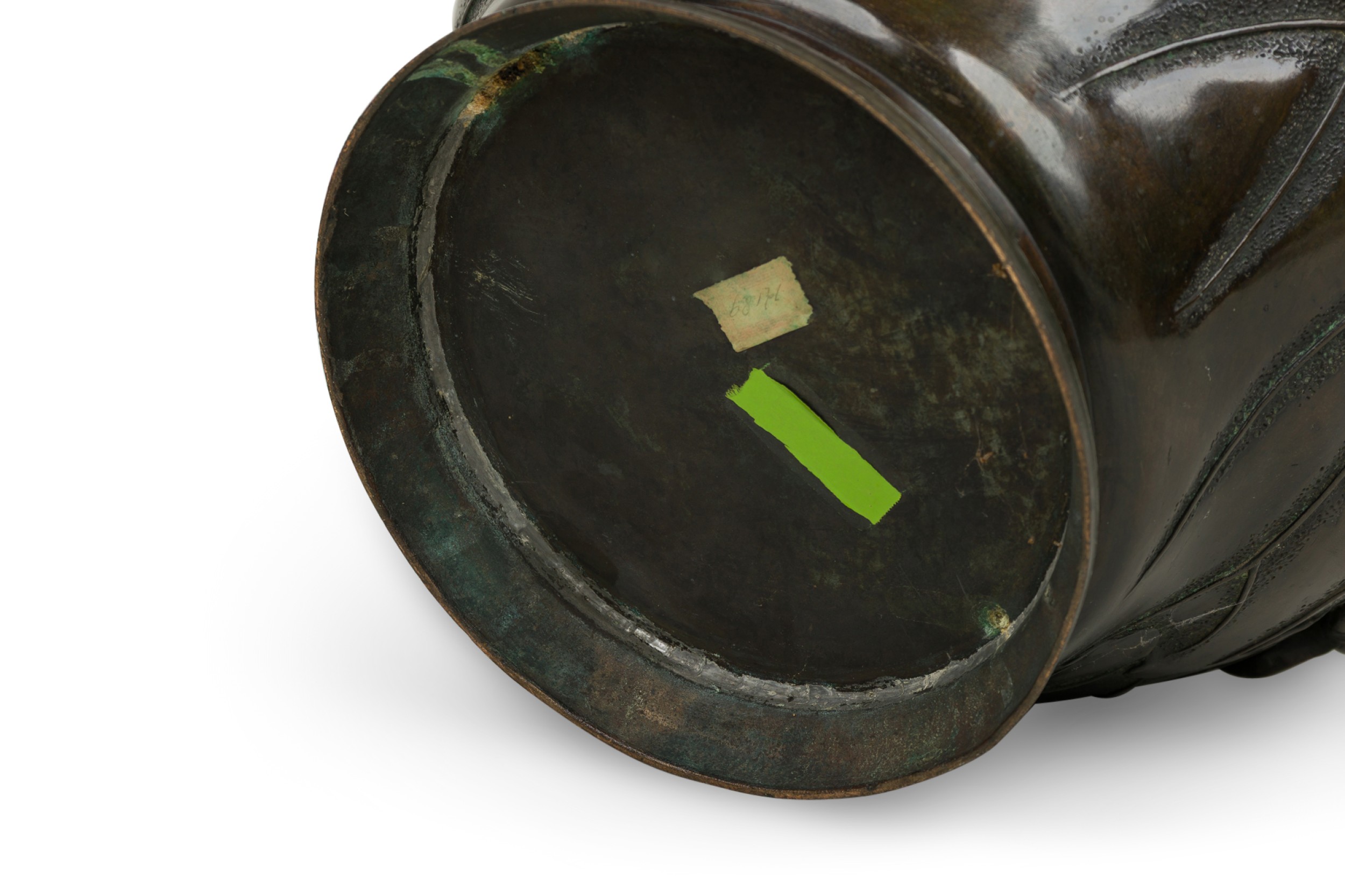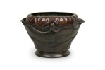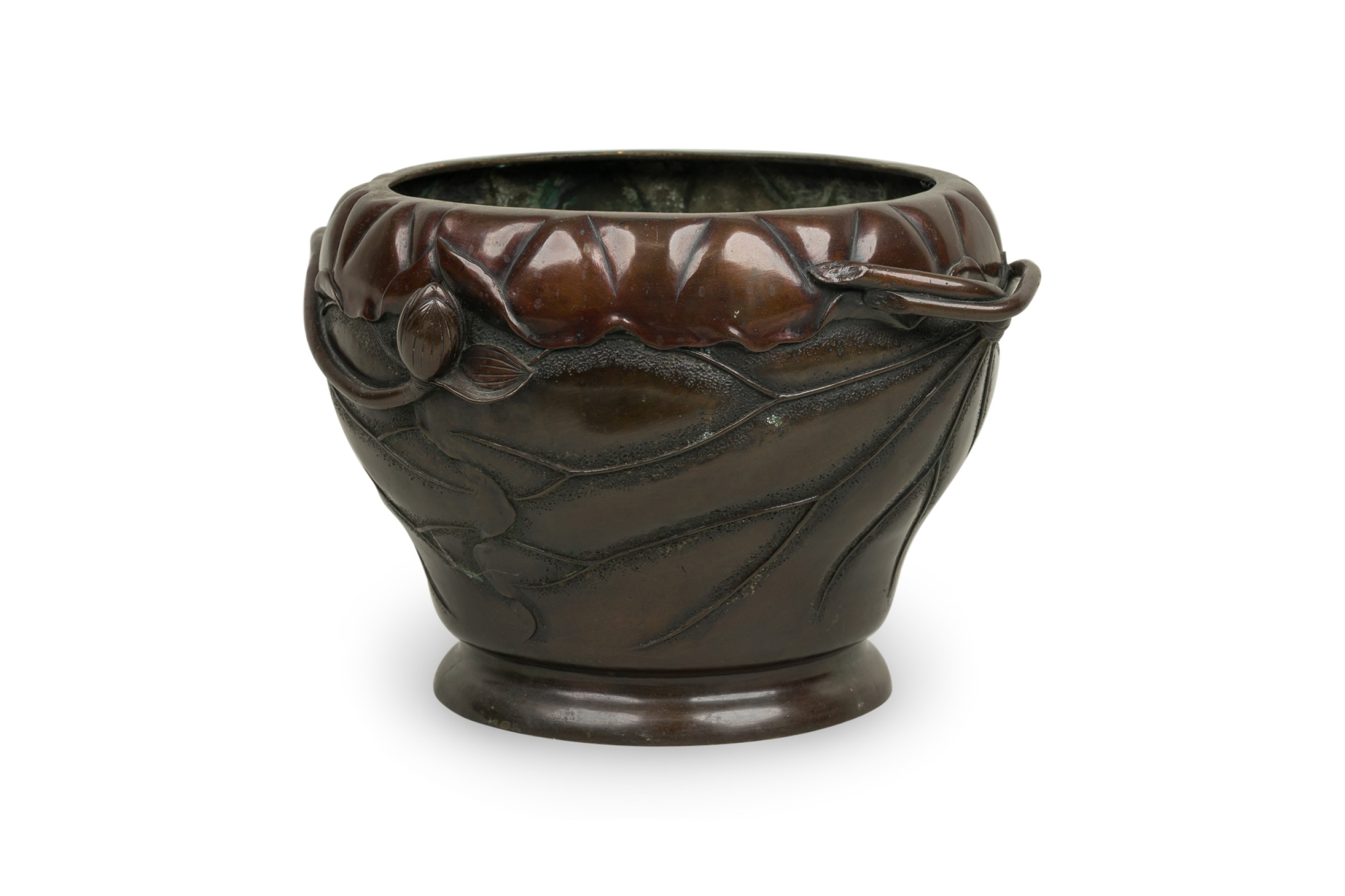 Japanese (19th Century) round shaped bronze jardiniere with bamboo and floral relief having open floral handles on a subtly raised round base