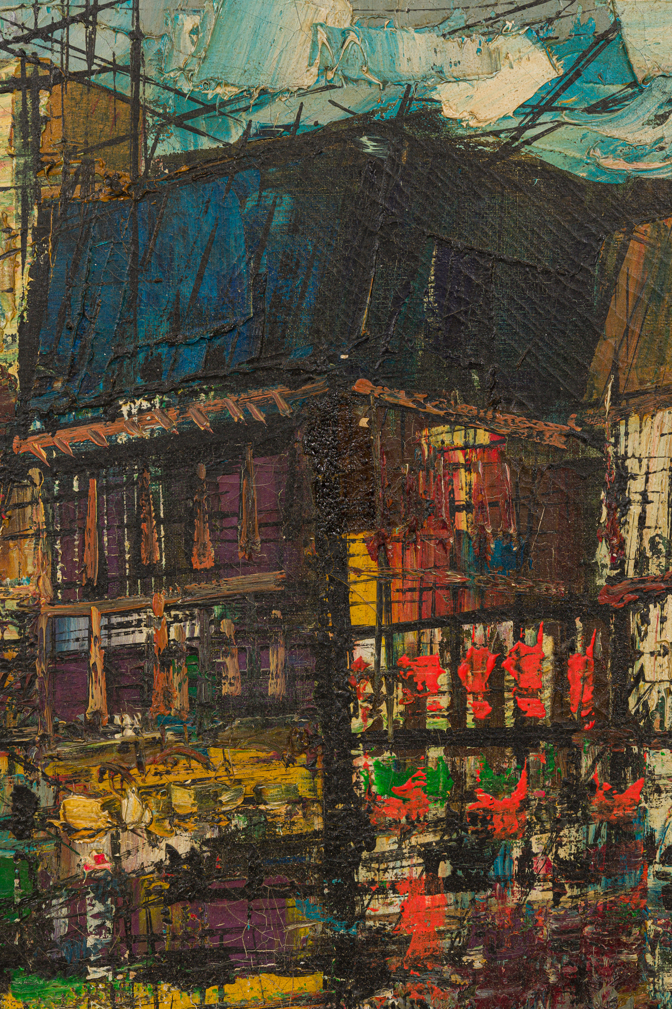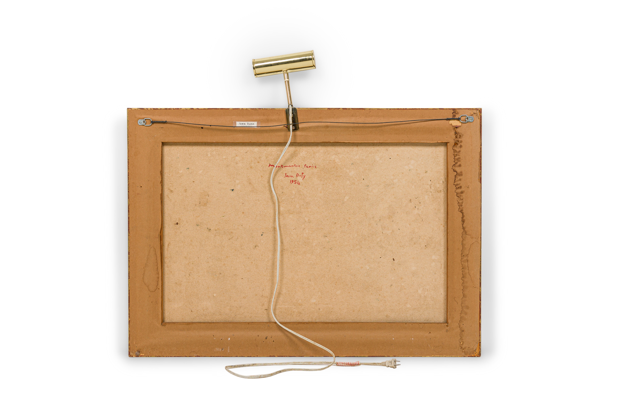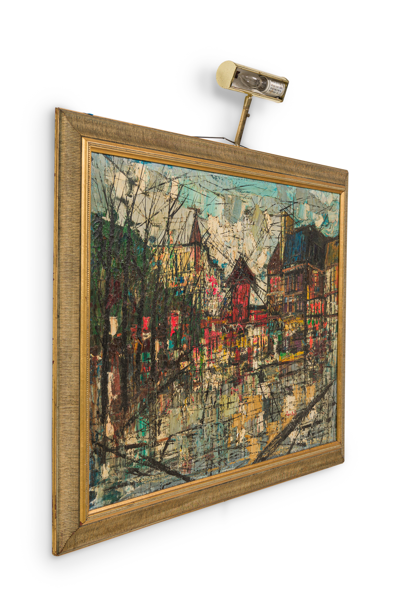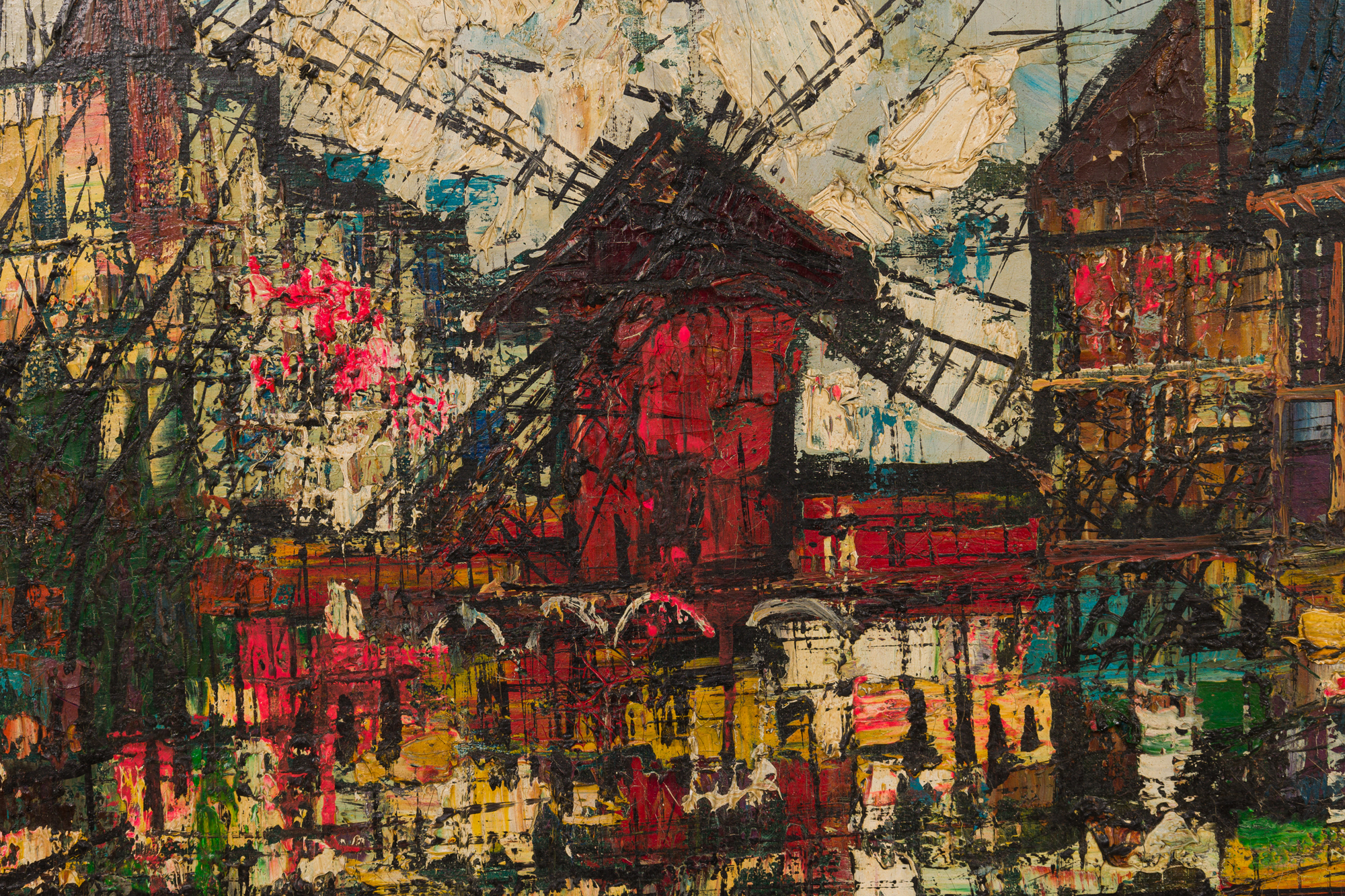 French Mid-Century framed oil on canvas cityscape scene with a centered red building having a windmill surrounded with other buildings. Titled: Montmartre, Paris 1956 (signed: JEAN DUFY)
