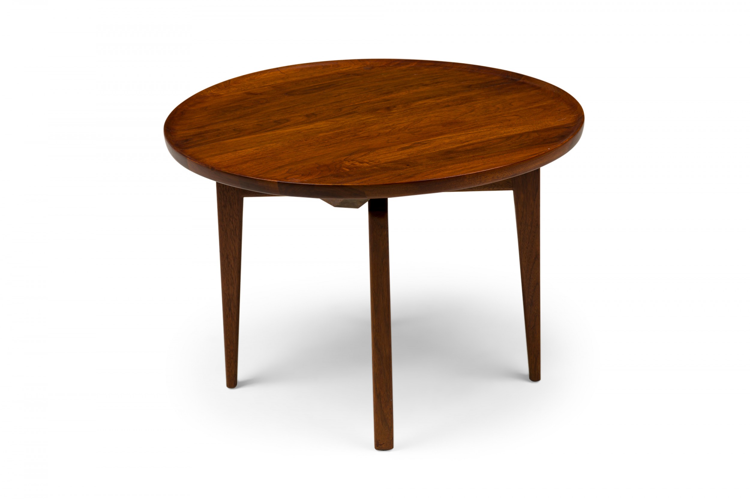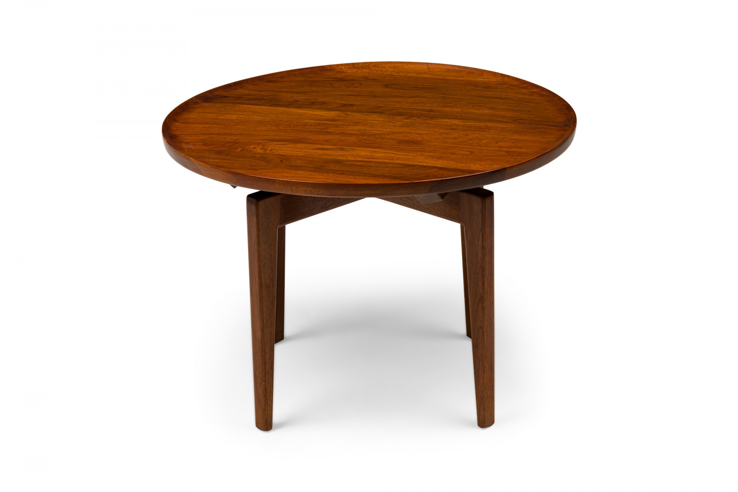 Danish Mid-Century end / side table with a revolving circular wooden top with a shallow lip, resting on four square tapered wooden legs. (JENS RISOM)