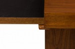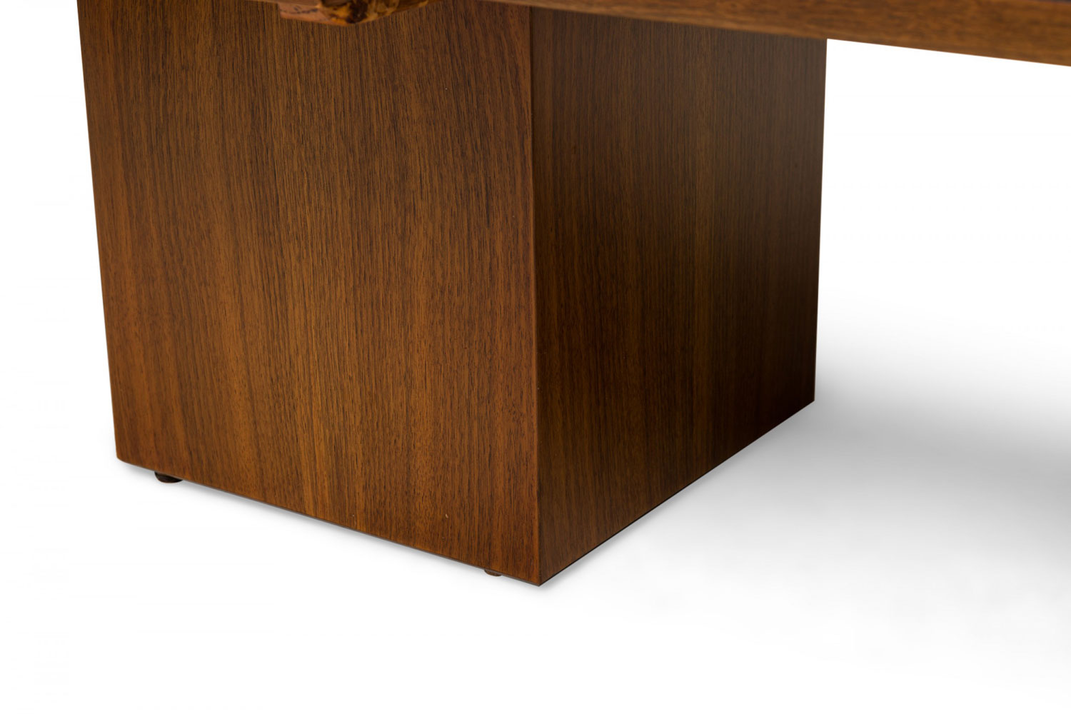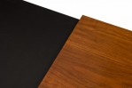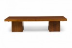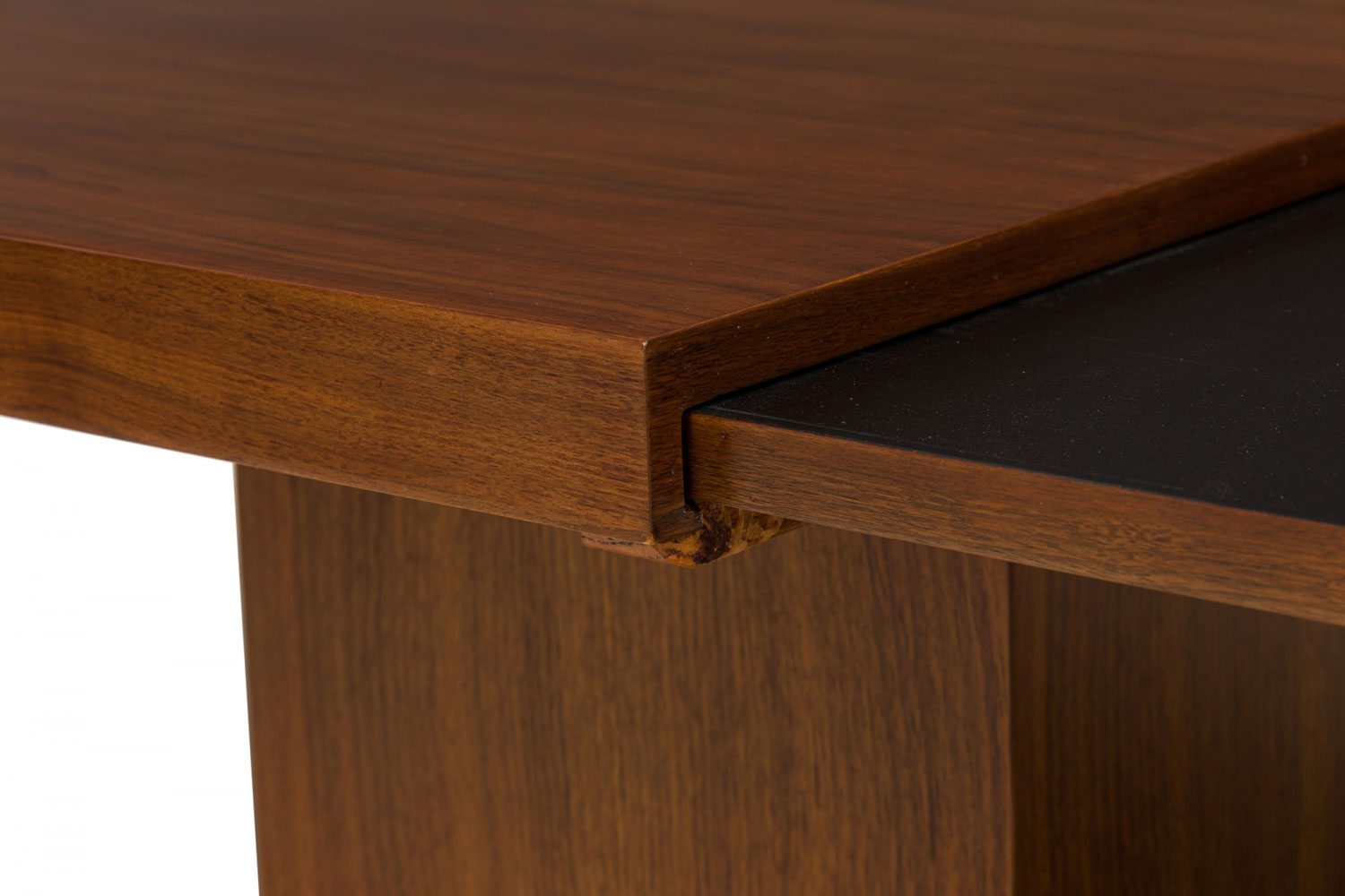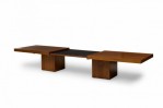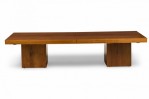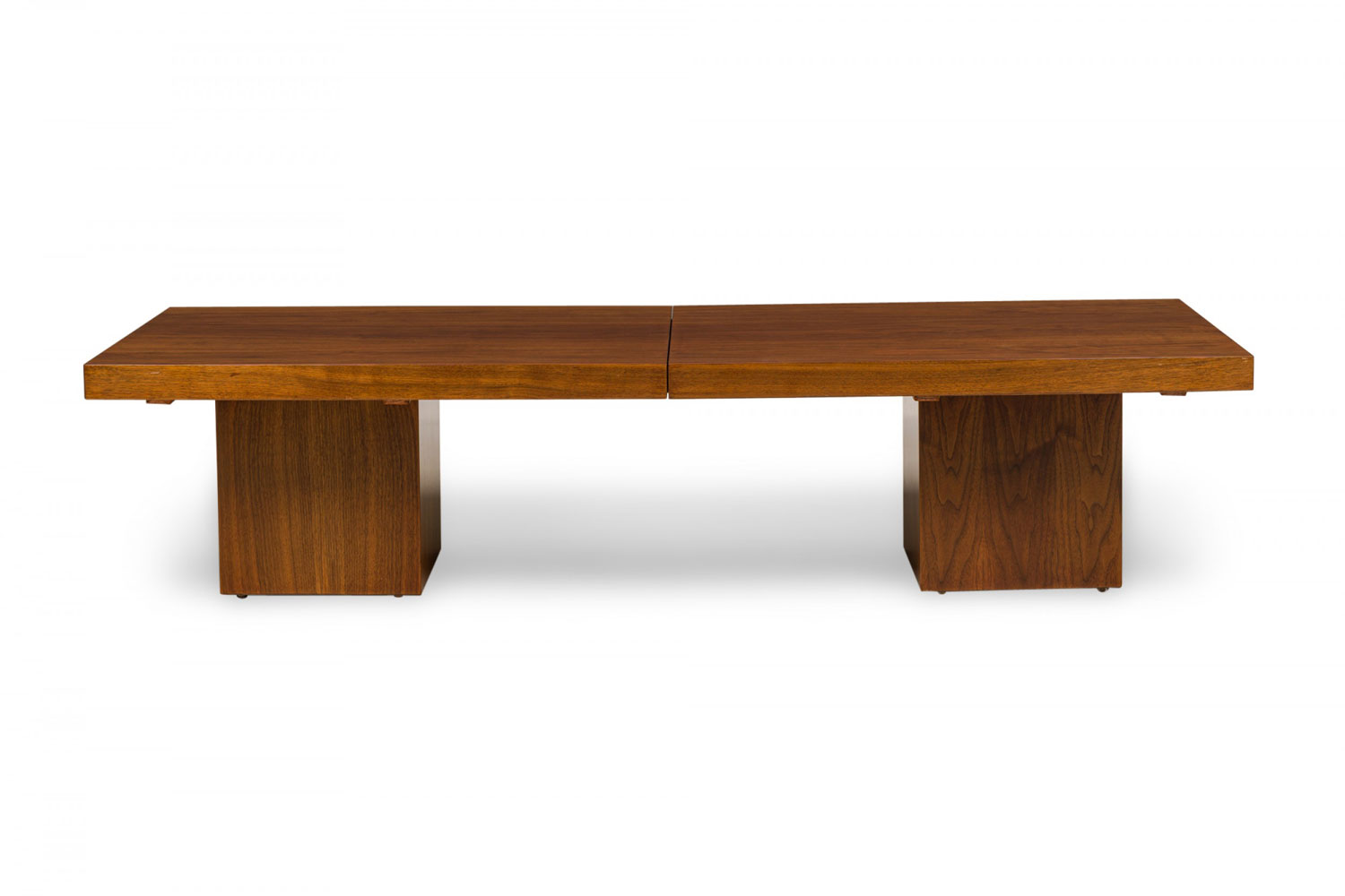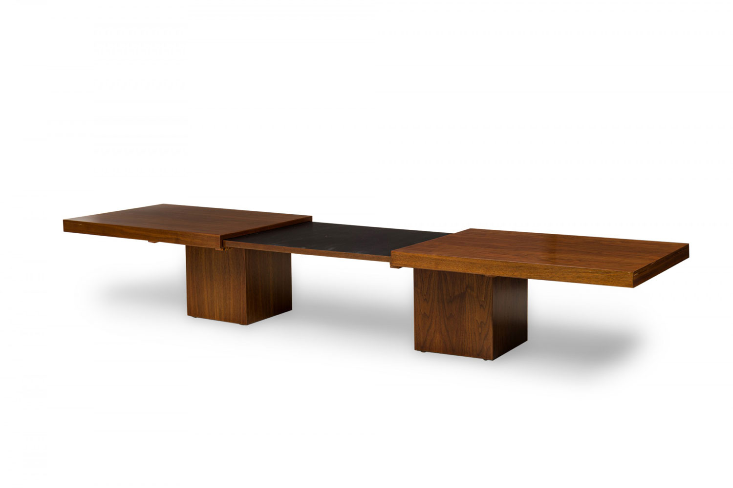 Mid-Century American wooden coffee table with a smooth veneer in rectangular expandable form revealing a black formica topped center, sitting on two square block supports. (JOHN KEAL FOR BROWN SALTMAN)
