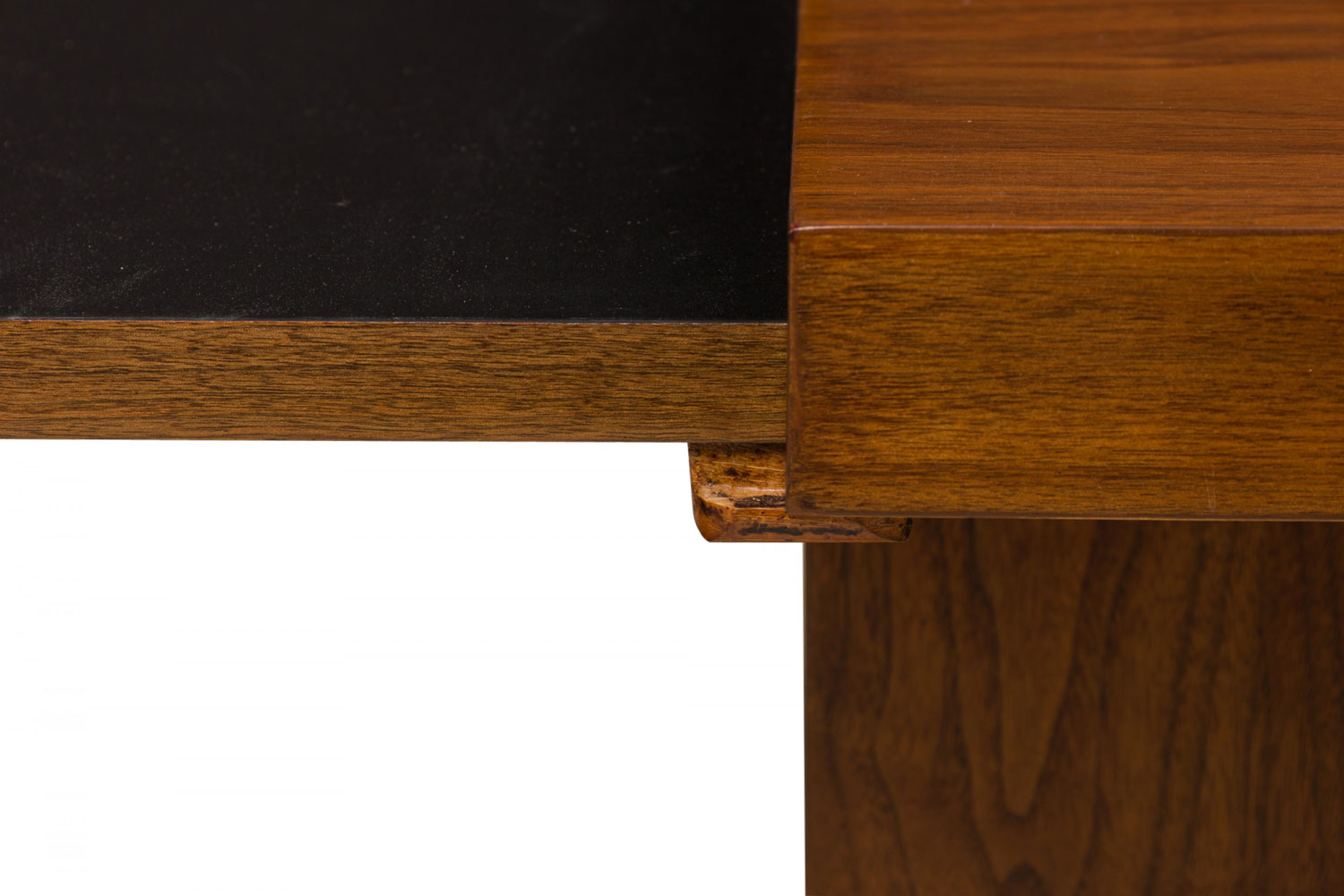 Mid-Century American wooden coffee table with a smooth veneer in rectangular expandable form revealing a black formica topped center, sitting on two square block supports. (JOHN KEAL FOR BROWN SALTMAN).