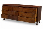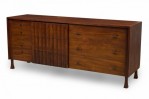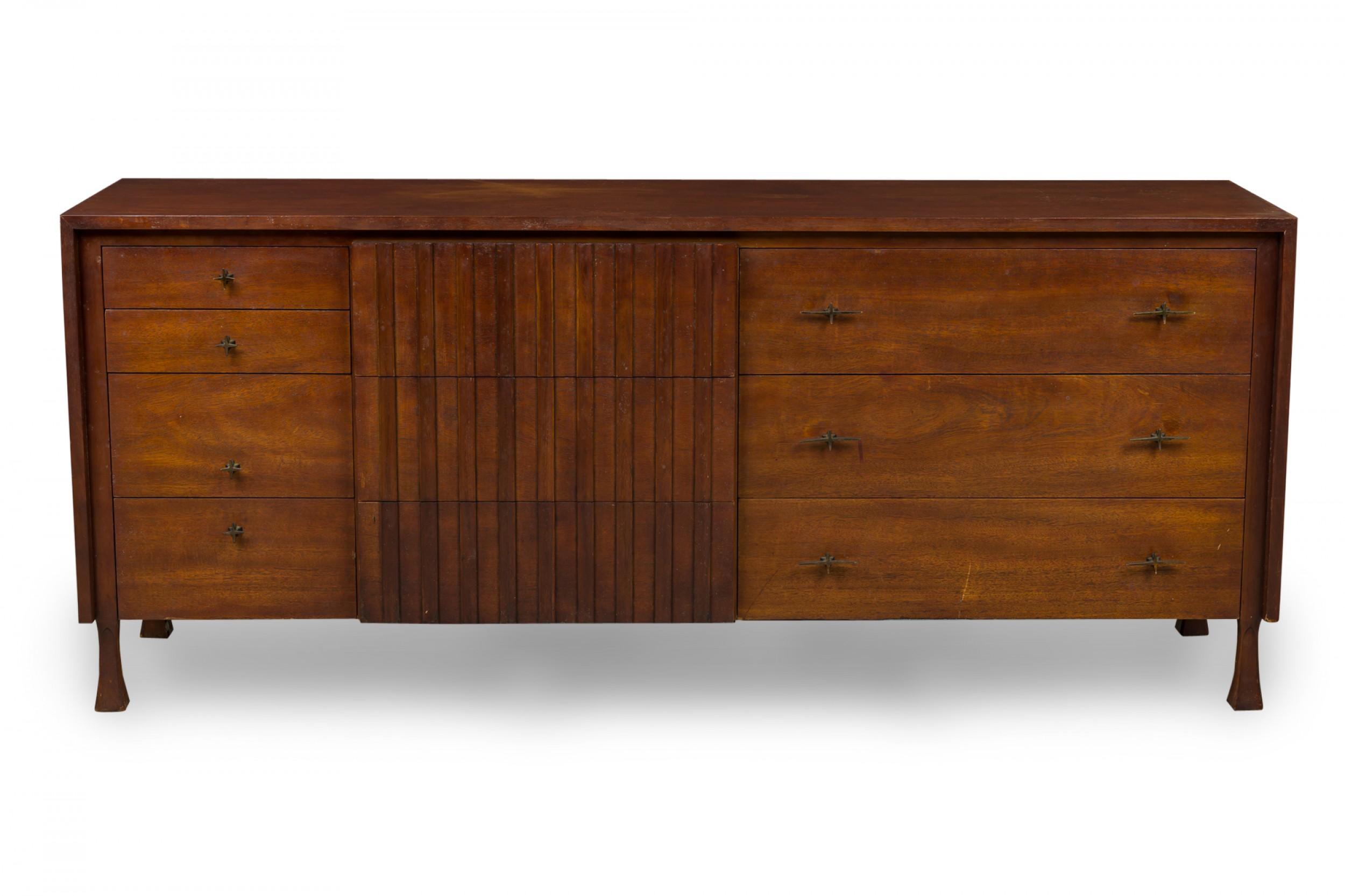Mid-Century American Modern walnut dresser with three compartment sections, including four drawers to the far left with x-shaped bronze drawer pulls, three central drawers with decorative vertical slat fronts, and three wider drawers to the right with elongated x-shaped bronze drawer pulls, resting on four flared square walnut legs. (JOHN WIDDICOMB)