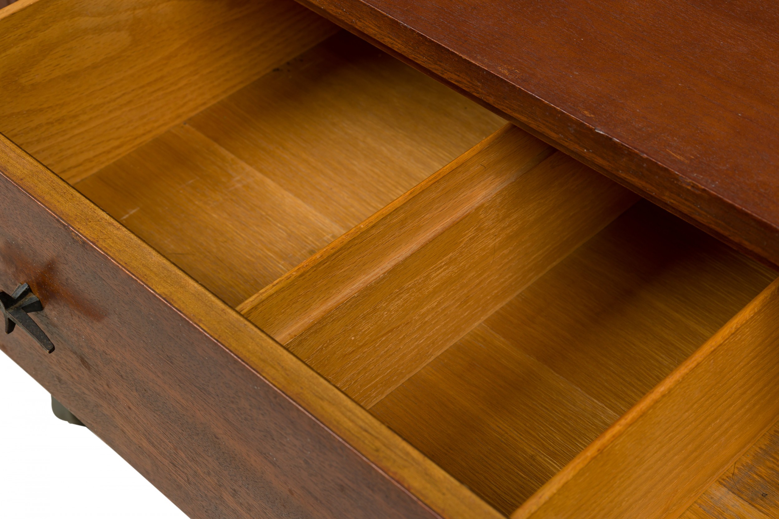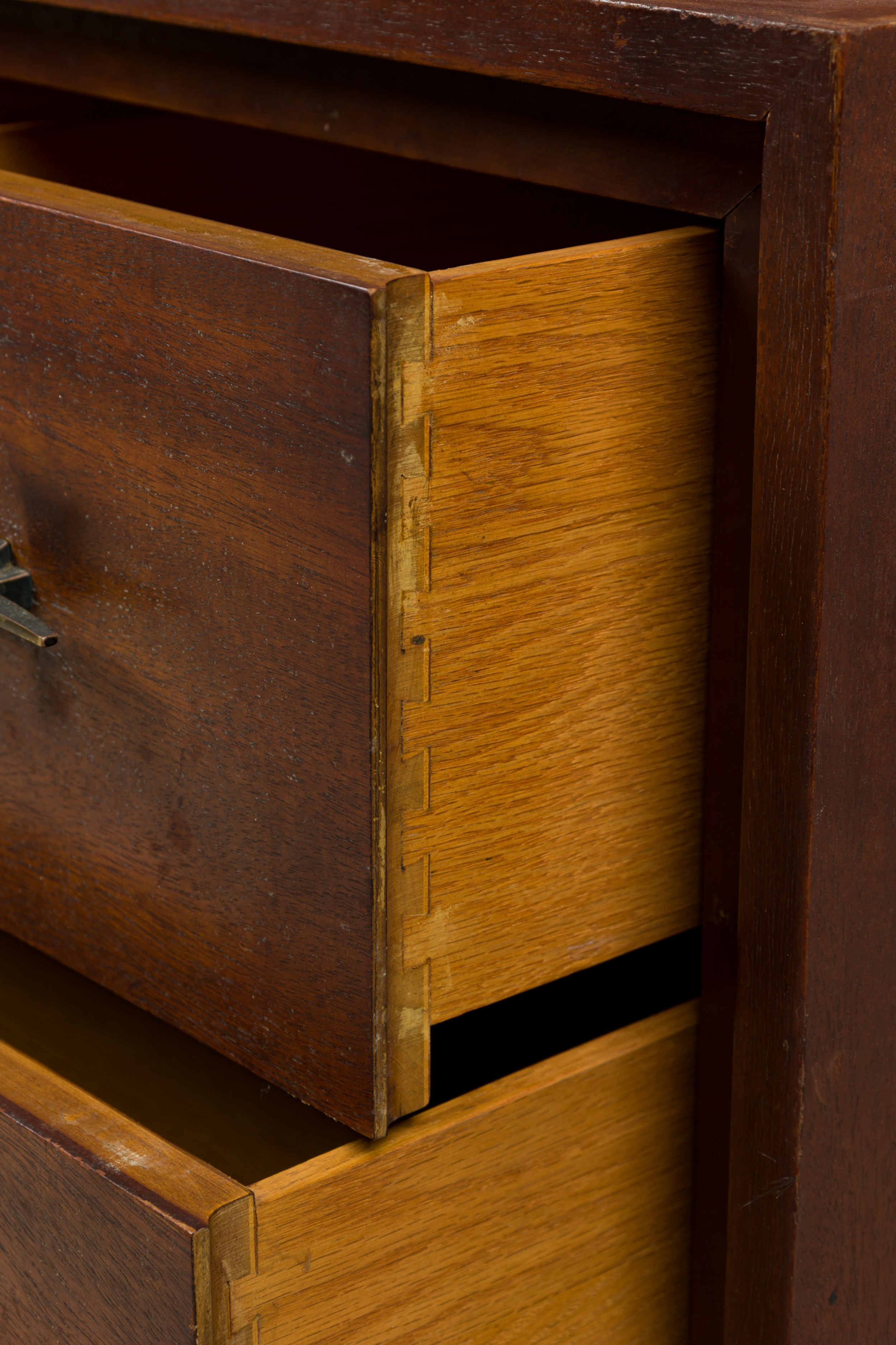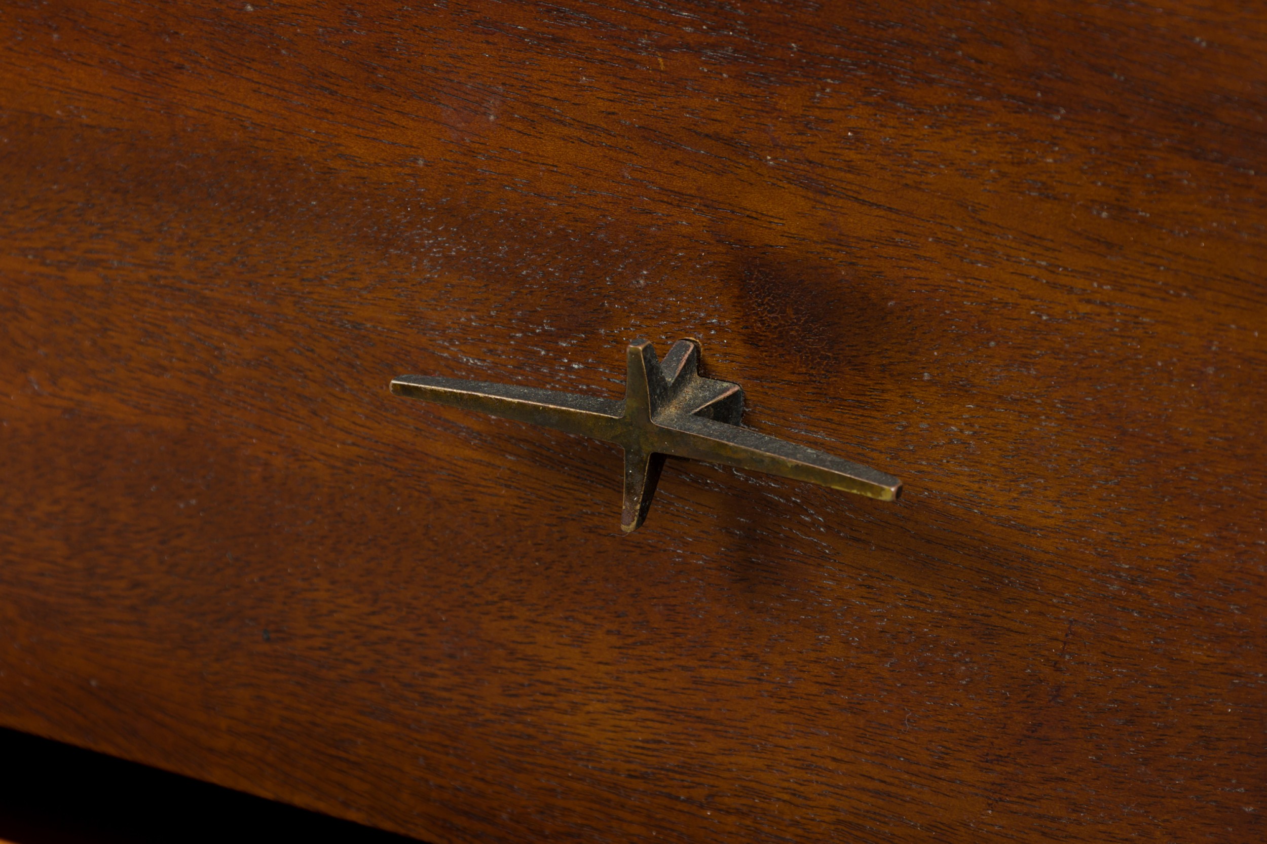 Style: Mid-Century Materials & Techniques: Bronze, metal, walnut, wood Category: Cabinets & Case Goods, Bedroom Condition: Some wear to finish Good; Wear consistent with age and use