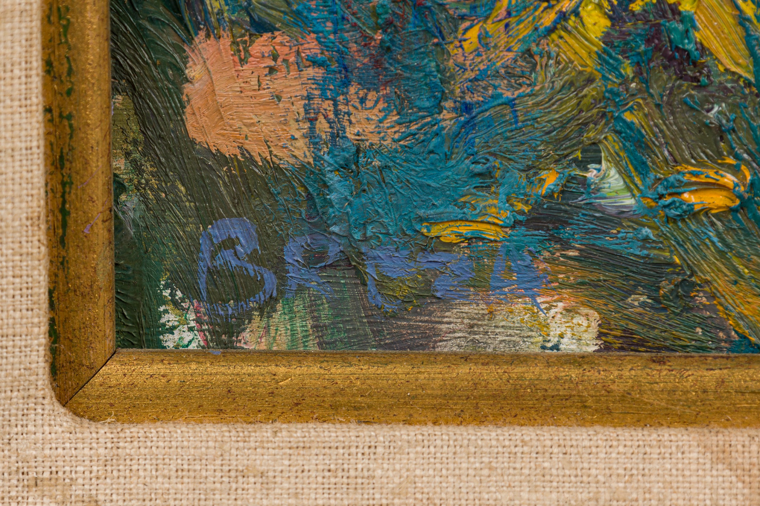 American Contemporary Impressionistic painting oil on board of a floral landscape in a gilded frame with a linen mat (JOSEPH BREZA) Joseph Breza (American, 20th Century), American Southwest Landscape, thick impasto on artist board, signed lower right, gallery label verso, matted and framed, 10.5"h x 13.5"w (sight), 20"h x 22"w (frame).