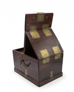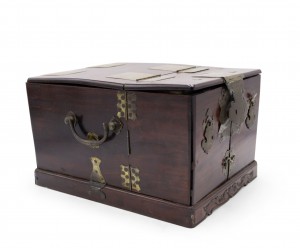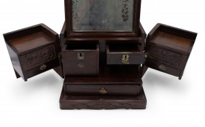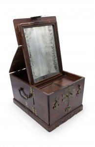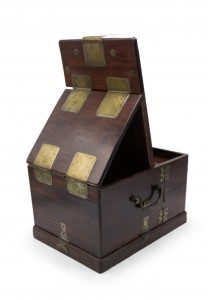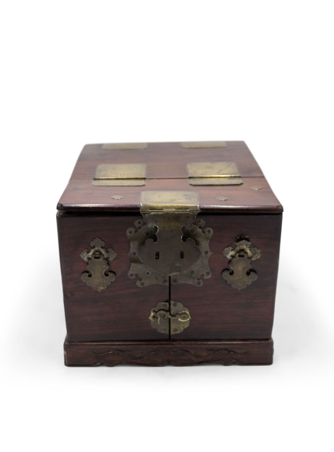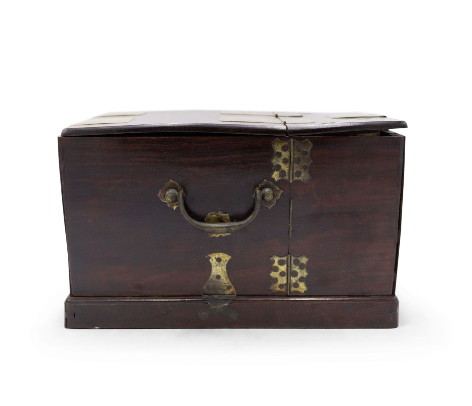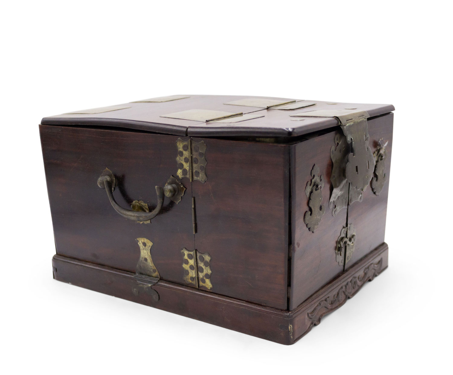 Asian Korean (19th Century) campaign style rosewood box with brass trim and interior cabinet with a mirror top and drawers with folding side sections