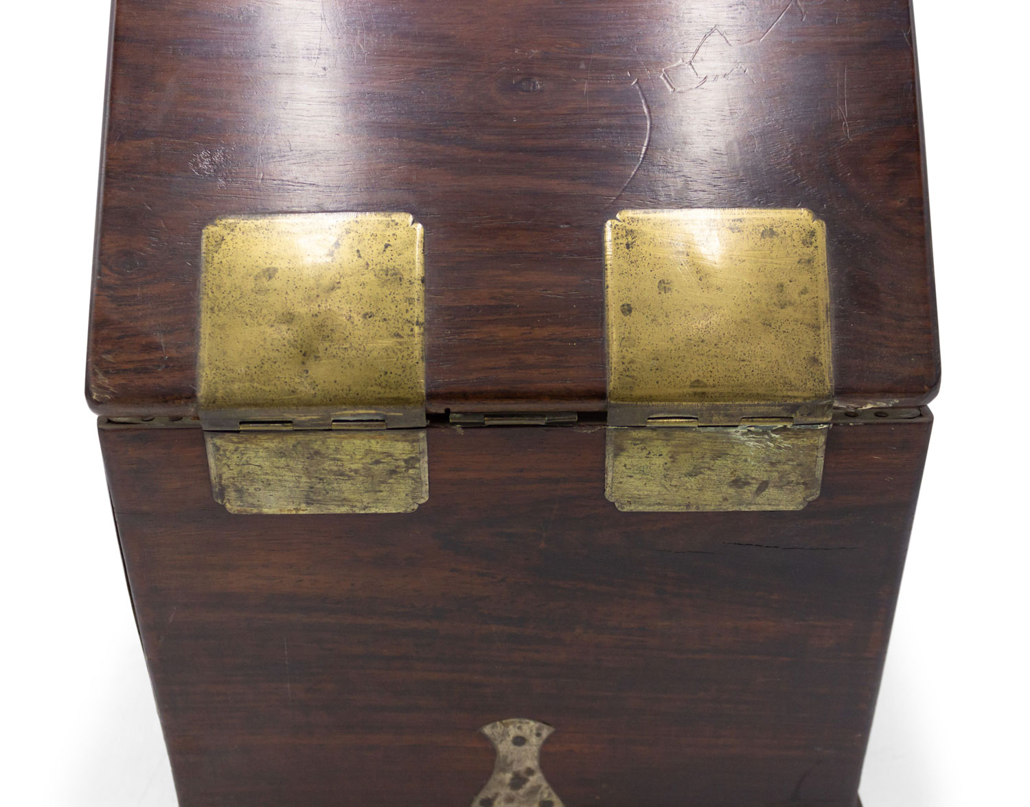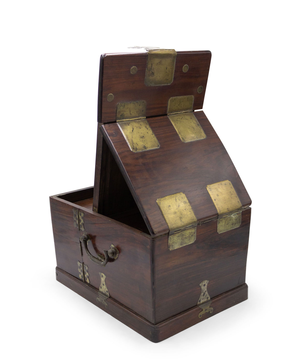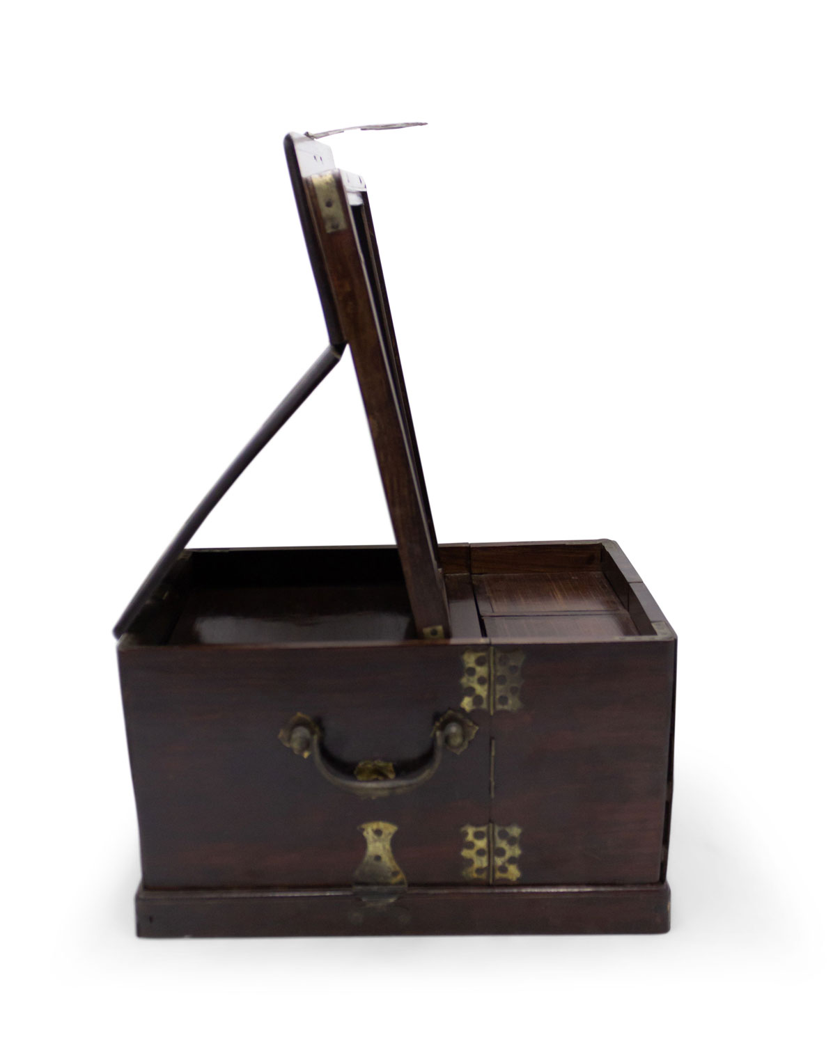 Asian Korean (19th Century) campaign style rosewood box with brass trim and interior cabinet with a mirror top and drawers with folding side sections.