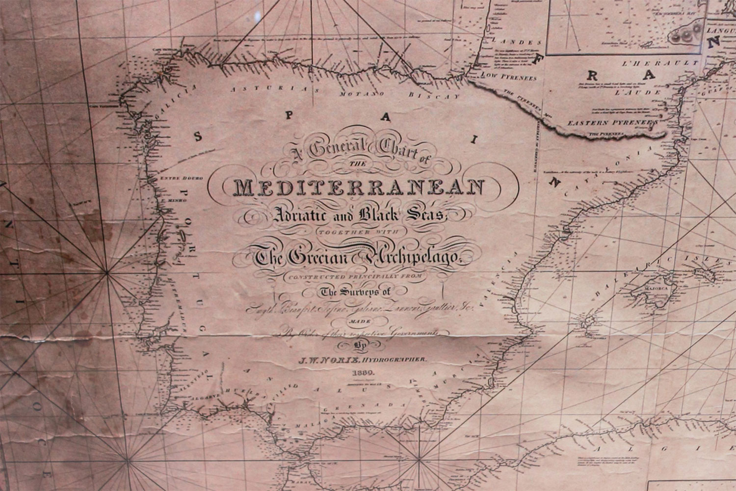 Large map/chart chart of The Mediterranean and the Grecian Archipelago showing Italy, Sardinia, Corsica, part of France, etc. in a black frame