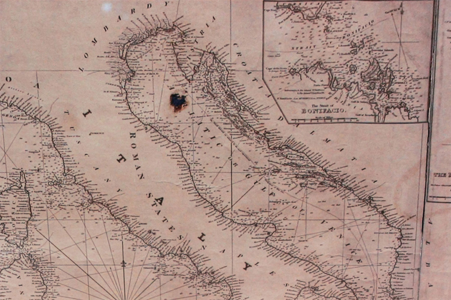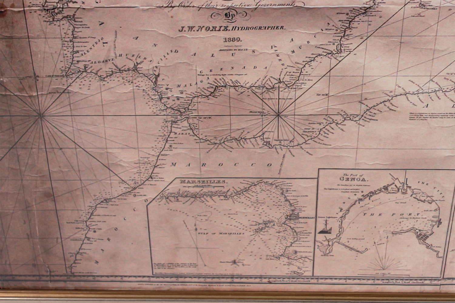Large map/chart chart of The Mediterranean and the Grecian Archipelago showing Italy, Sardinia, Corsica, part of France, etc. in a black frame.