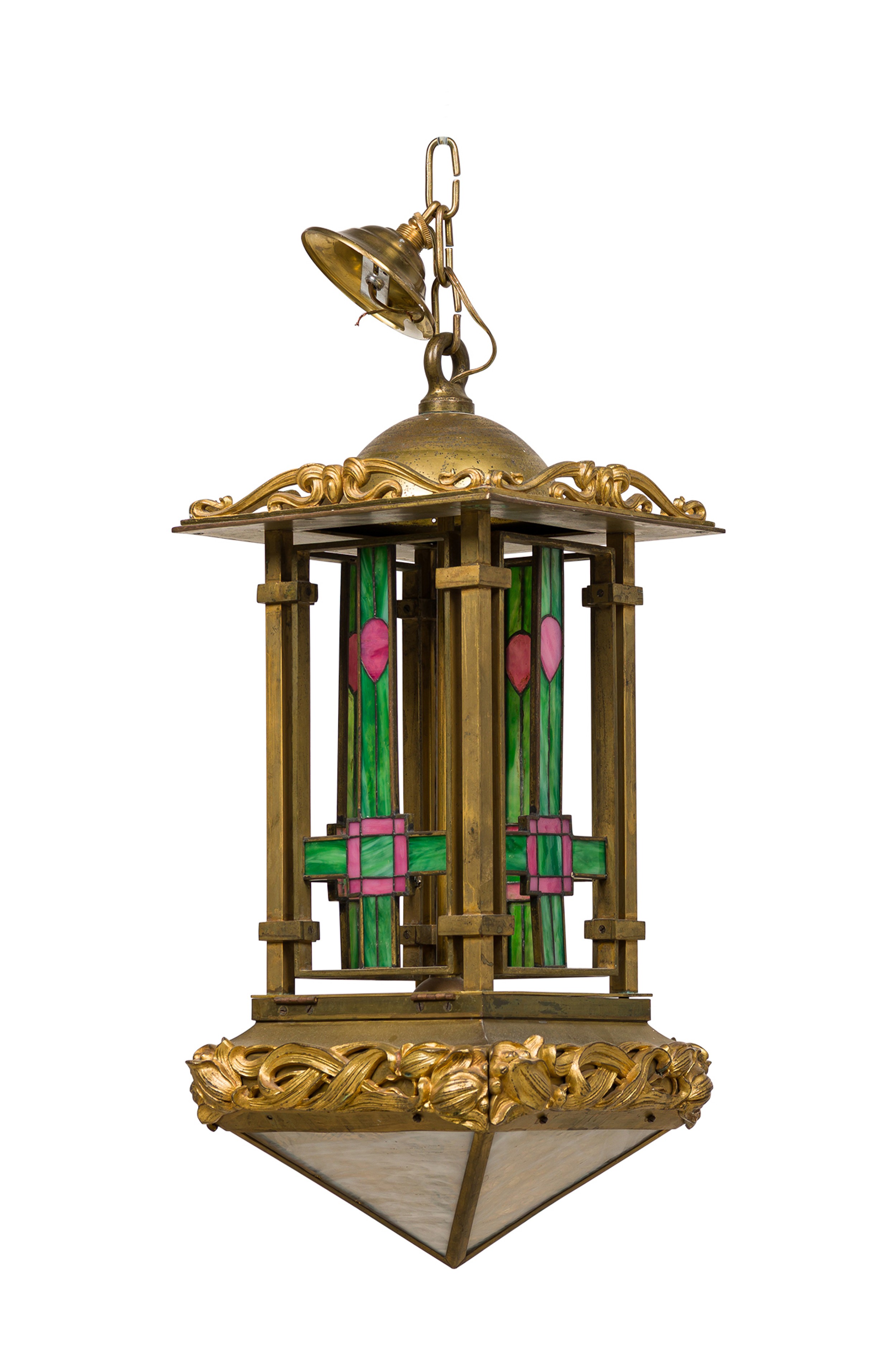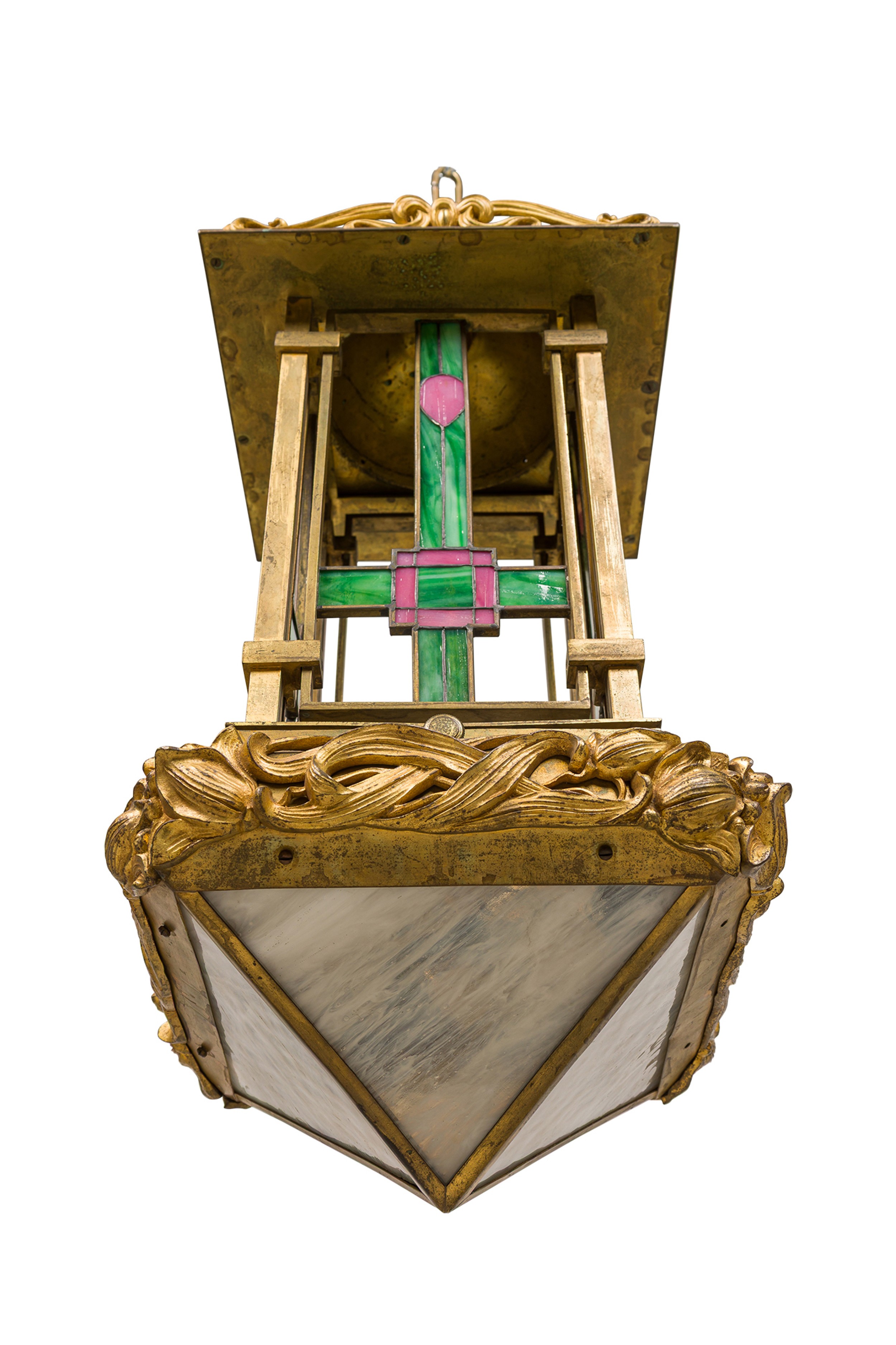 French Art Nouveau bronze dore lantern with leaded colored glass panels and floral trim