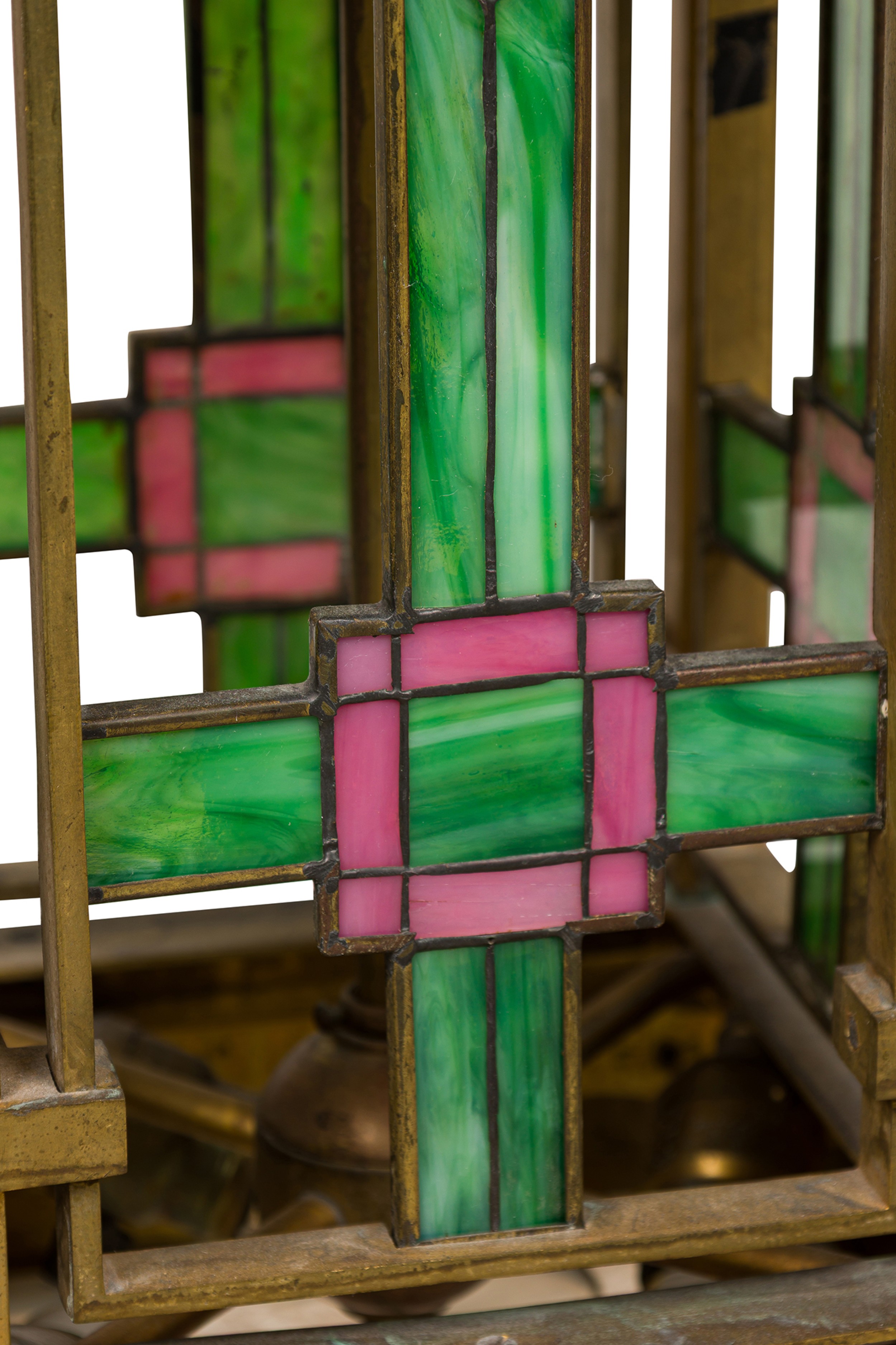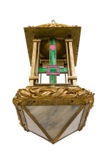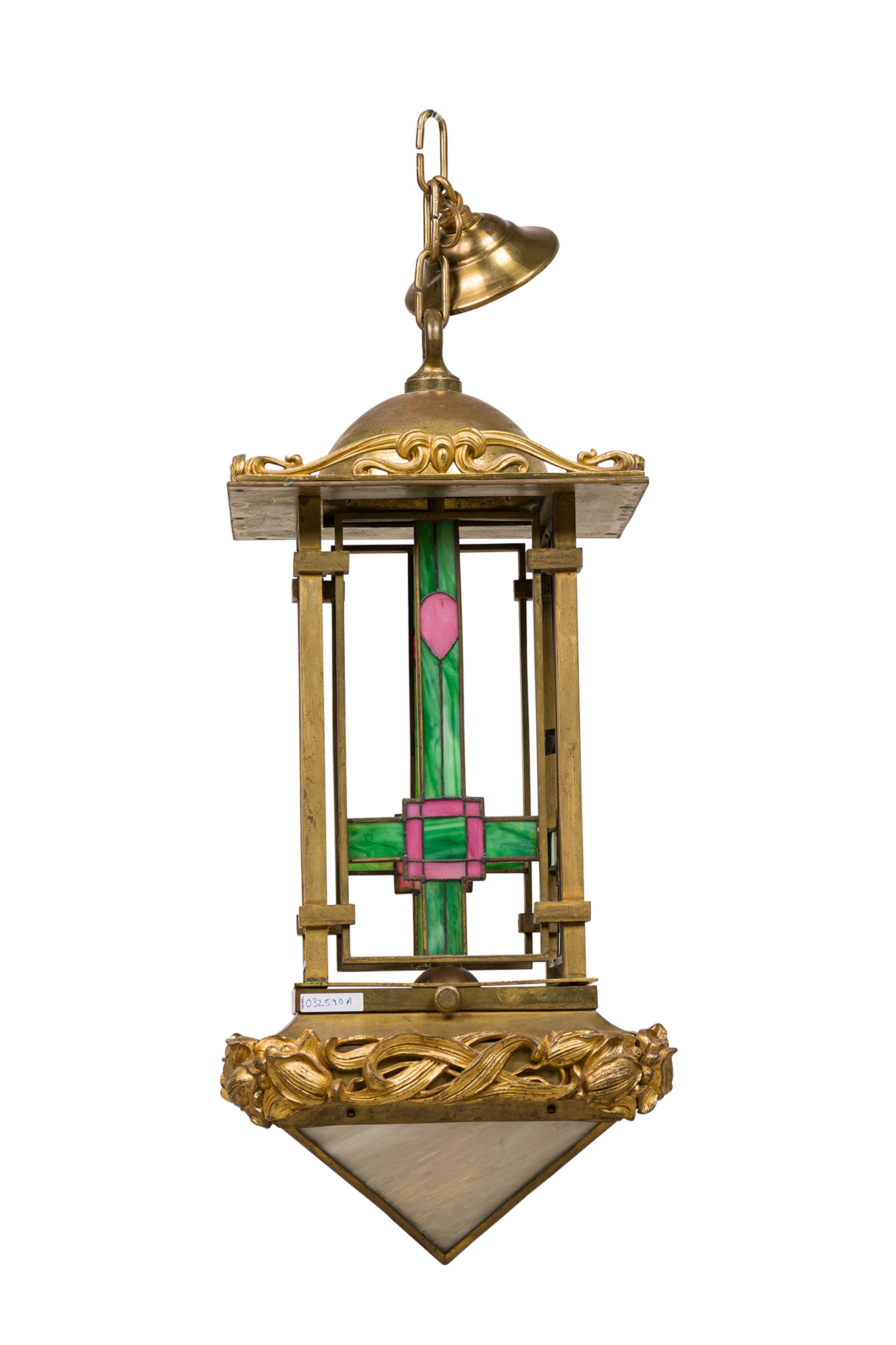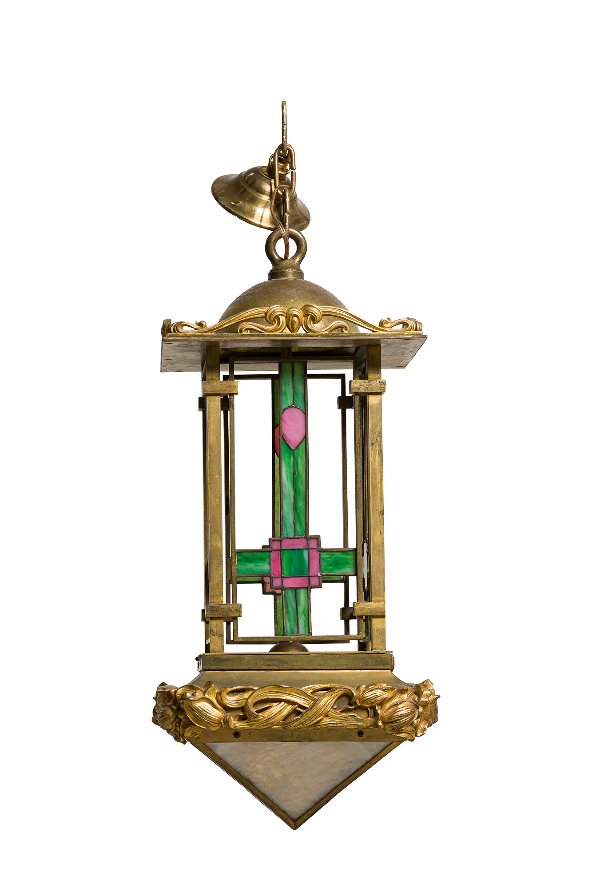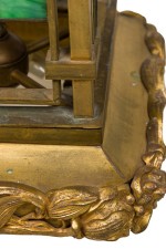 French Art Nouveau bronze dore lantern with leaded colored glass