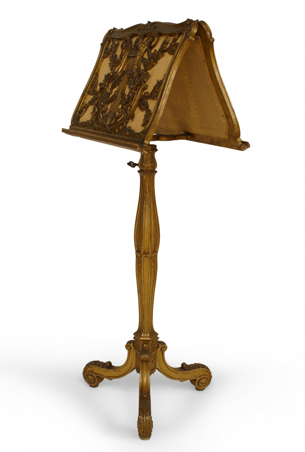 French Louis XV style (19th Century) gilt carved adjustable pedestal base double sided (duet) music stand with lyre design.