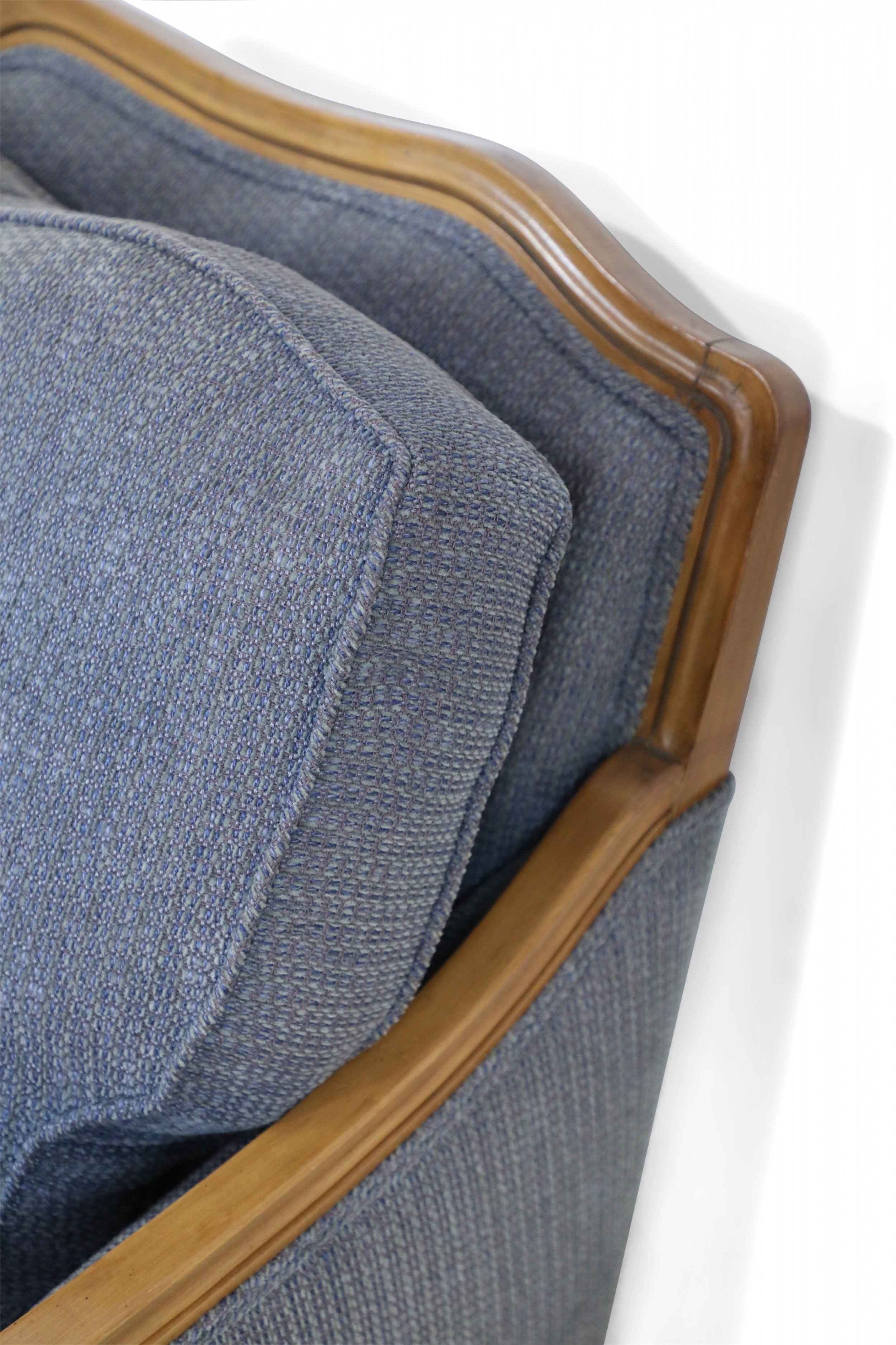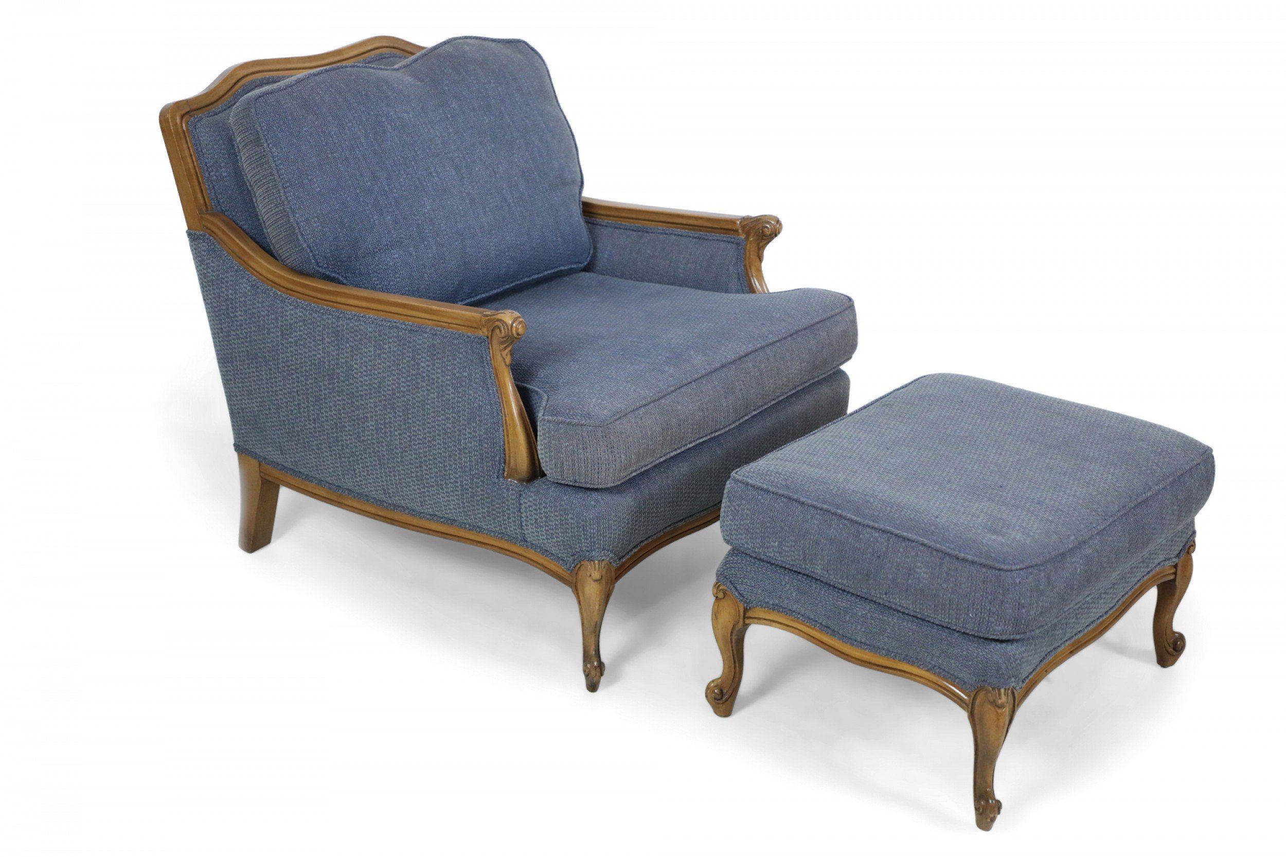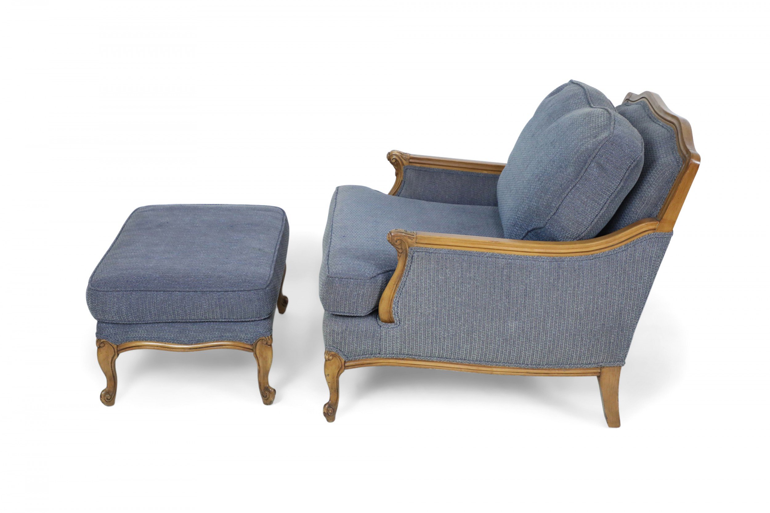 French Louis XV-style (20th Century) bergere and ottoman with carved walnut frames, cabriole legs and navy blue upholstery with seat and back cushion. (PRICED AS SET).