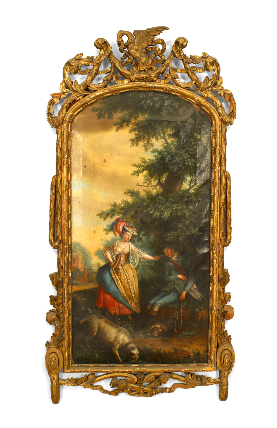 French Louis XVI (18th Cent) oil painting of a scene with a dog and a young lady enticing a young sleeping man with a feather in a gilt carved swag & scroll frame with an eagle. (AS IS)