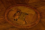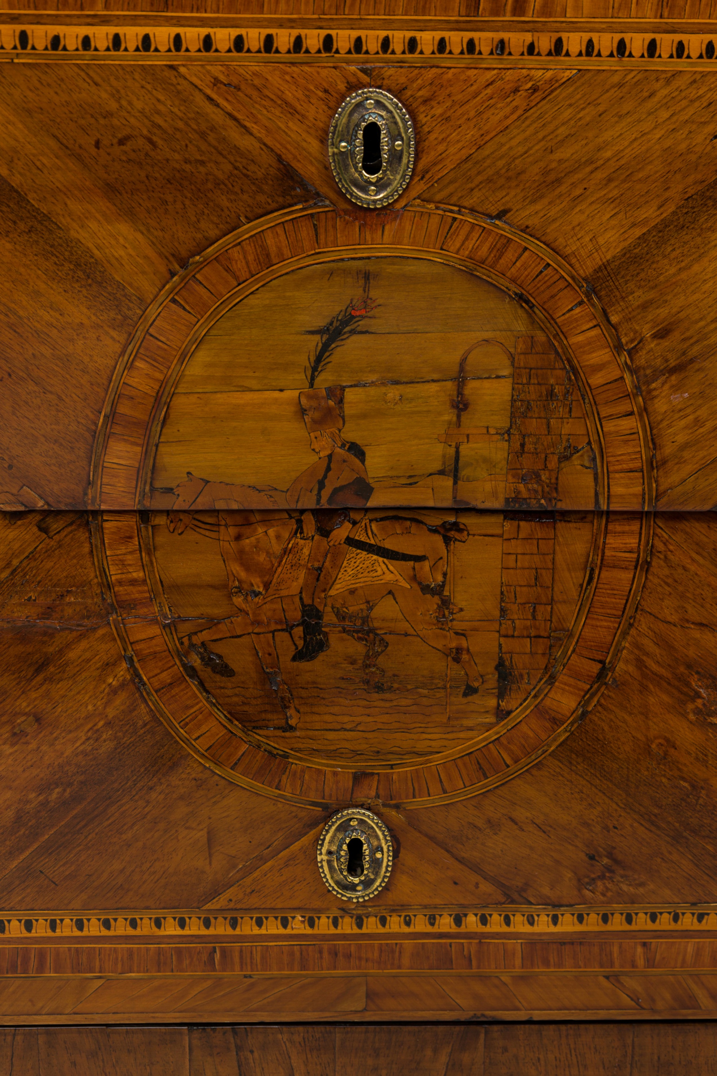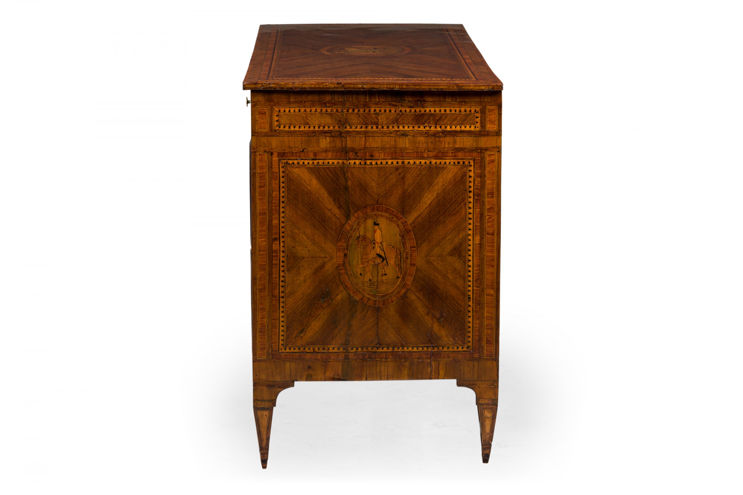 Italian Neo-Classical (18th Century) commode cabinet with 3 pullout drawers featuring brass ring escutcheons, 2 keyholes on the bottom drawer having marquetry overall inlaid with exotic woods with a centered oval figural soldier theme depicted on the top and sides. (att: GIUSEPPE MAGGIOLINI)