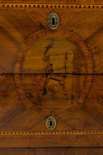 Italian Neo-Classical (18th Century) commode cabinet with 3 pullout drawers featuring brass ring escutcheons, 2 keyholes on the bottom drawer having marquetry overall inlaid with exotic woods with a centered oval figural soldier theme depicted on the top and sides. (att: GIUSEPPE MAGGIOLINI).