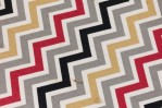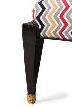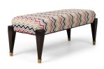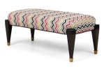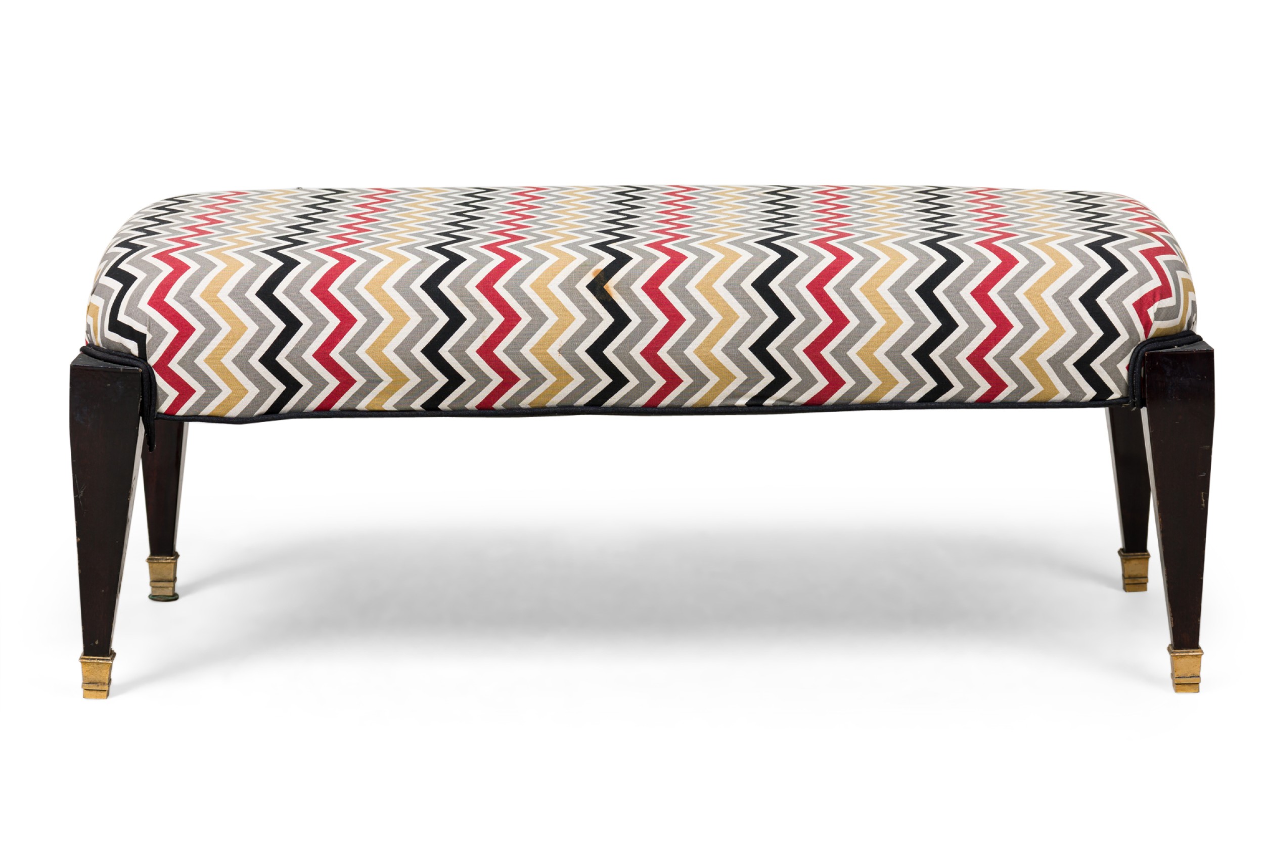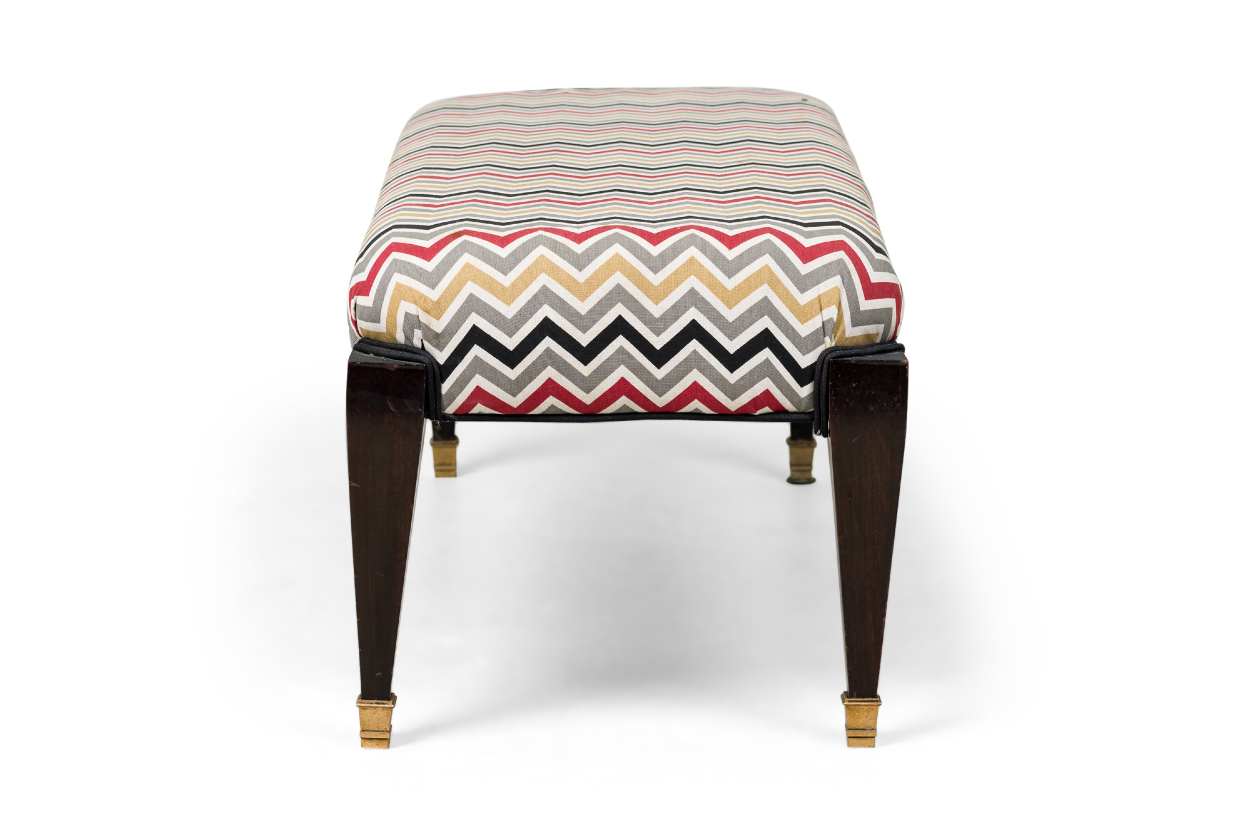 Mid-Century (1940s) French Neo-classic Style ebonized rectangular bench with padded seat upholstered in a multicolor zigzag pattern, resting on 4-sided tapered legs ending in brass sabots. (attributed to MAISON JANSEN)
