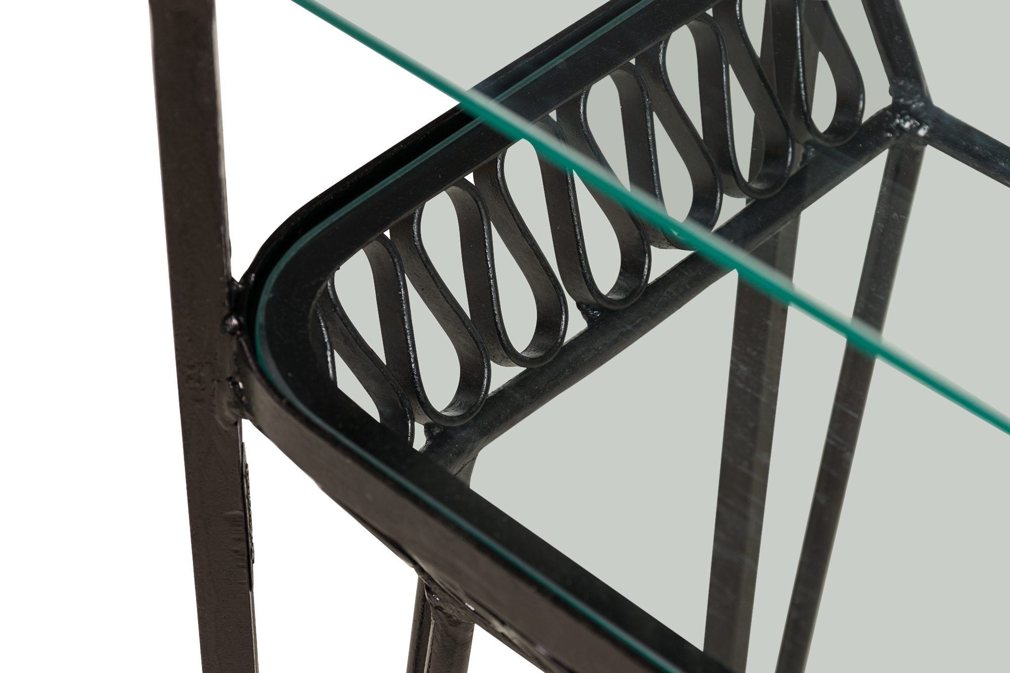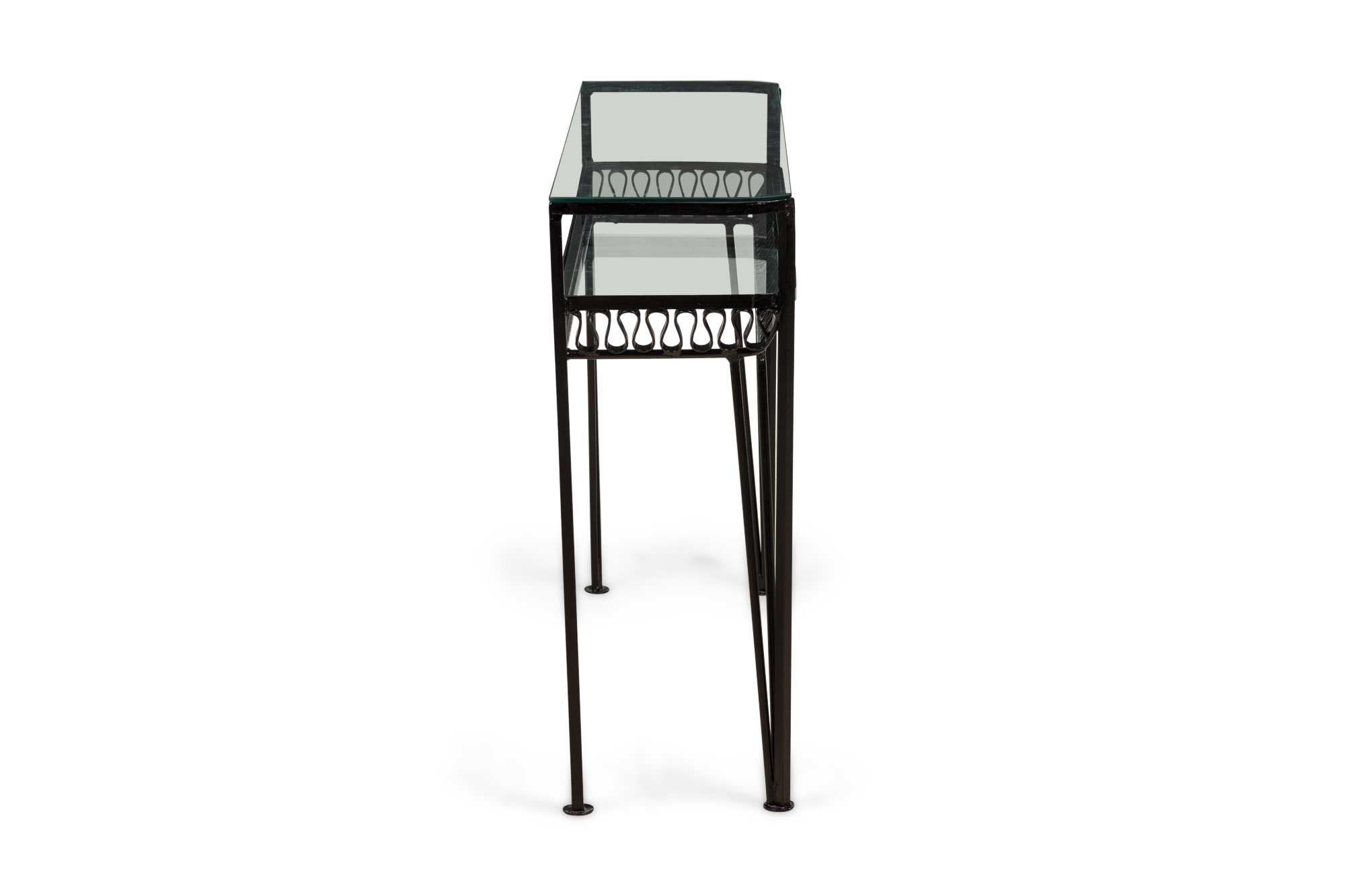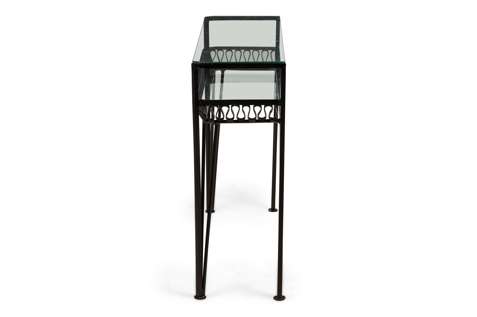 Italian Mid-Century black metal two-tiered console table in rectangular form with a glass top and shelf having a filigree "Ribbon" apron. (MAURIZIO TEMPESTINI FOR JOHN SALTERINI)