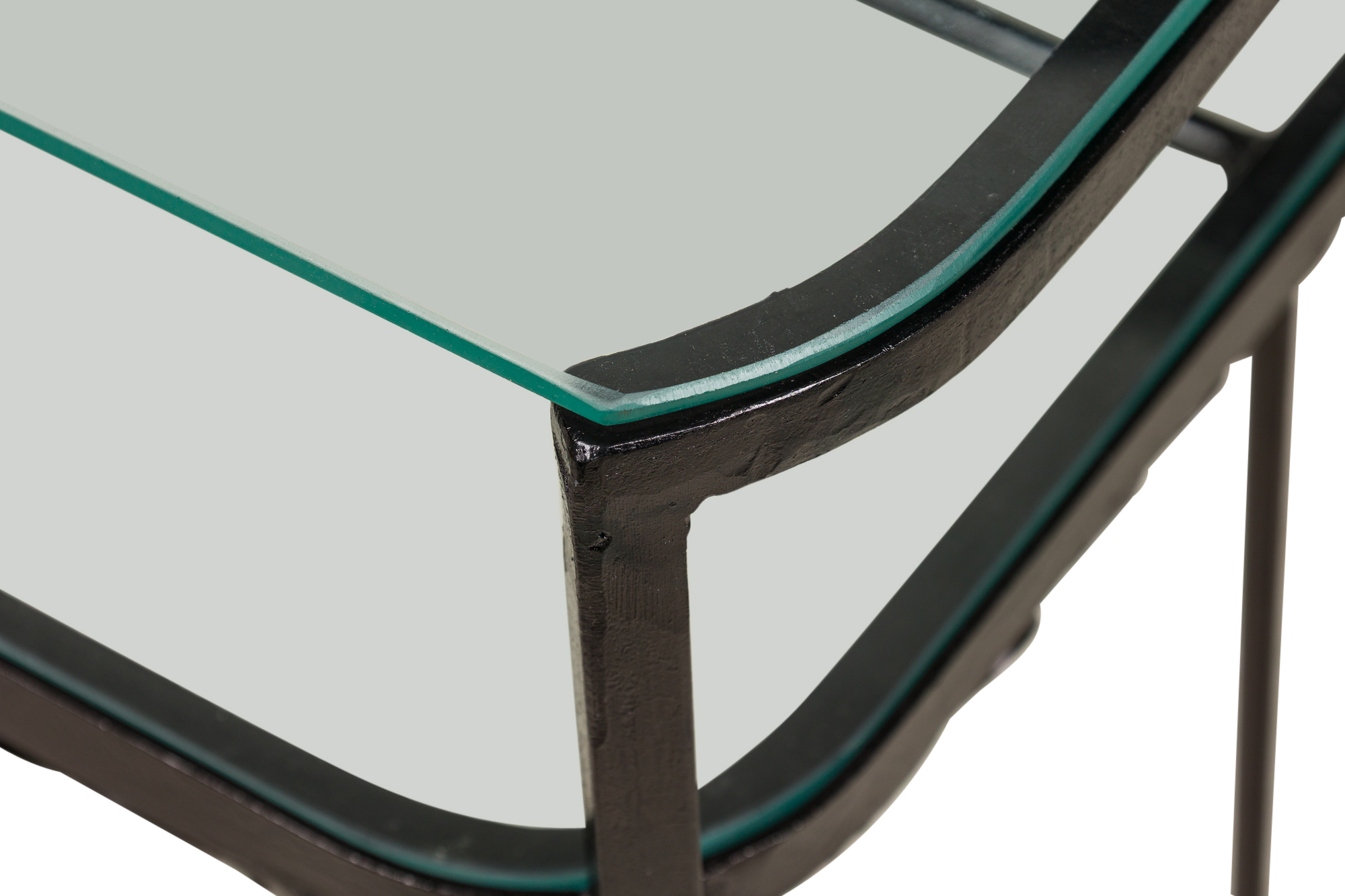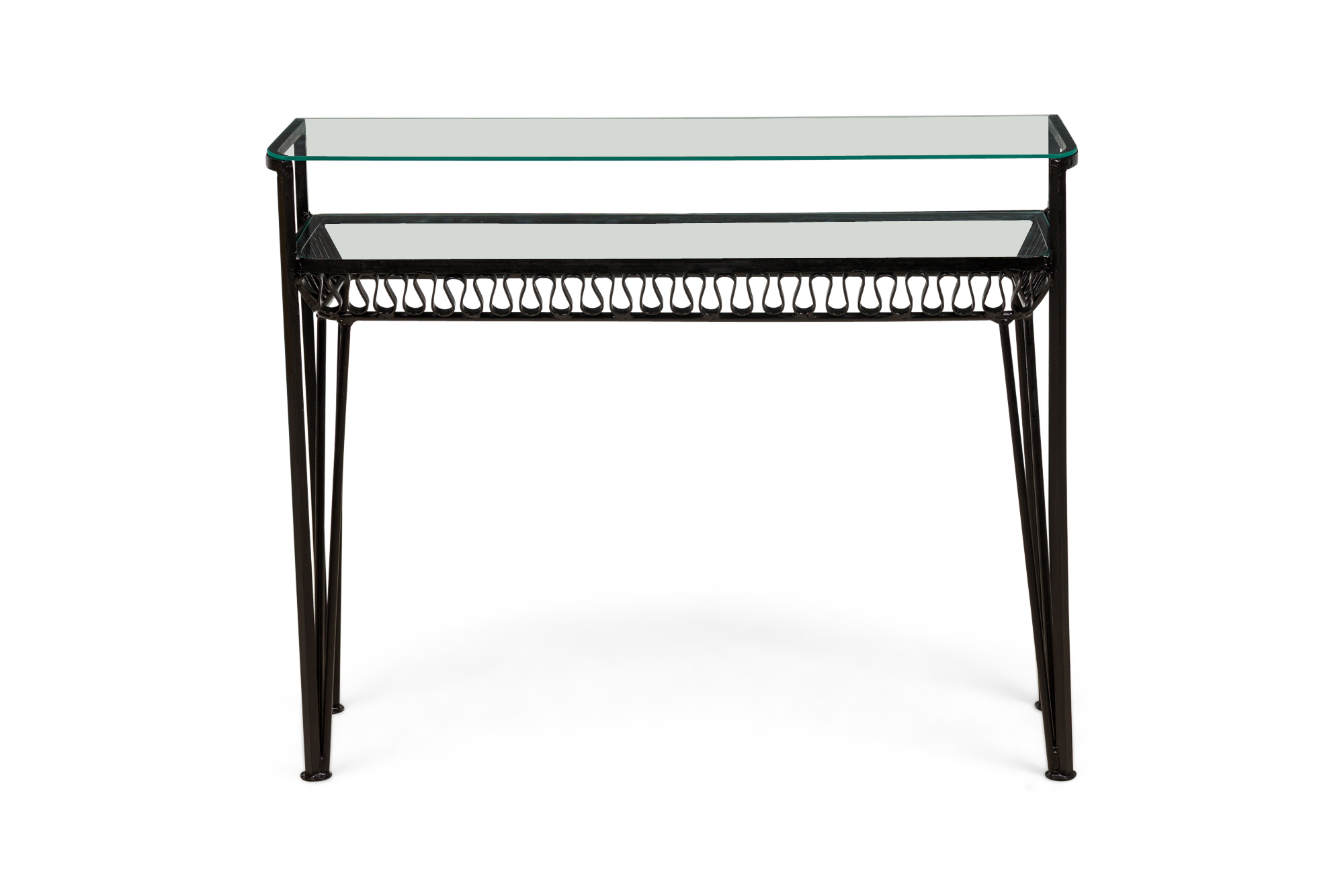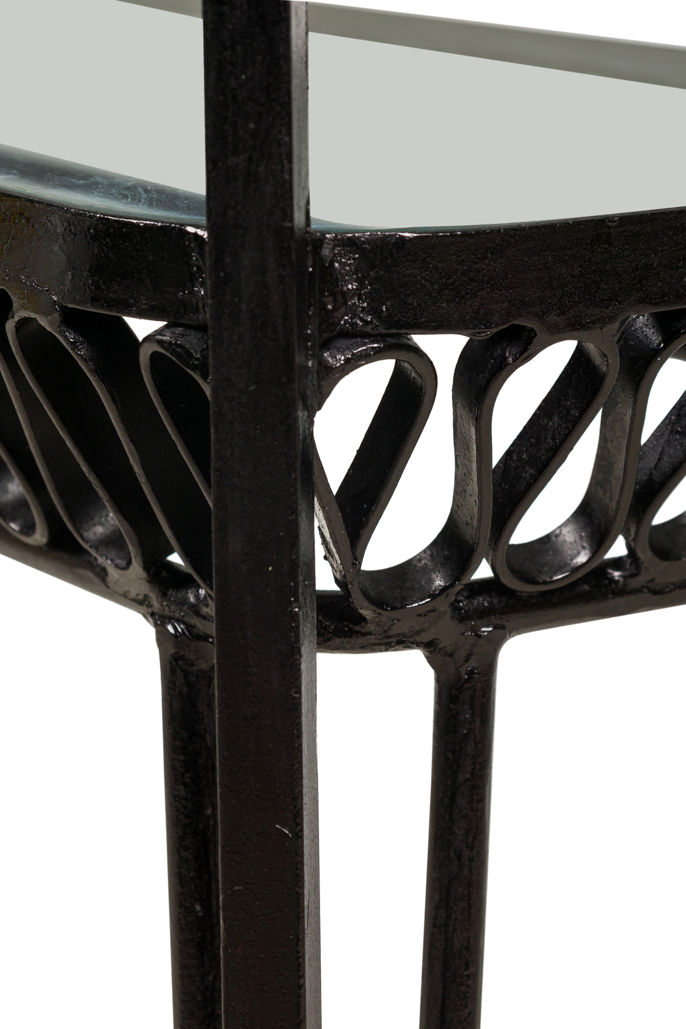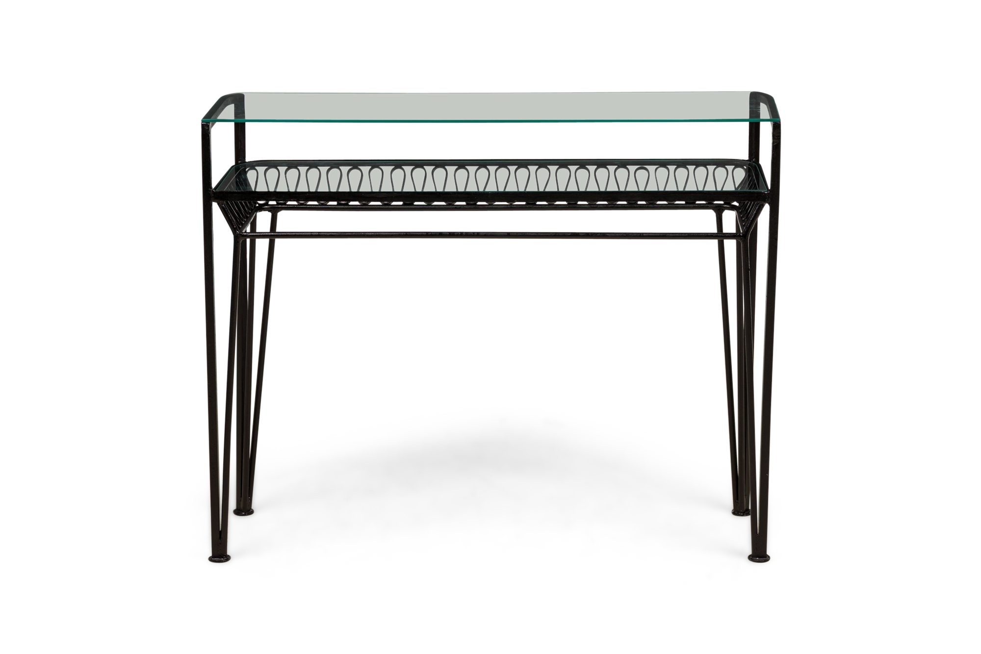 Italian Mid-Century black metal two-tiered console table in rectangular form with a glass top and shelf having a filigree "Ribbon" apron. (MAURIZIO TEMPESTINI FOR JOHN SALTERINI)