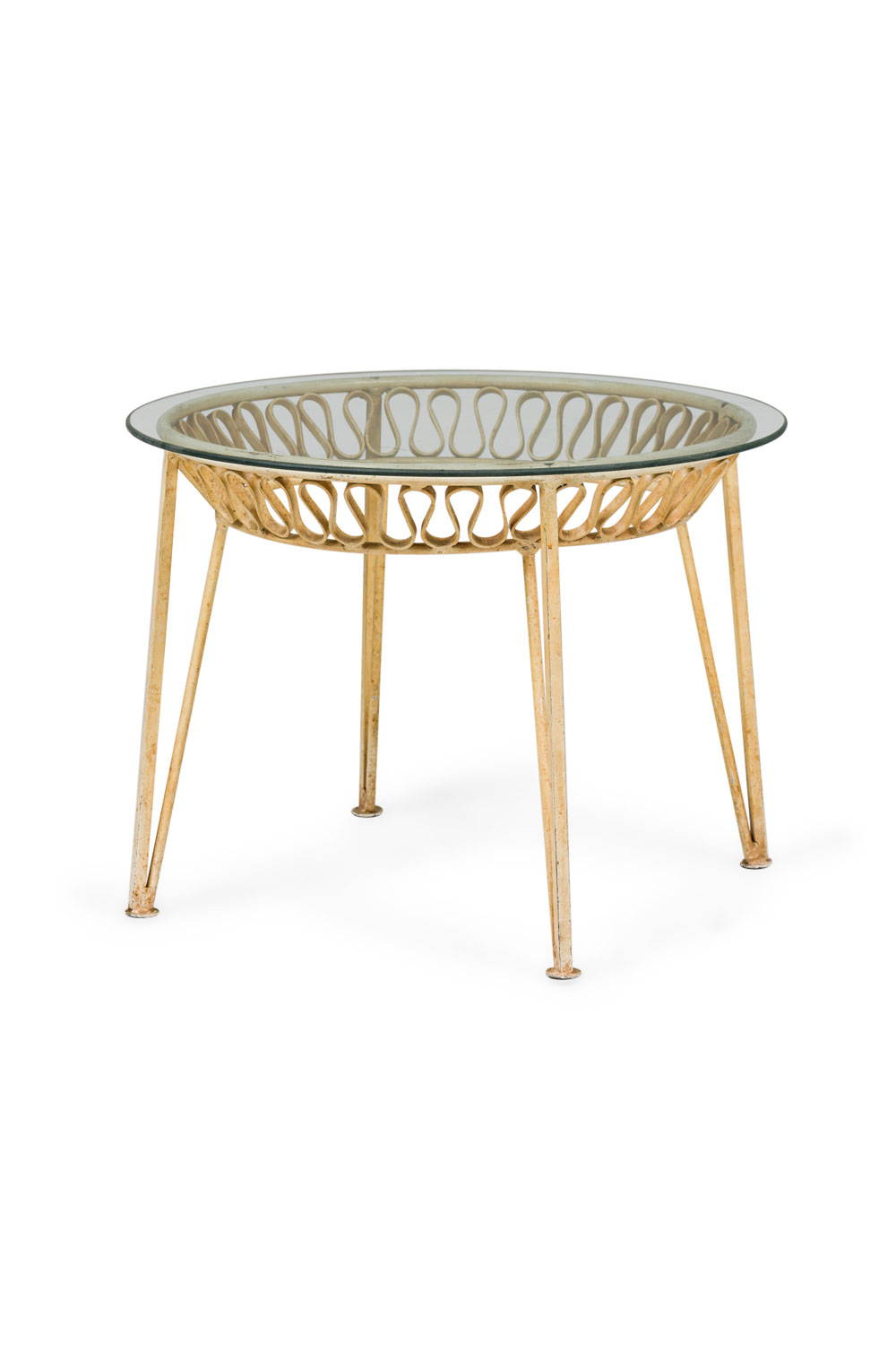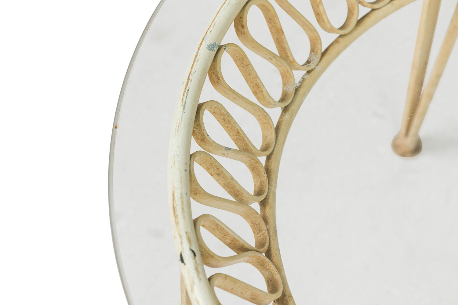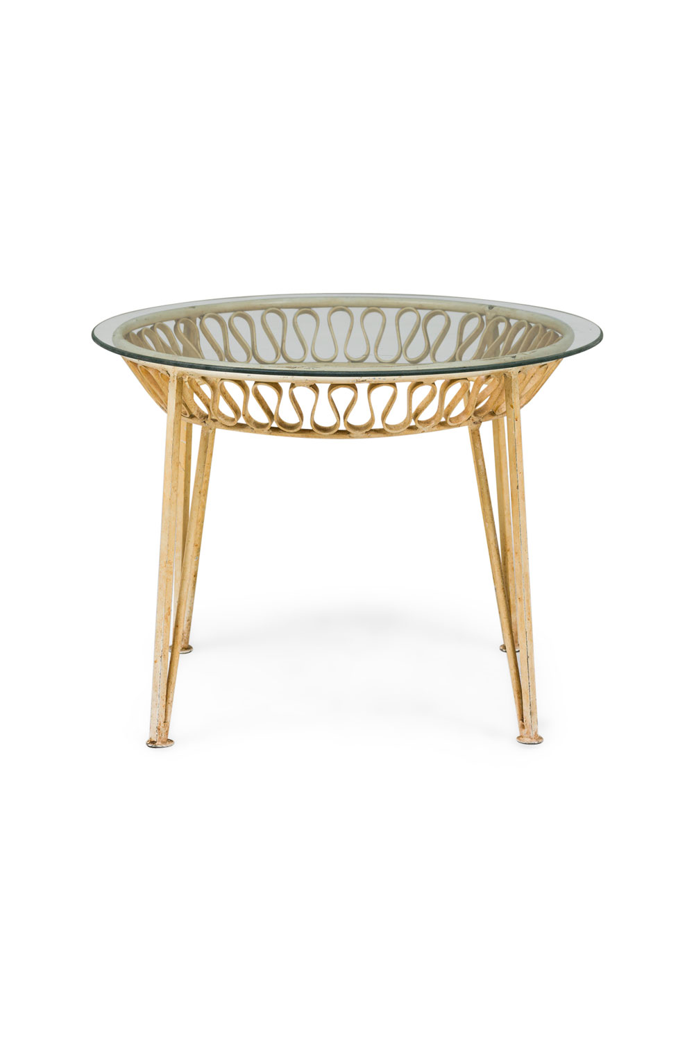 Style: Mid-Century Materials & Techniques: Glass, metal, painted Category: Tables Condition: Wear and discoloration to finish. Good; Minor fading