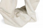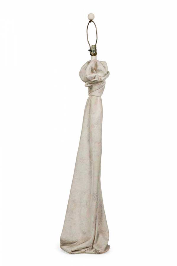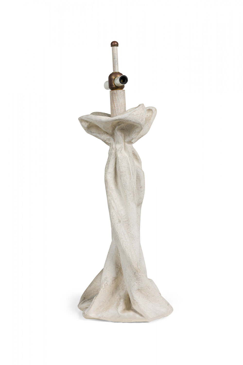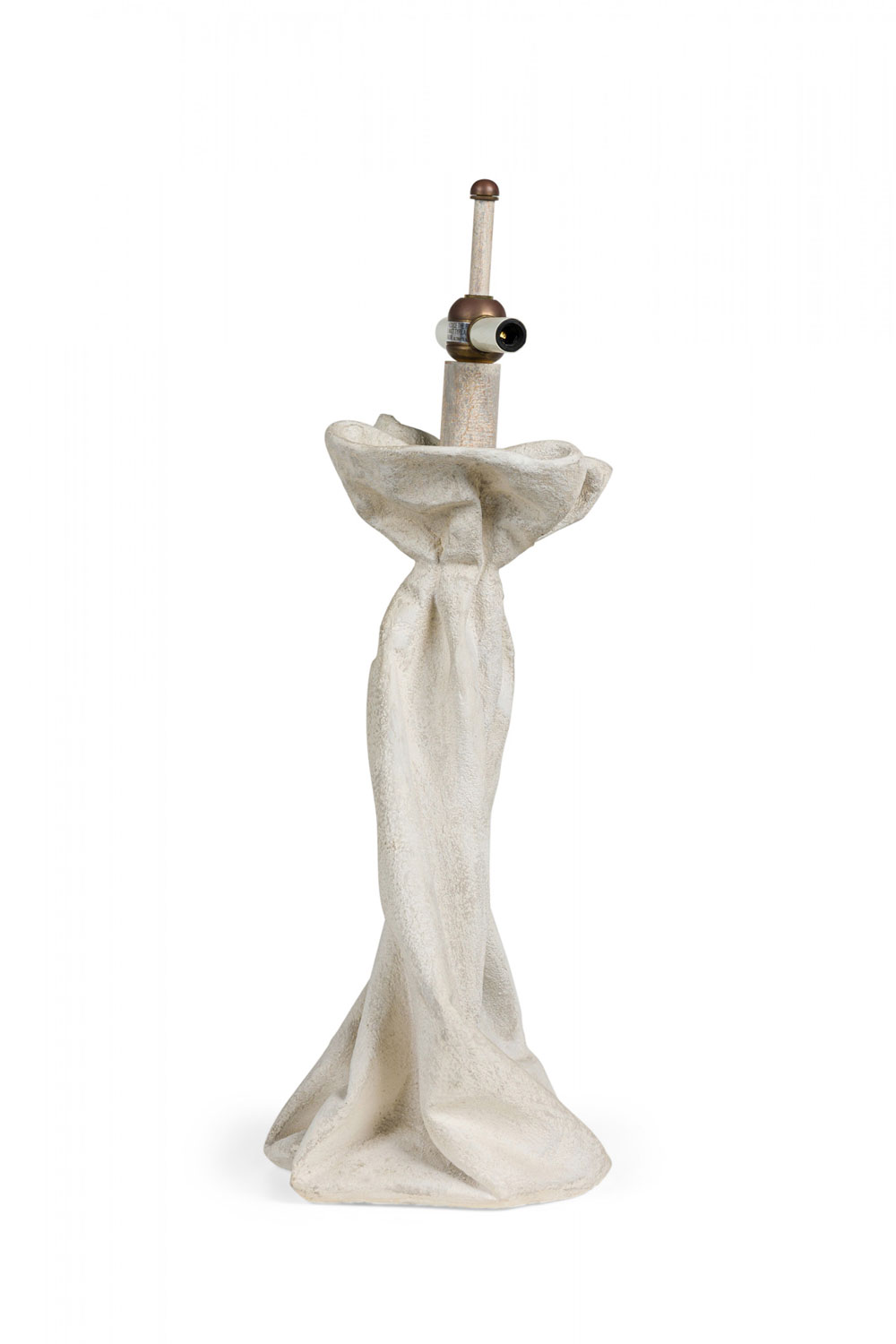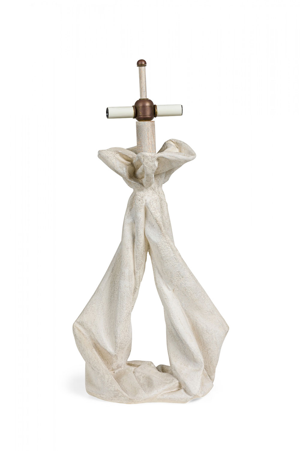 Mid-Century American plaster table lamp in drapery form with a painted wood cylindrical stem, domed metal finial and two cross stems for light sockets (nonfunctioning), the body finished in a stippled matte beige glaze. (Similar pieces: DUL0074, DUL0076)