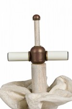 Mid-Century American plaster table lamp in drapery form with a painted wood cylindrical stem, domed metal finial and two cross stems for light sockets (nonfunctioning), the body finished in a stippled matte beige glaze. (Similar pieces: DUL0074, DUL0076).