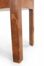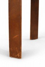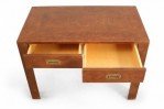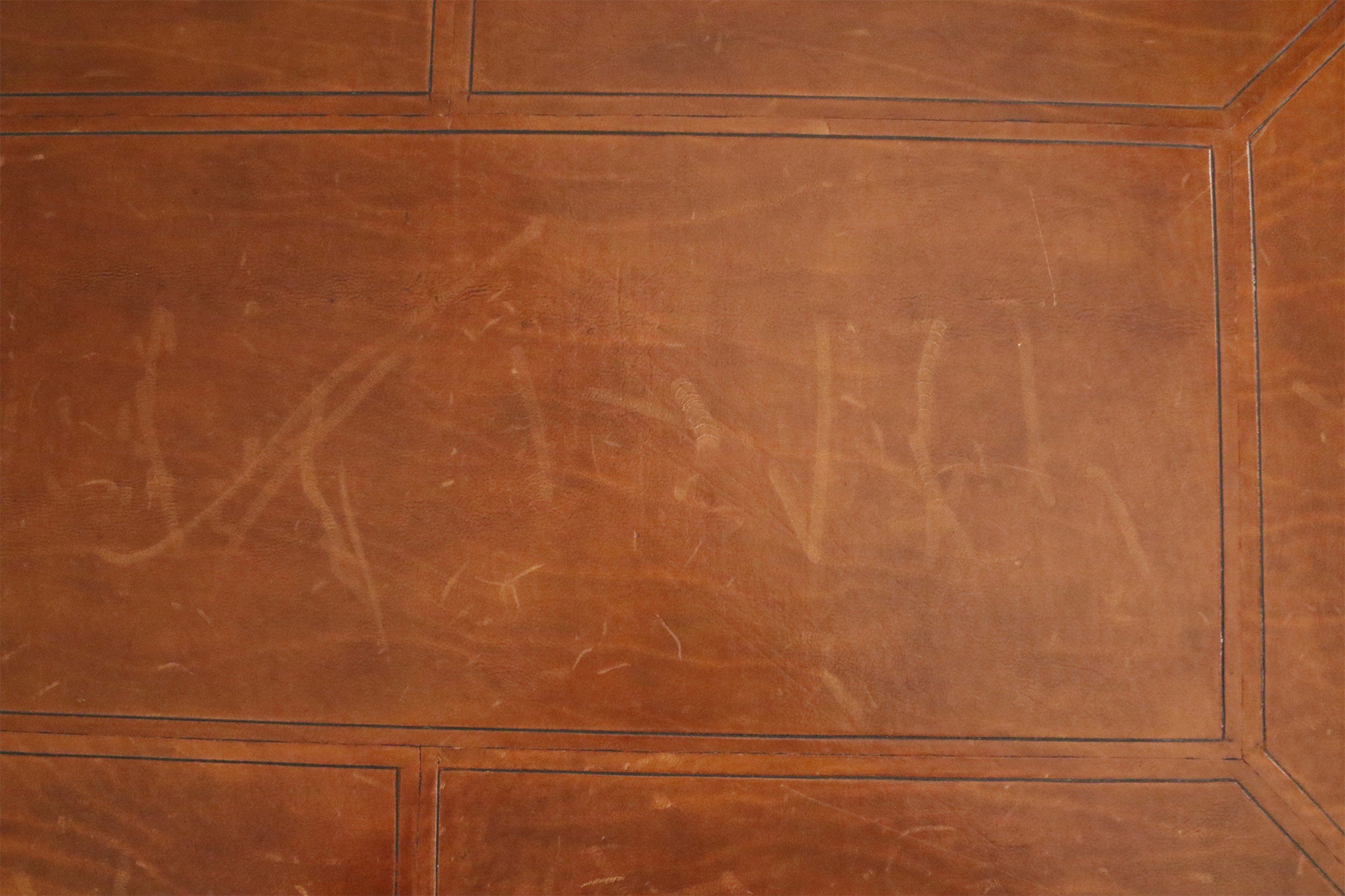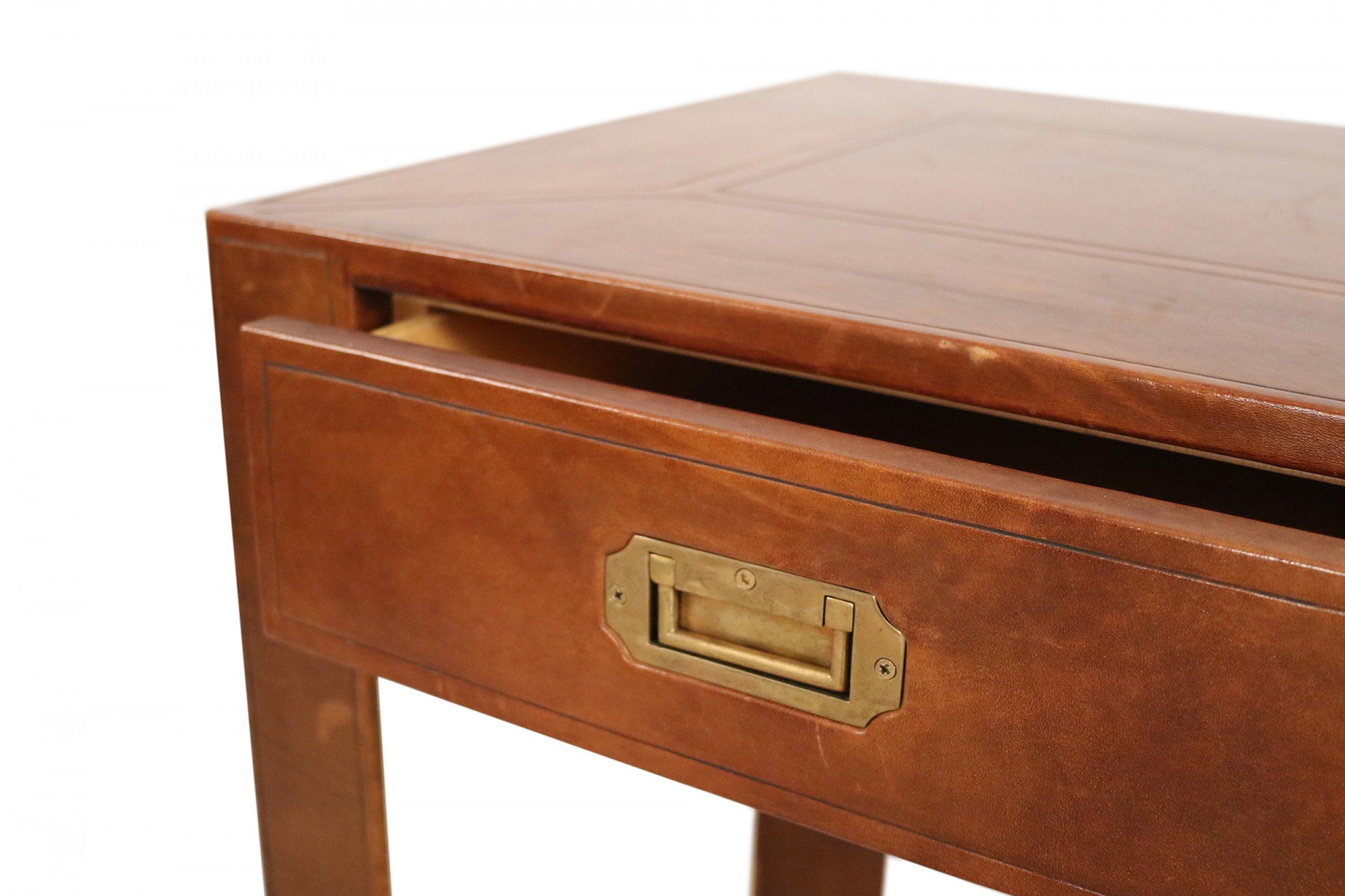 Style: Mid-Century Materials & Techniques: Wood, brass, leather Category: Tables, Office/Library Condition: Vintage condition. Large scuffs in leather.