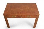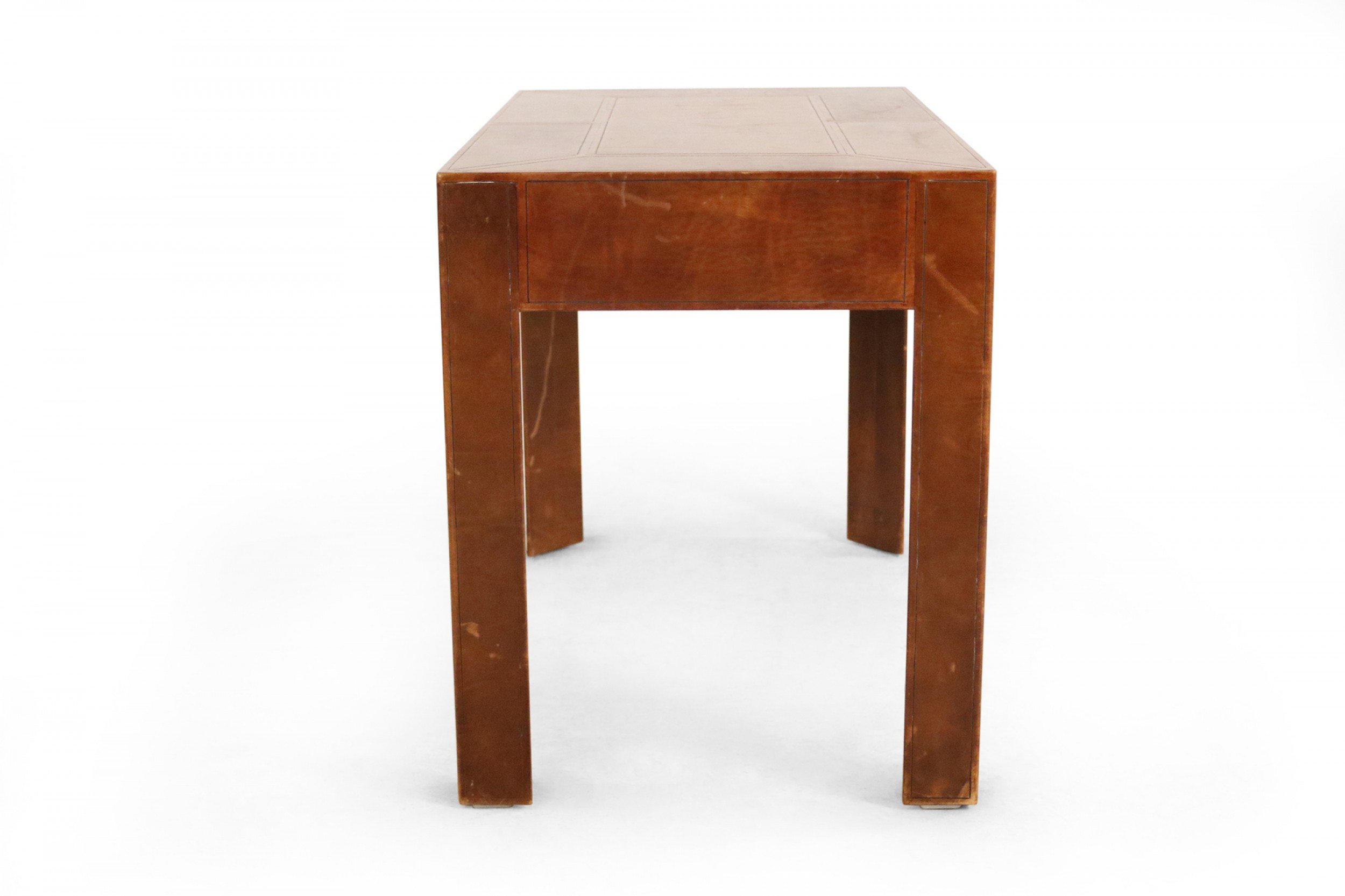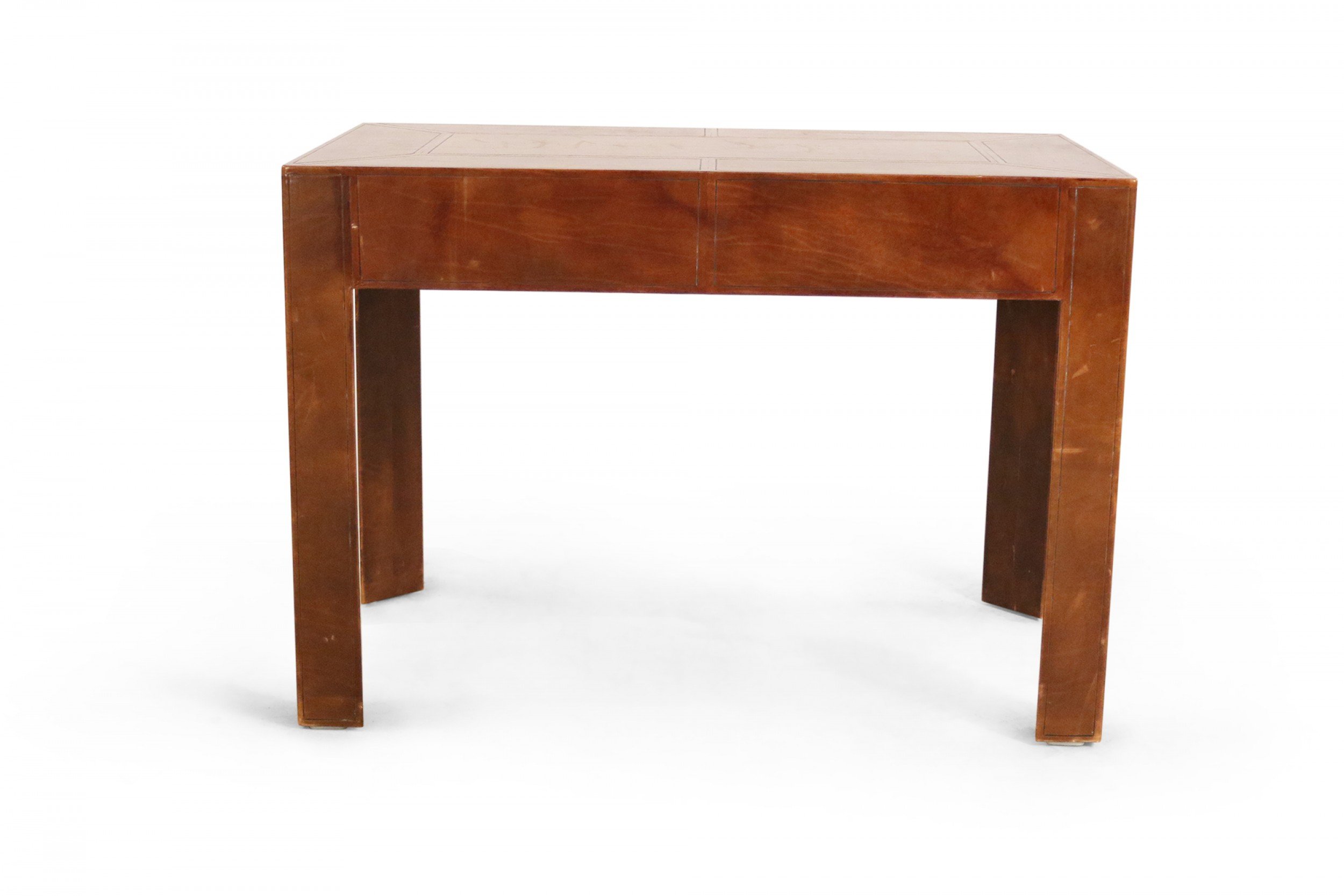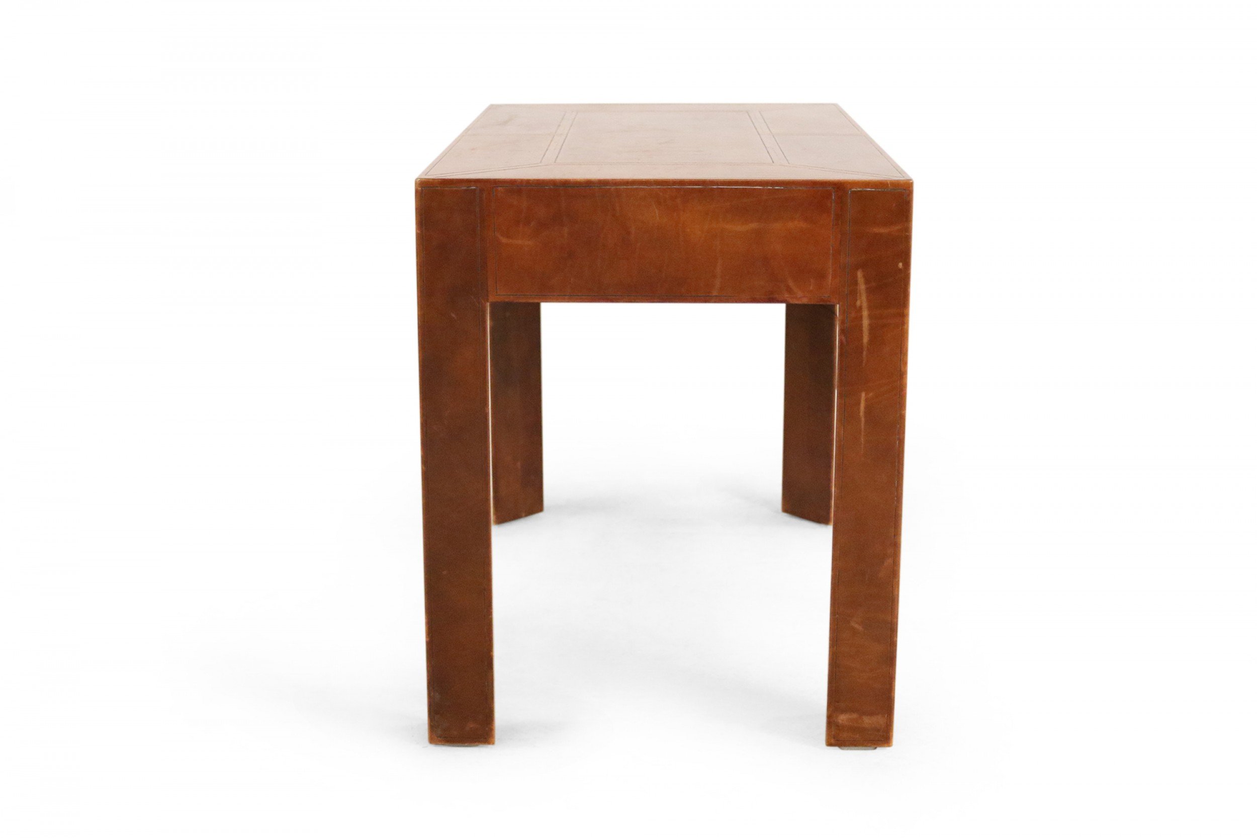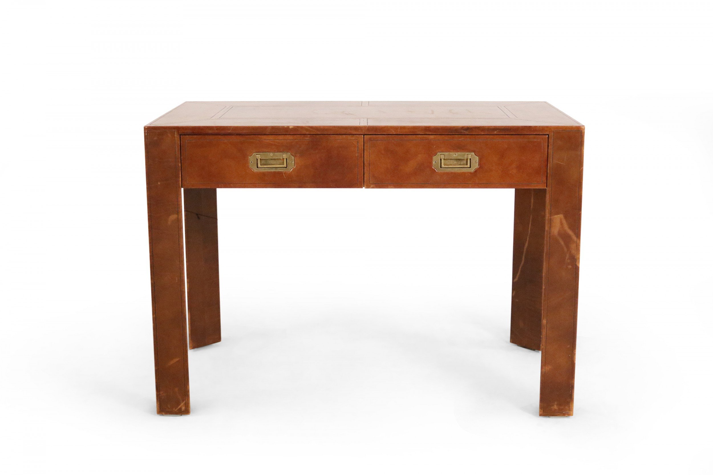 Mid-Century leather wrapped rectangular desk with two drawers with brass drawer pulls.