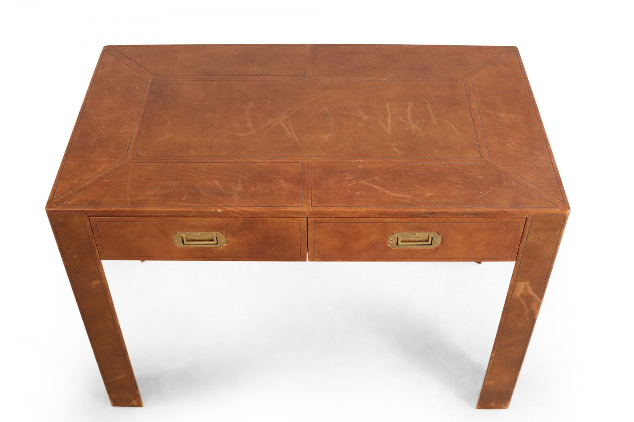 Mid-Century leather wrapped rectangular desk with two drawers with brass drawer pulls..