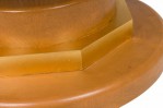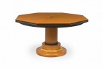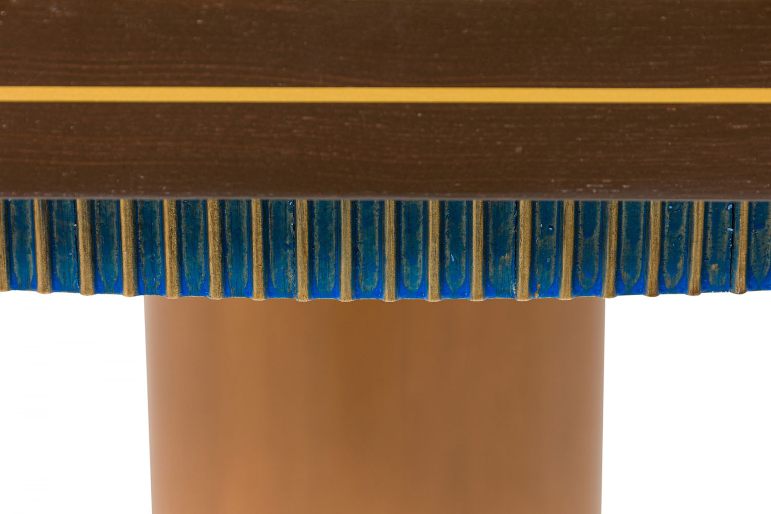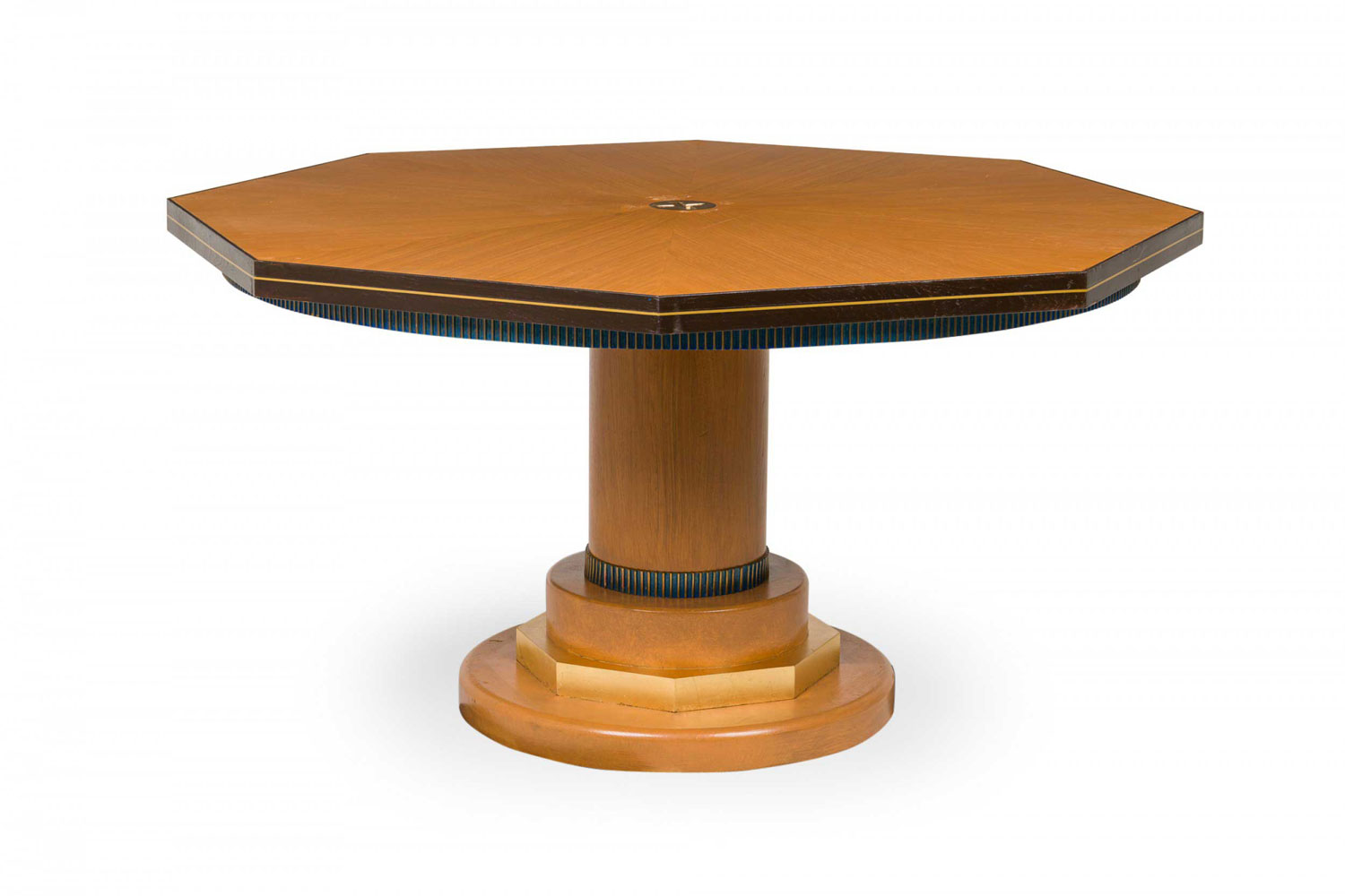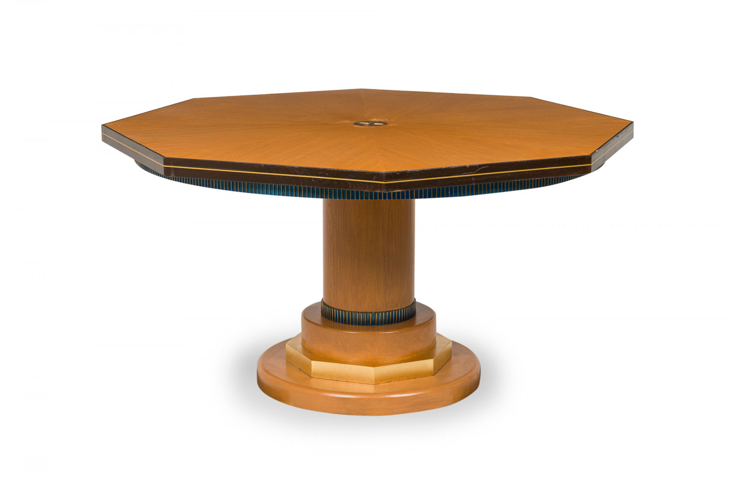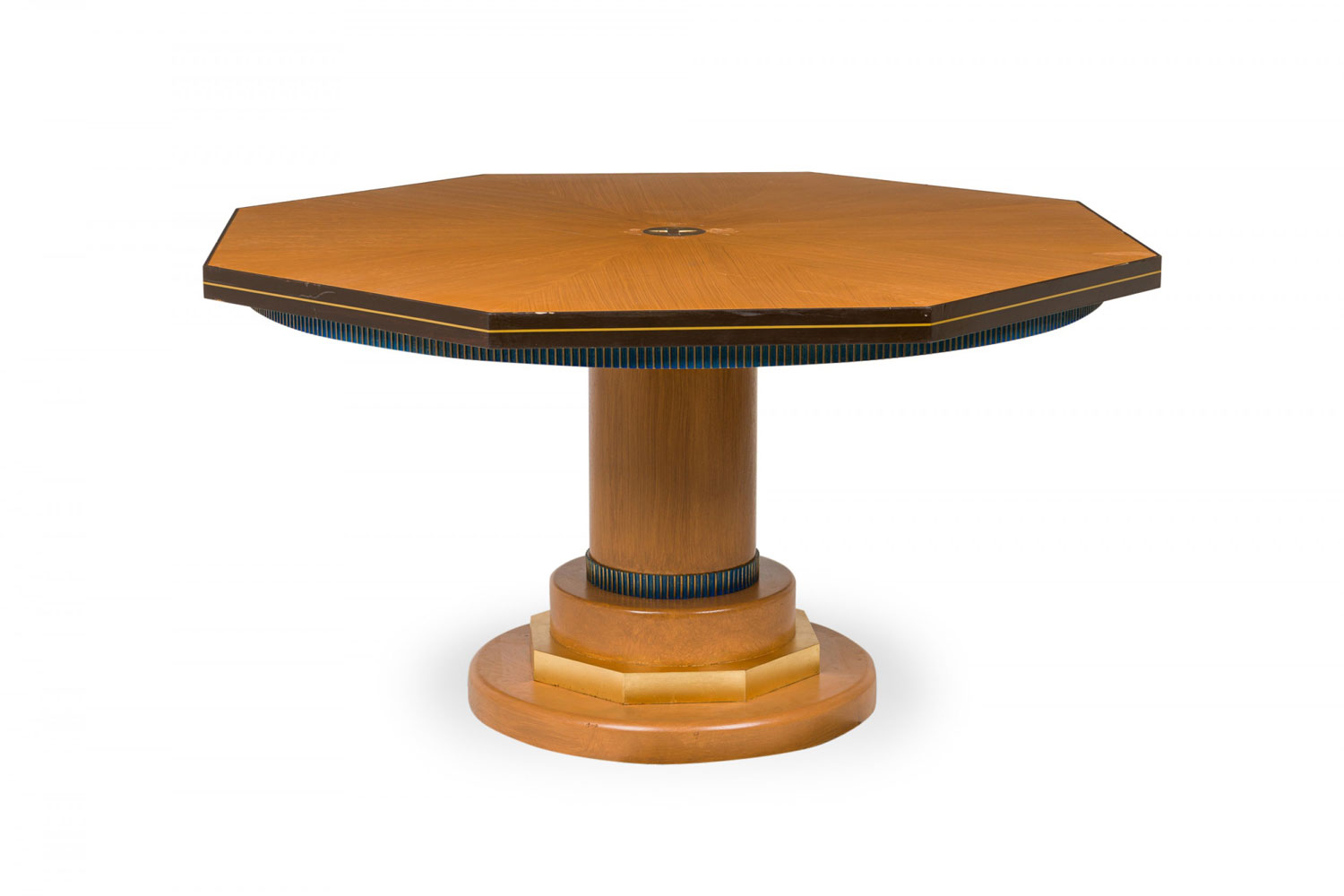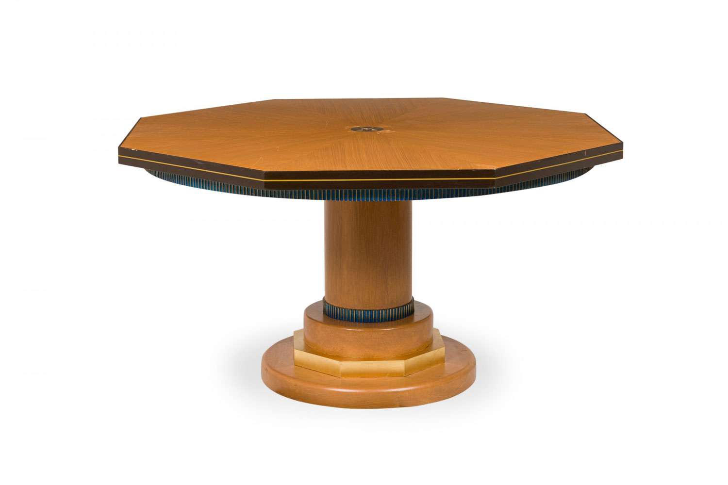 Mid-Century cerused oak pedestal base center / dining table having a round octagonal lacquered wooden top, with a fluted edge and blue painted wood and gold metallic insets..