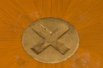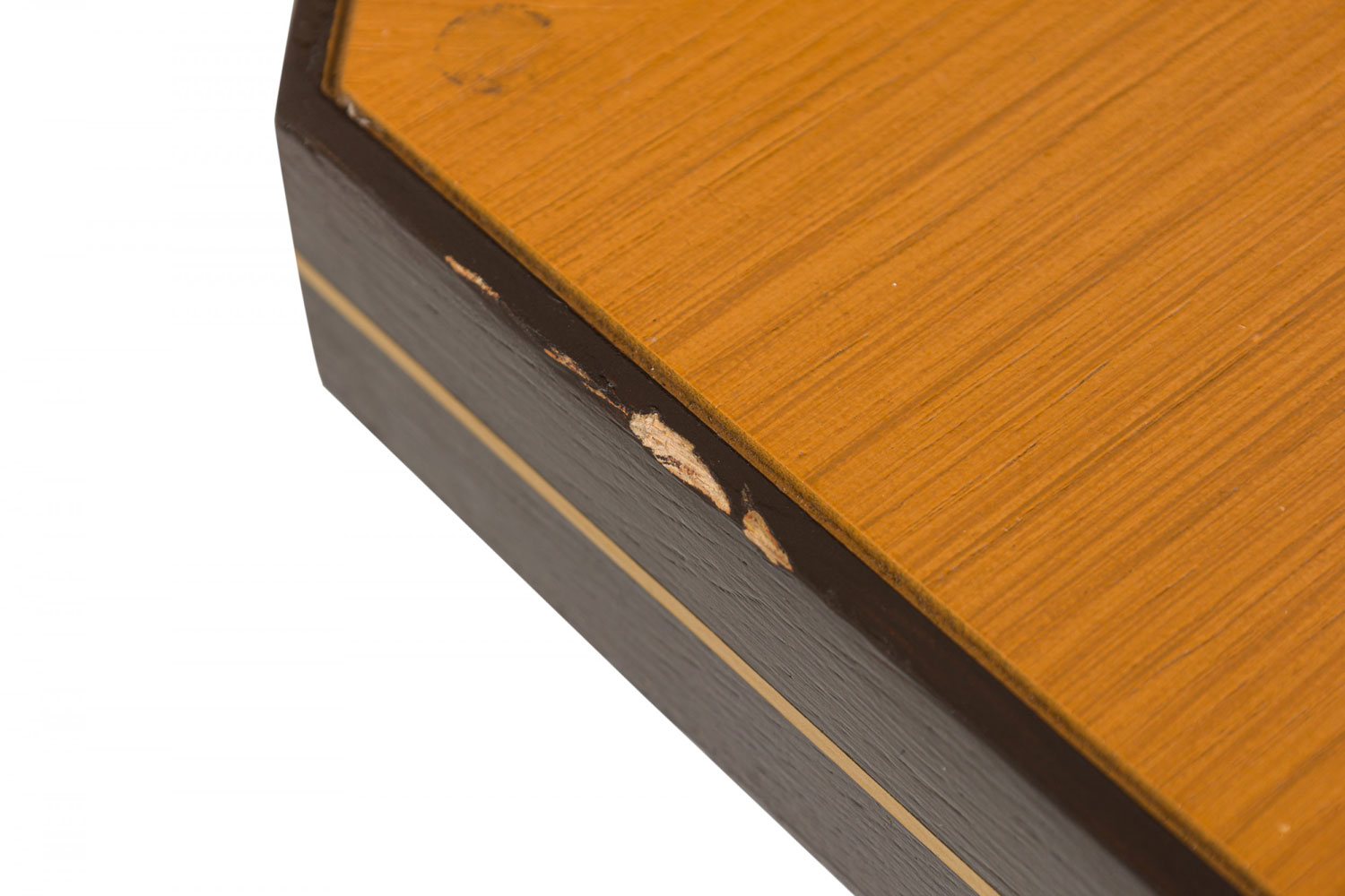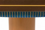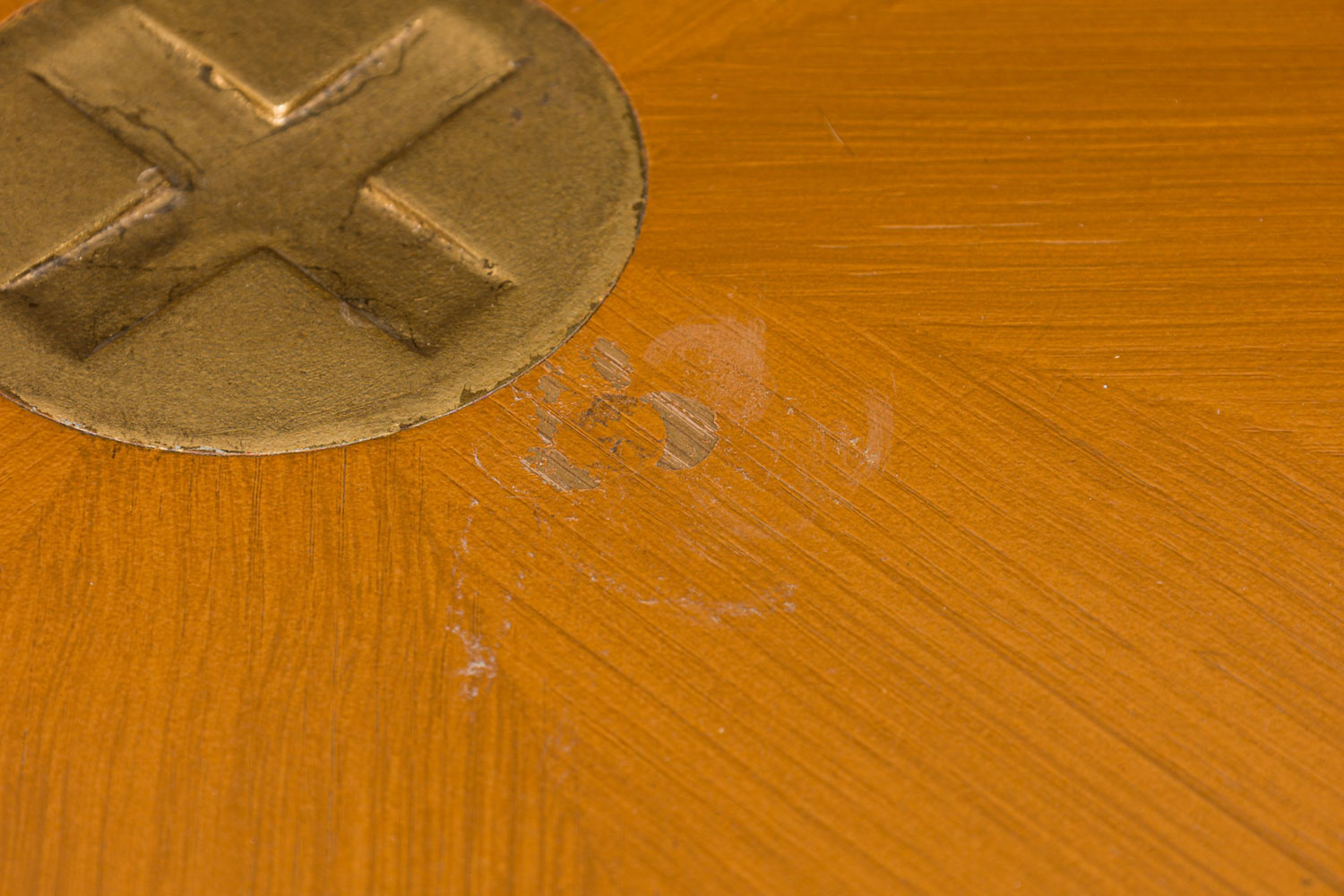Style: Mid-Century Materials & Techniques: Metal, oak, painted, wood Category: Tables Condition: Damage to table top finish around center brass inset. Fluted details have been accented with blue. Good; Minor losses