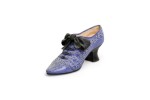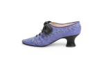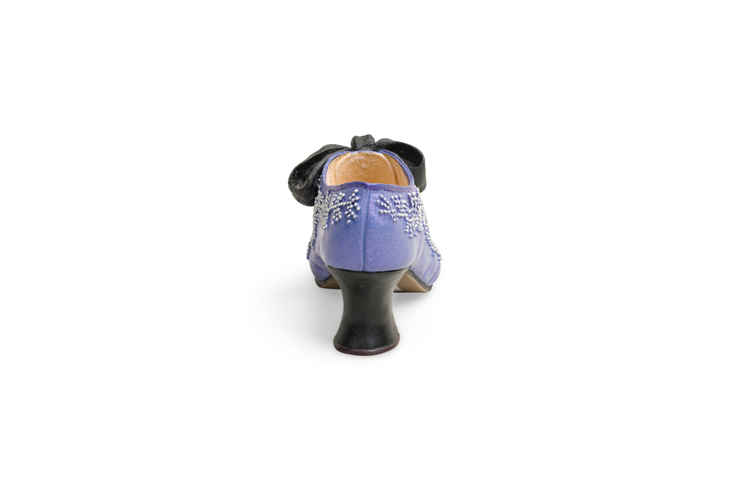 Mid-Century Continental small figurine of a lavender shoe with pearls and a blacl bow (Collection NWL7892A-M).