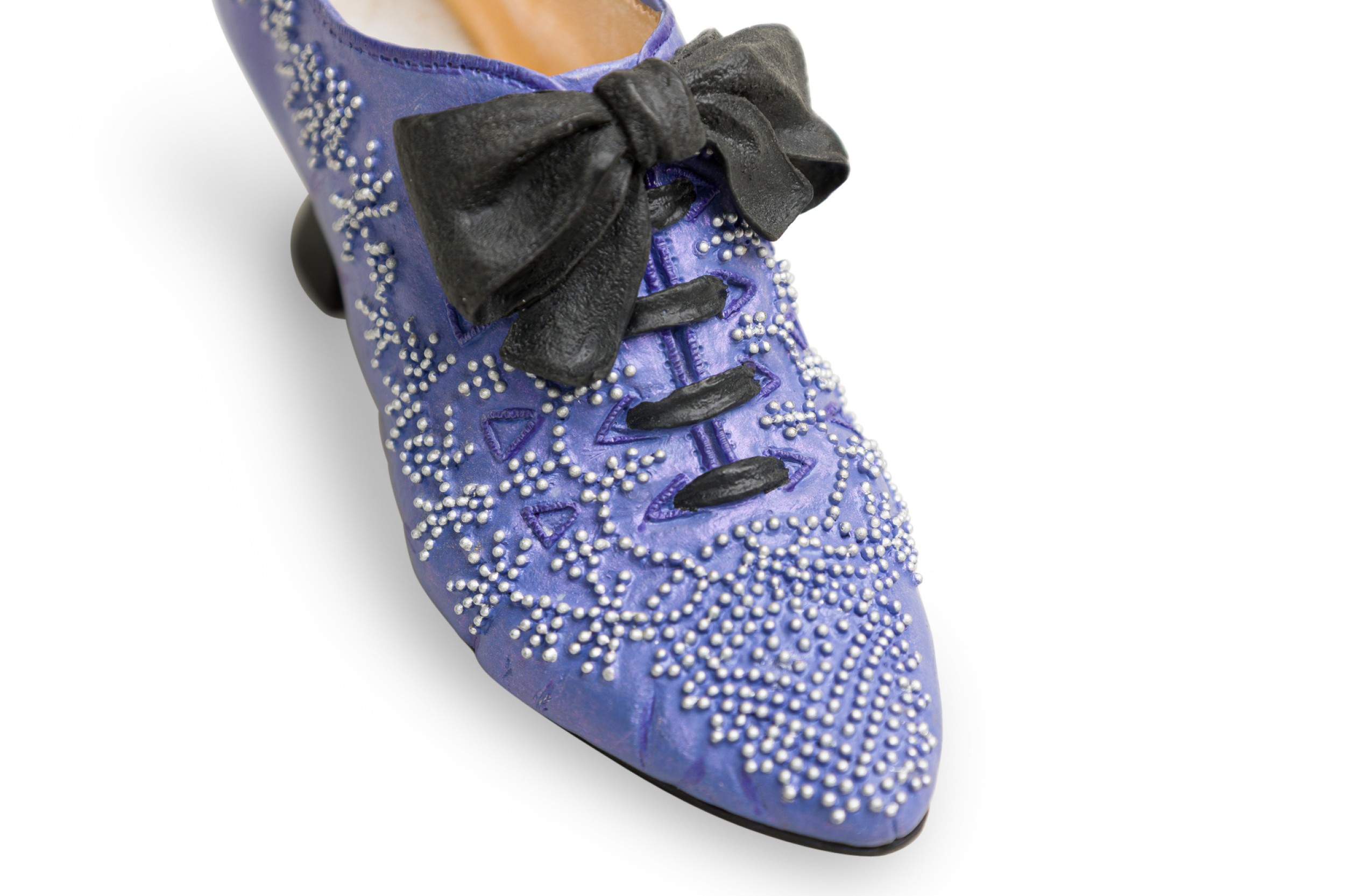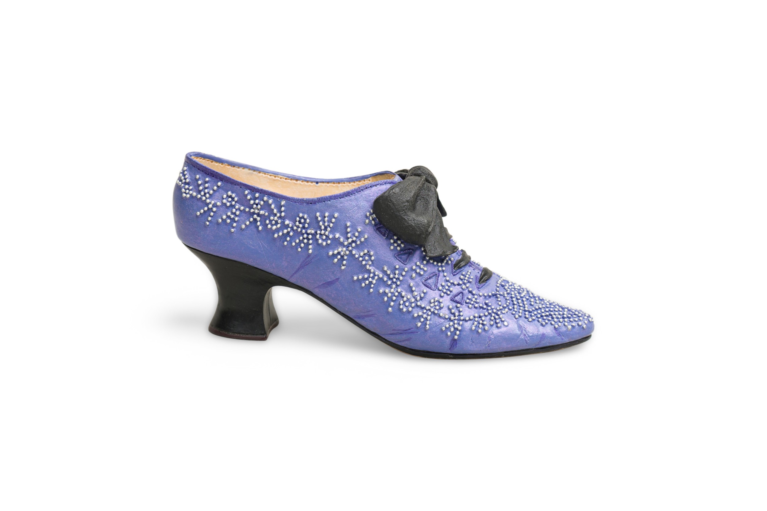 Mid-Century Continental small figurine of a lavender shoe with pearls and a blacl bow (Collection NWL7892A-M)