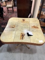 Mid-Century Italian game table with a square shaped 9-parchment section top having 4 sections with a marquetry design above a fluted design edge and resting on a metal pedestal base ending in 4 pad feet (PAOLO BUFFA)