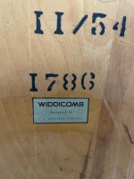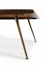 Style: Mid-Century Materials & Techniques: Brass, metal, walnut, wood Category: Tables Condition: Decal manufacturer's label 'Widdicomb Designed by T.H. Robsjohn-Gibbings' and stenciled manufacturer's mark to underside 'II/54 1786