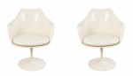 SET of 4 mid-century white resin tulip armchairs with vinyl seat cushions and painted metal pedestal bases (EERO SAARINEN FOR KNOLL).