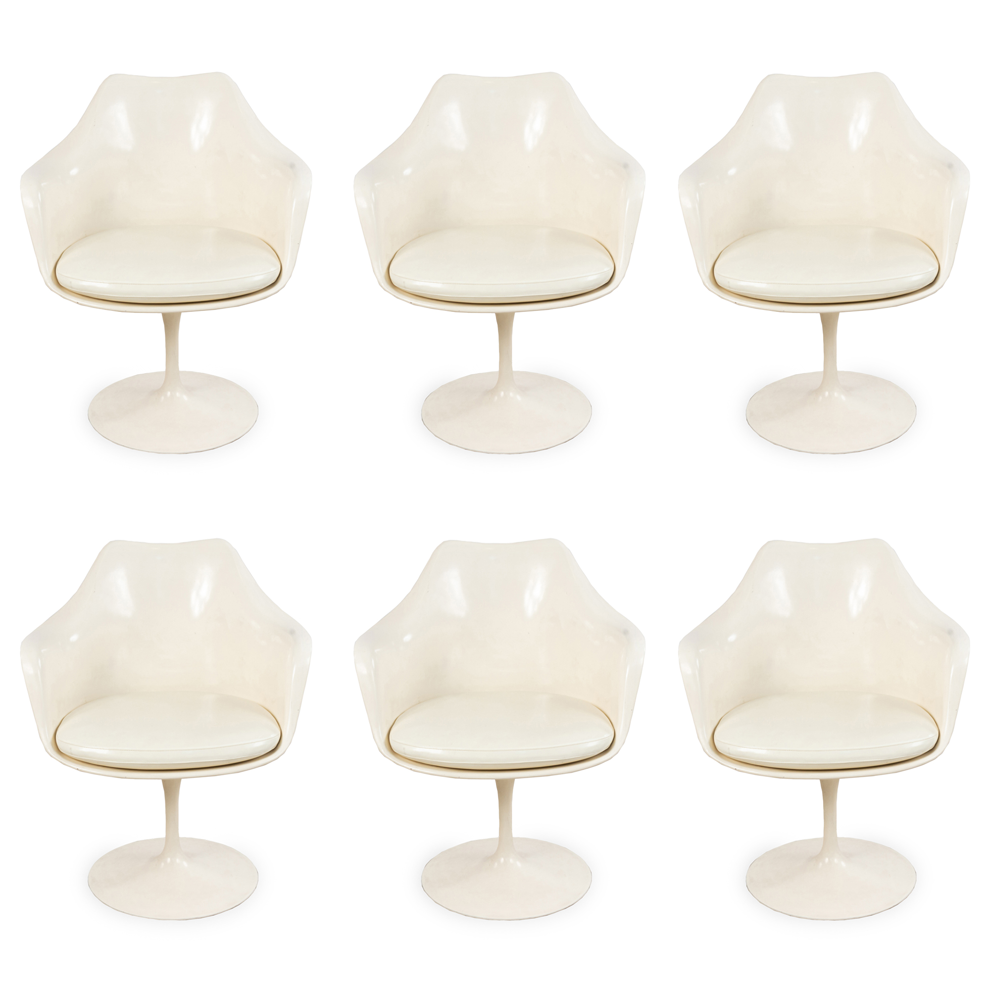 SET of 4 mid-century white resin tulip armchairs with vinyl seat cushions and painted metal pedestal bases (EERO SAARINEN FOR KNOLL)