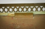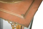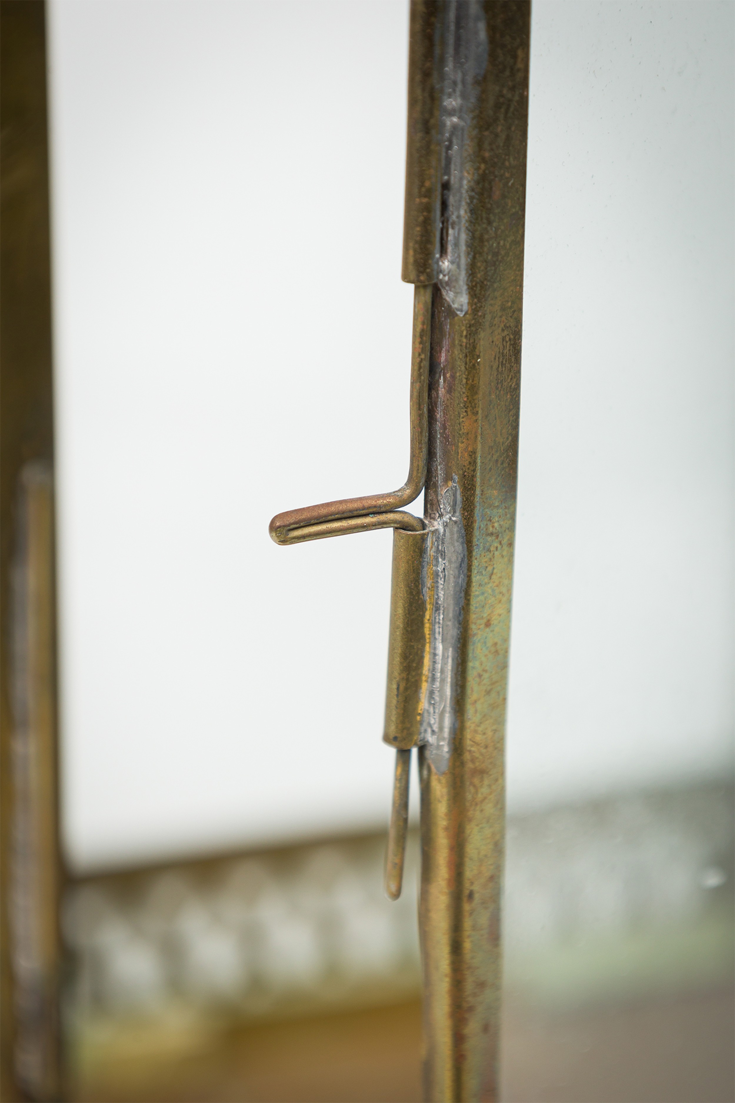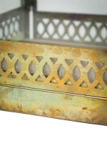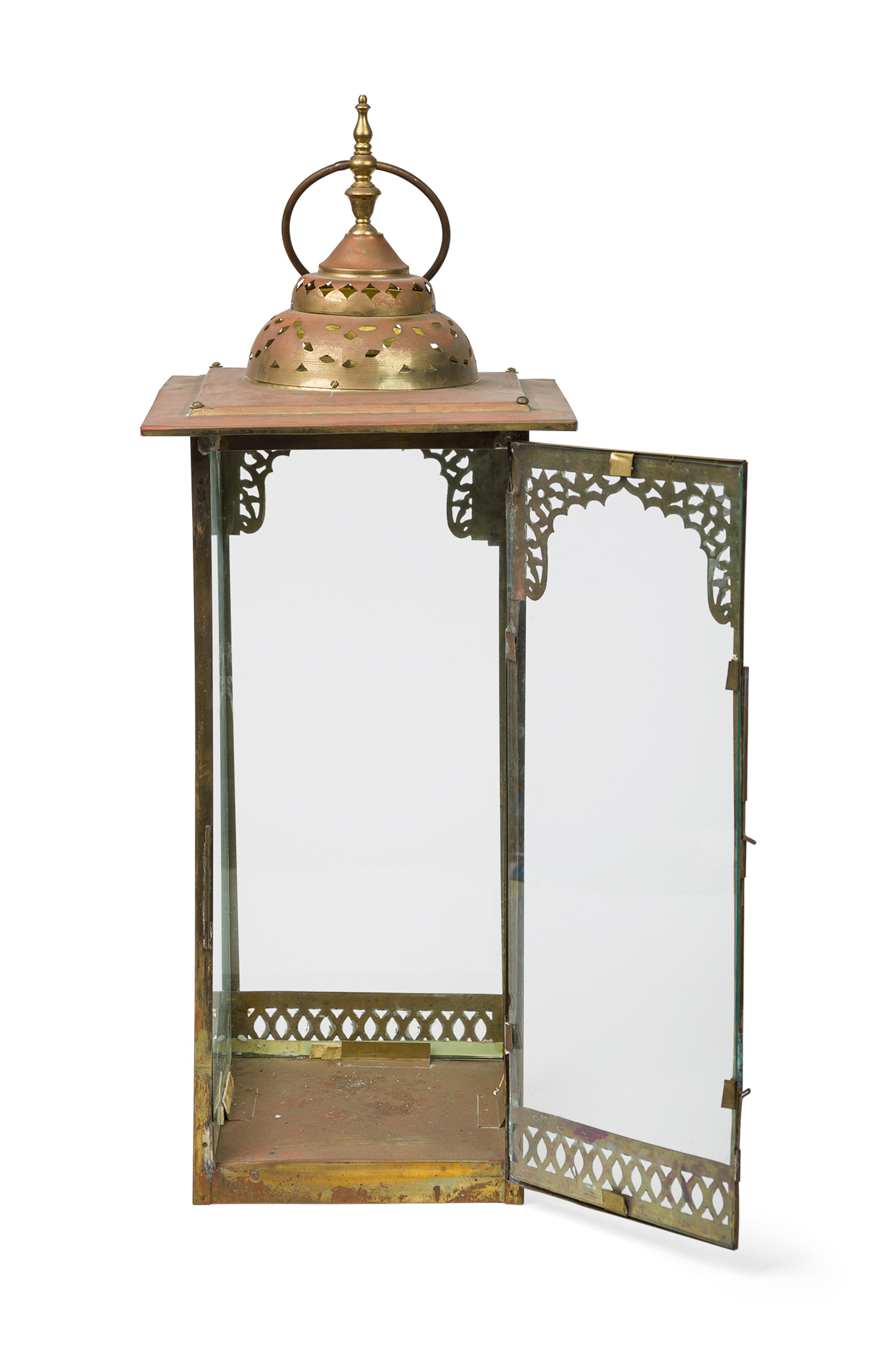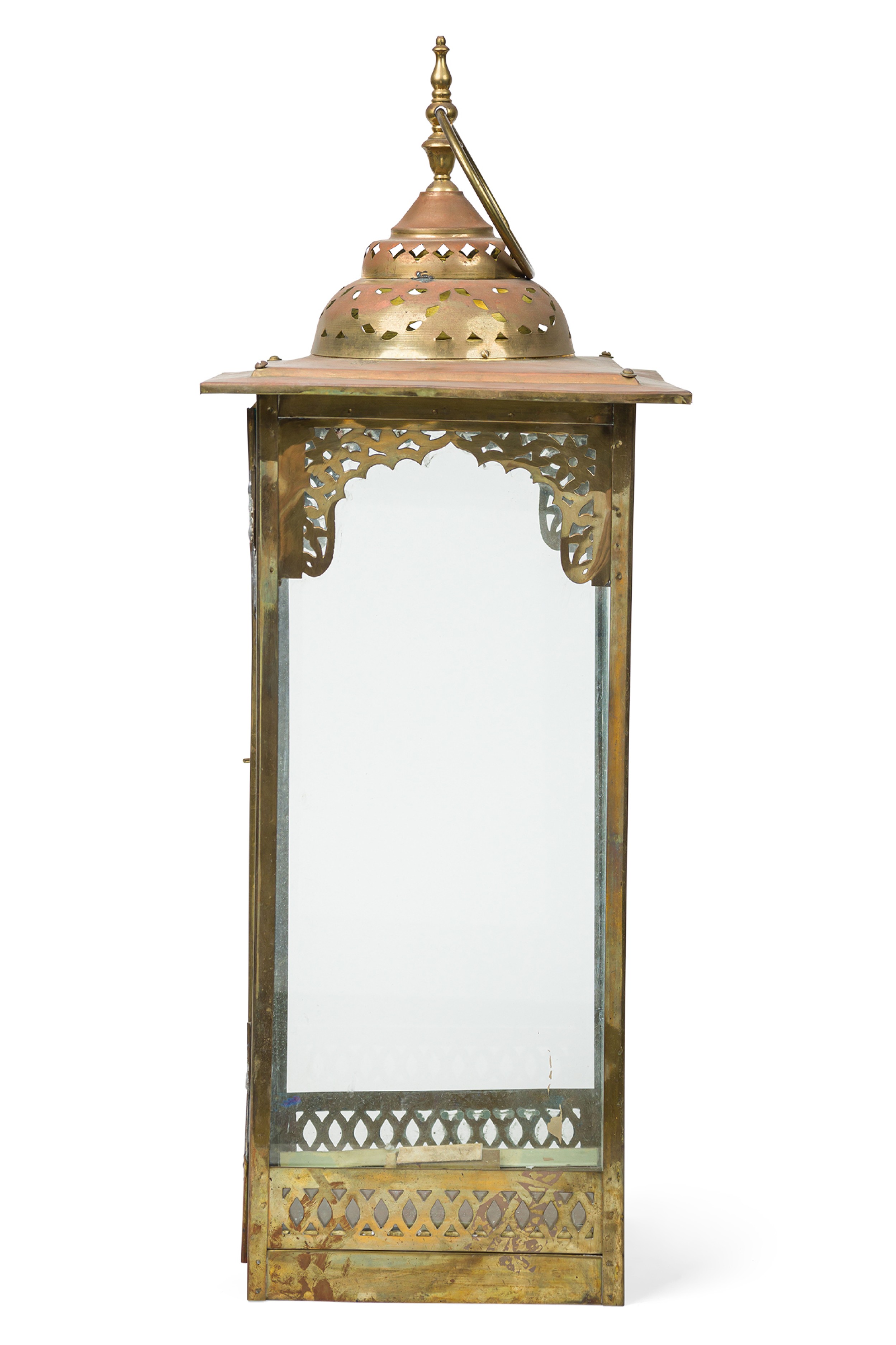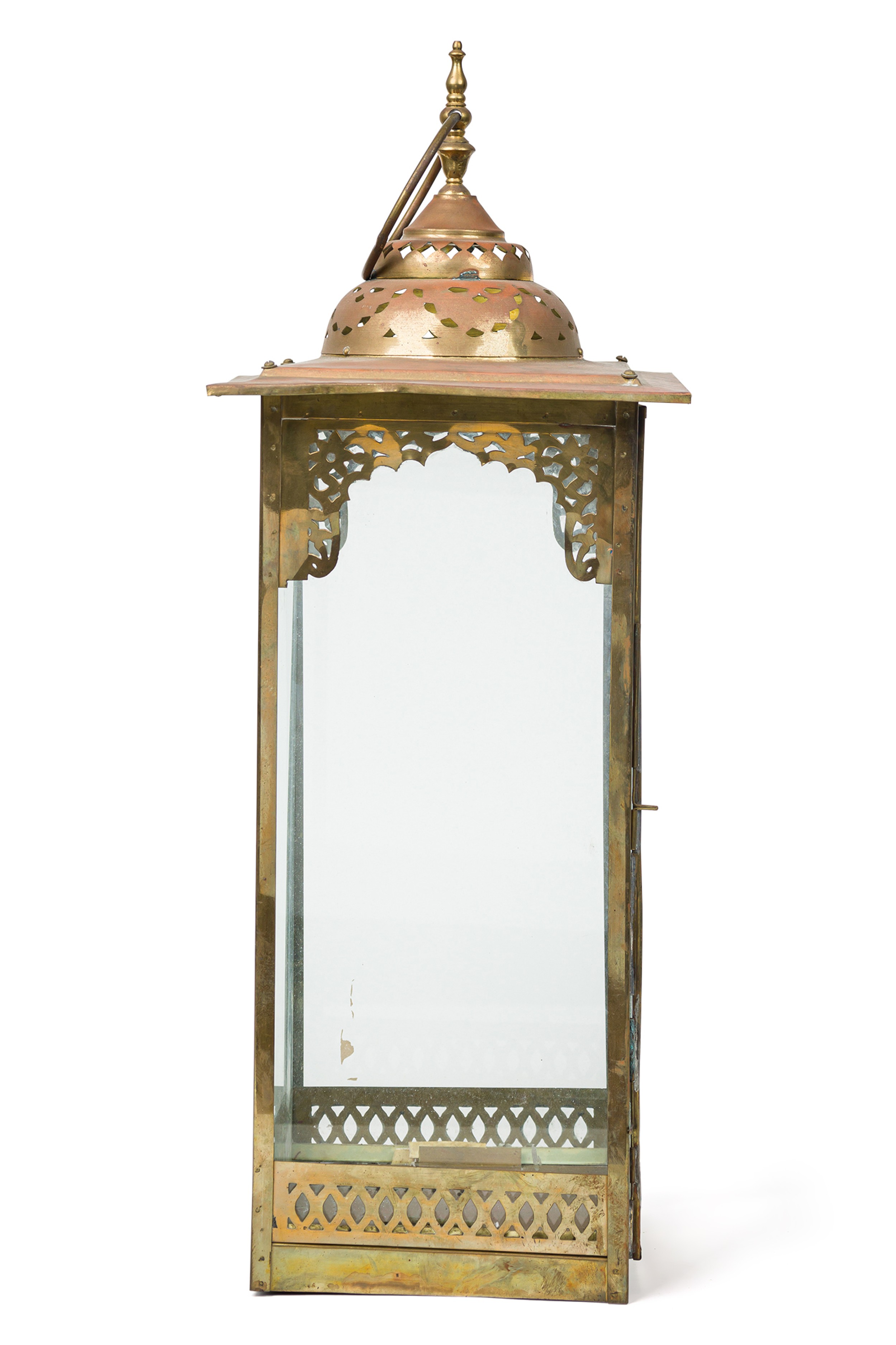 Middle Eastern Moorish style distressed brass square candle lantern having a filigree bottom and top over glass panels with a round finial top supported by a circular handle