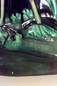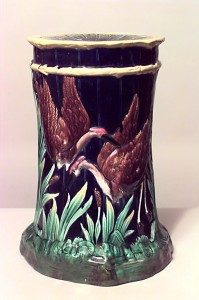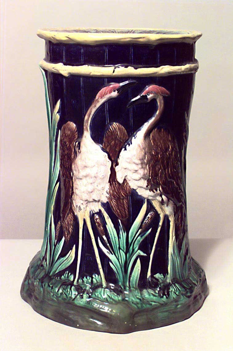 English Victorian Majolica blue porcelain garden seat with herons and foliage (signed).