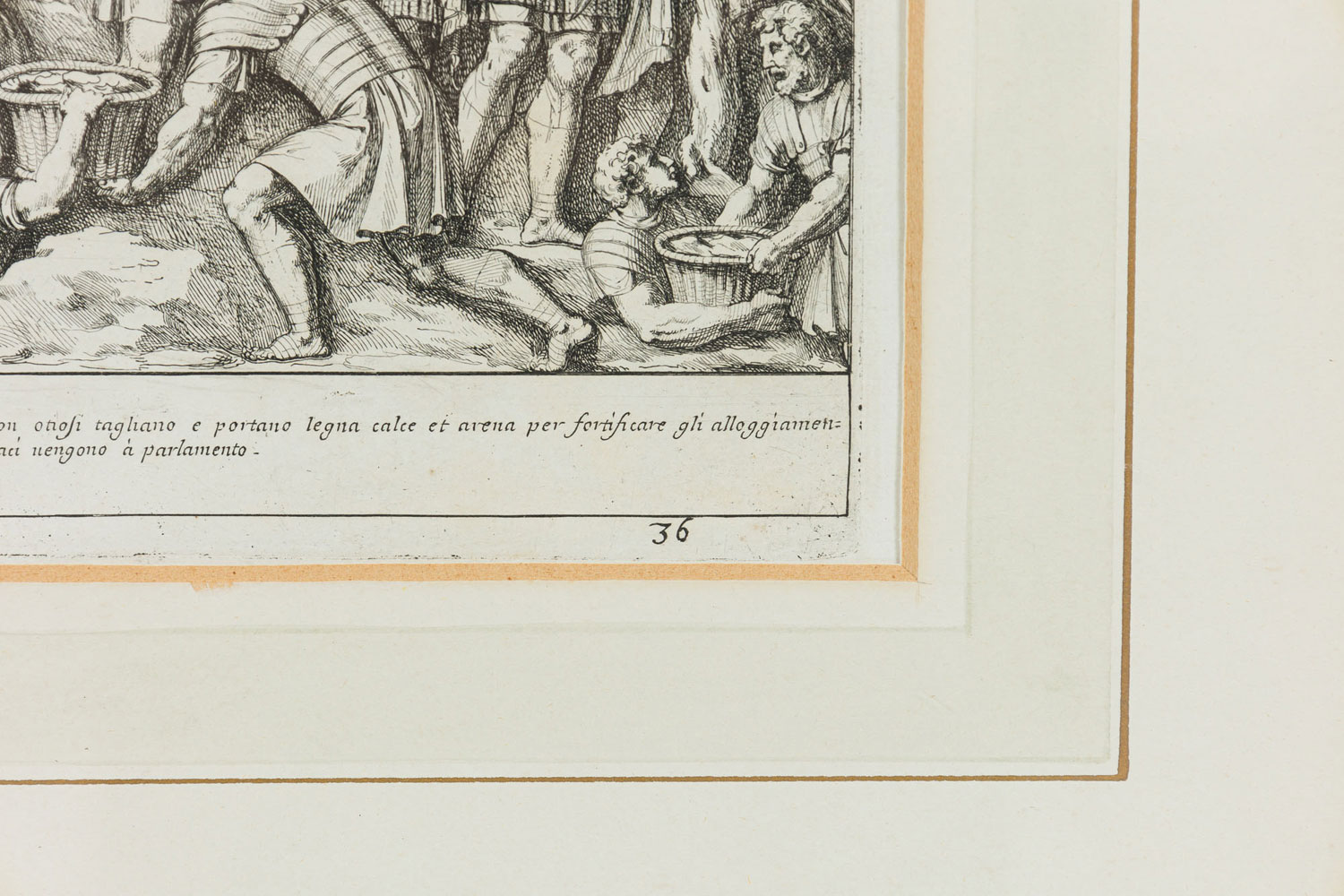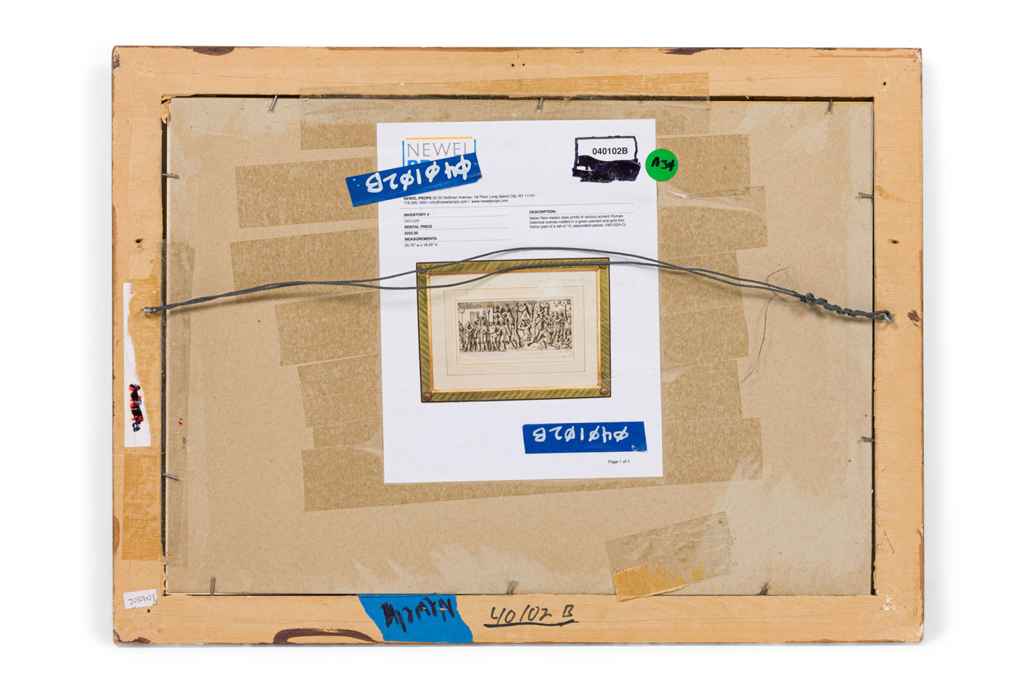 Italian Neo-classic style prints of various ancient Roman historical scenes matted in a green painted and gold trim frame (part of a set of 15; associated pieces: 040102A-O).