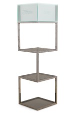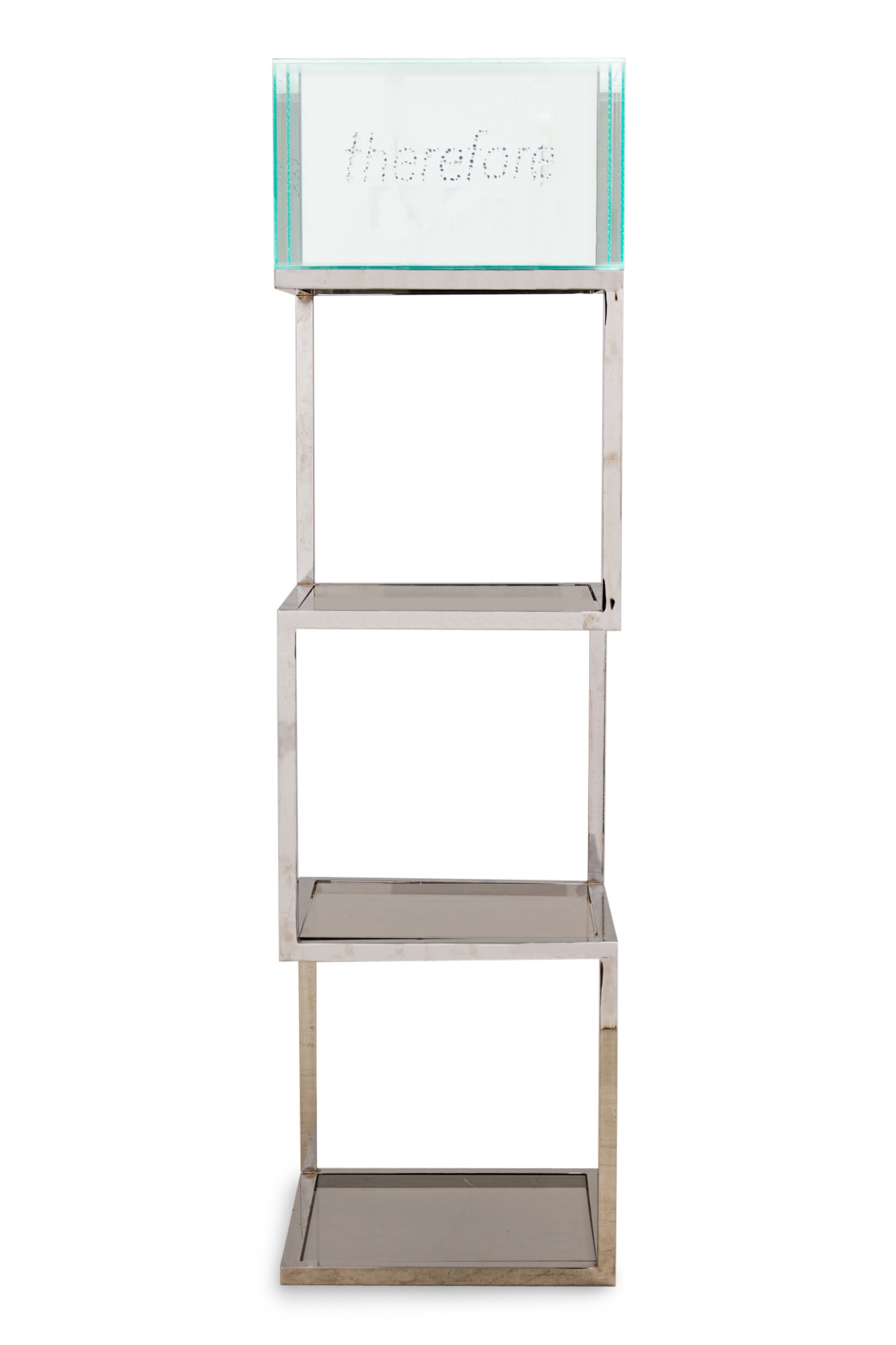 Ready made sculptural installation with etagere. Chrome, acrylic, glass, Swarovski crystals. 2025.