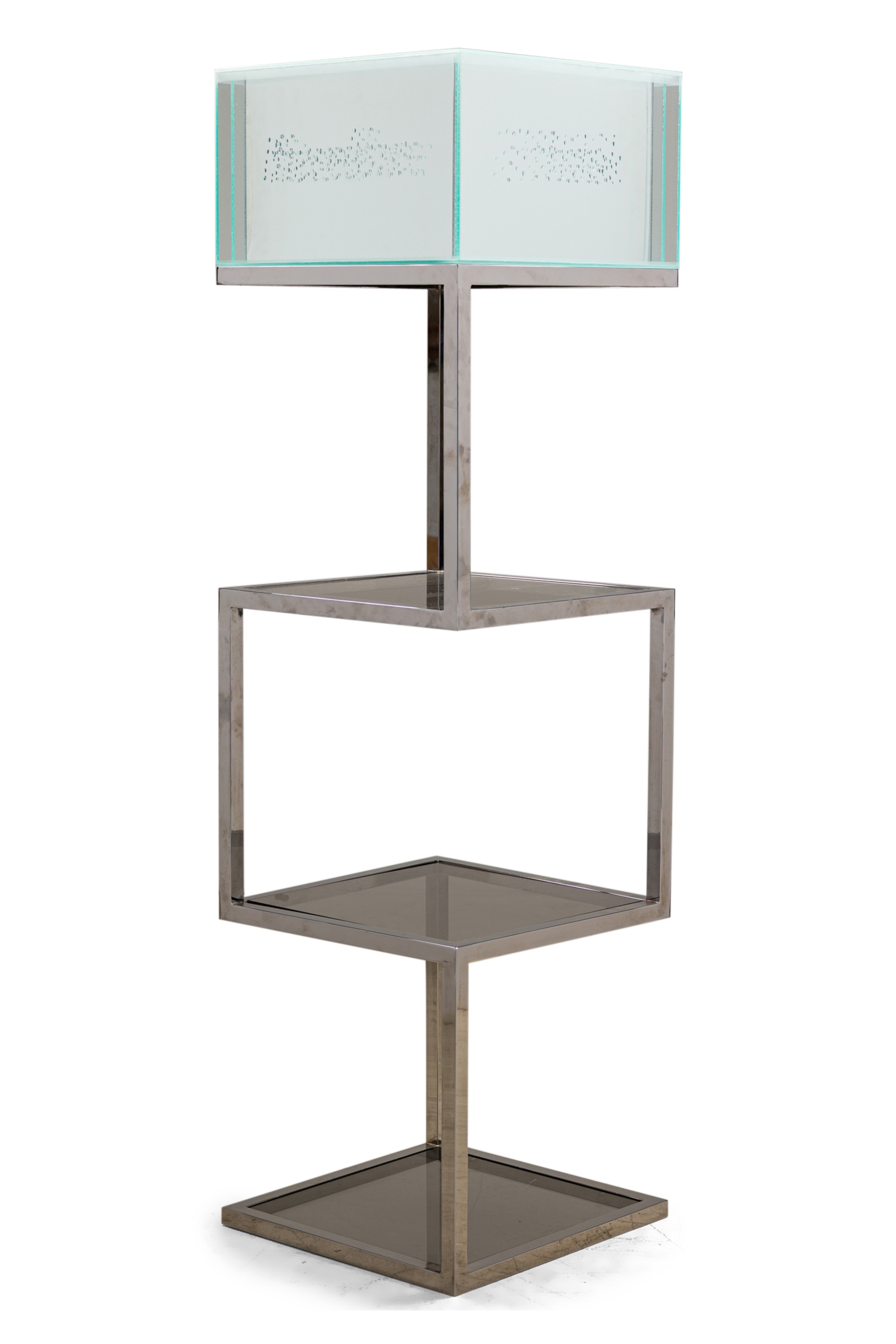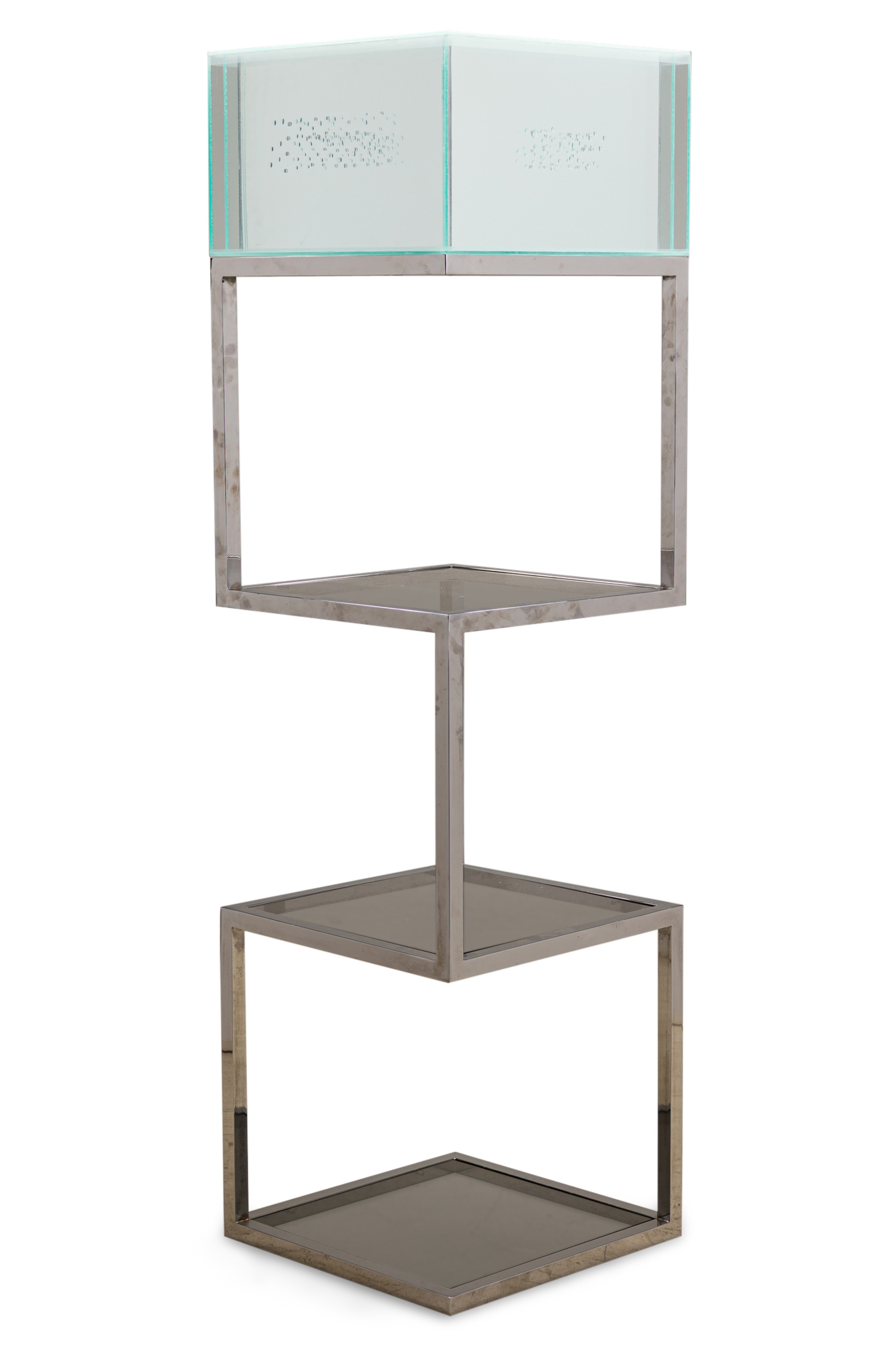 Ready made sculptural installation with etagere. Chrome, acrylic, glass, Swarovski crystals. 2025