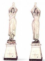 PAIR of Outdoor French Egyptian Revival style cast iron women, each holding a torch aloft and standing on spreading square bases (mid 19th Cent., attr. Val D'Osne) (PRICED AS PAIR)