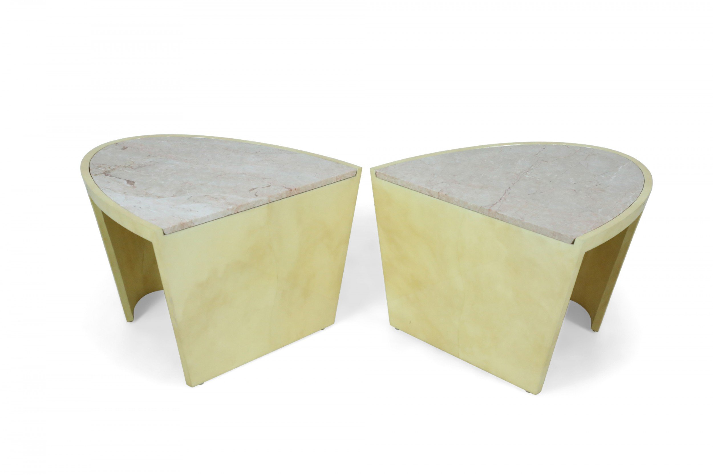 Italian Contemporary oval coffee table in two sections with parchment veneer bases supporting beige Breccia Onitiata marble tops.