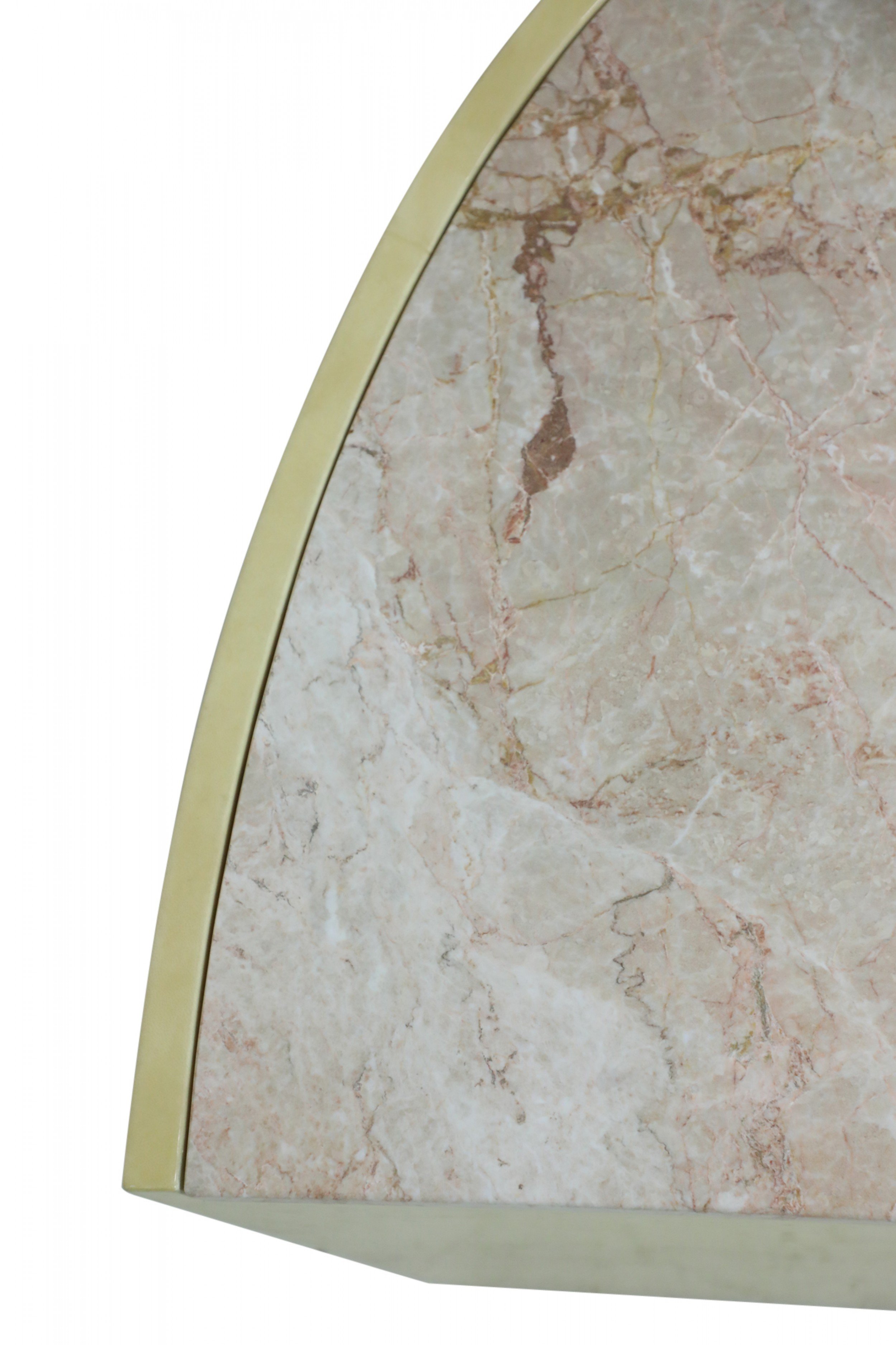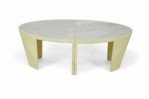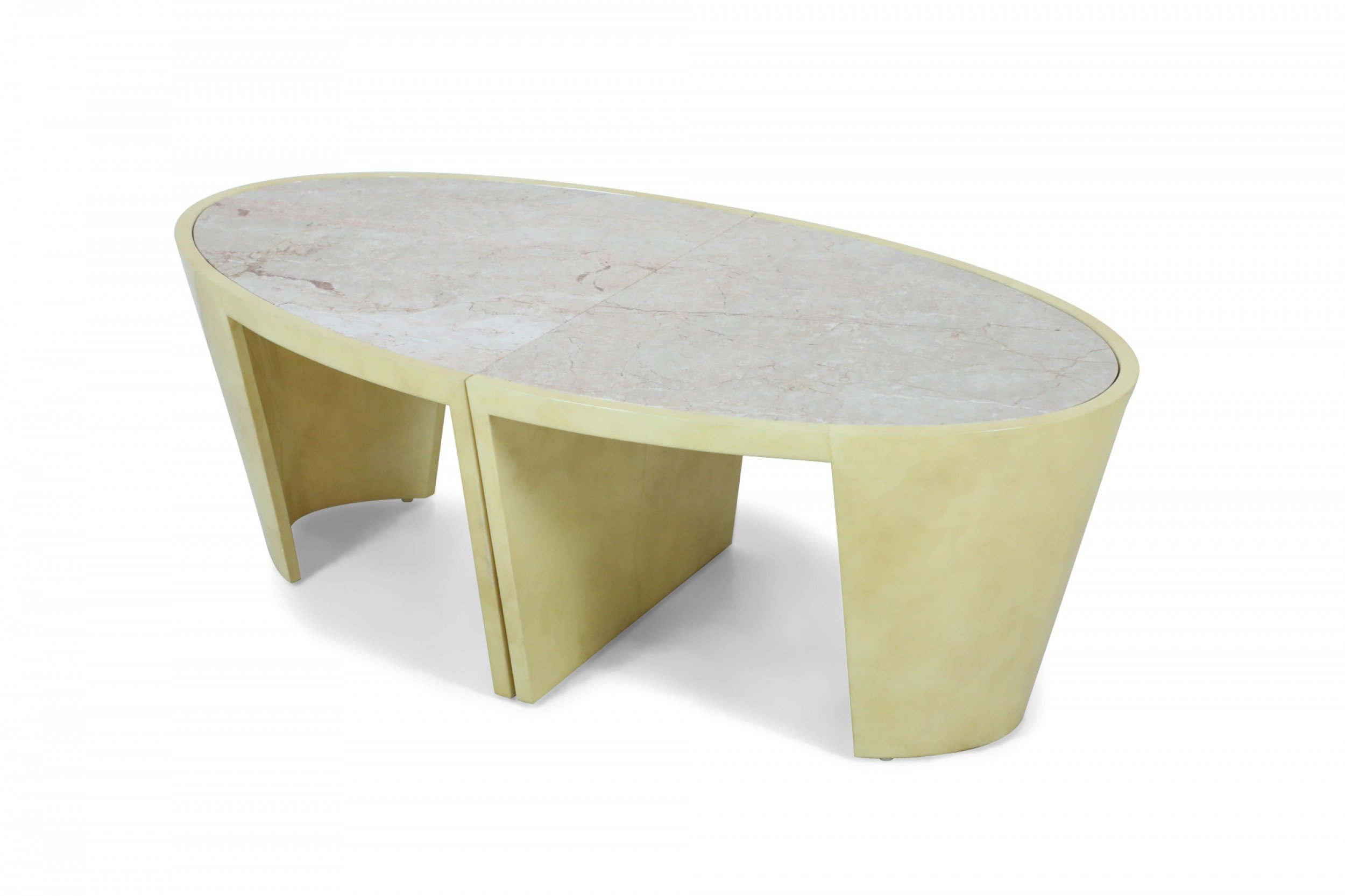 Italian Contemporary oval coffee table in two sections with parchment veneer bases supporting beige Breccia Onitiata marble tops..