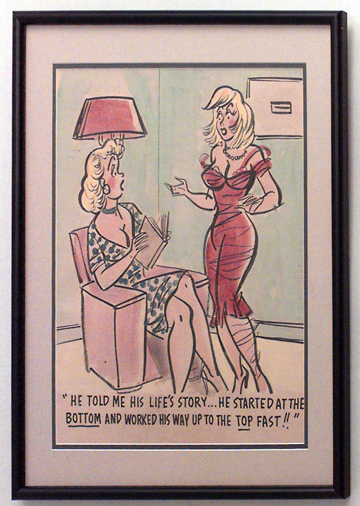 American Mid-Century (unsigned) black framed caricature watercolor of woman in sexy red dress ("He told me his life story - He started at the bottom & worked his way to the top fast").