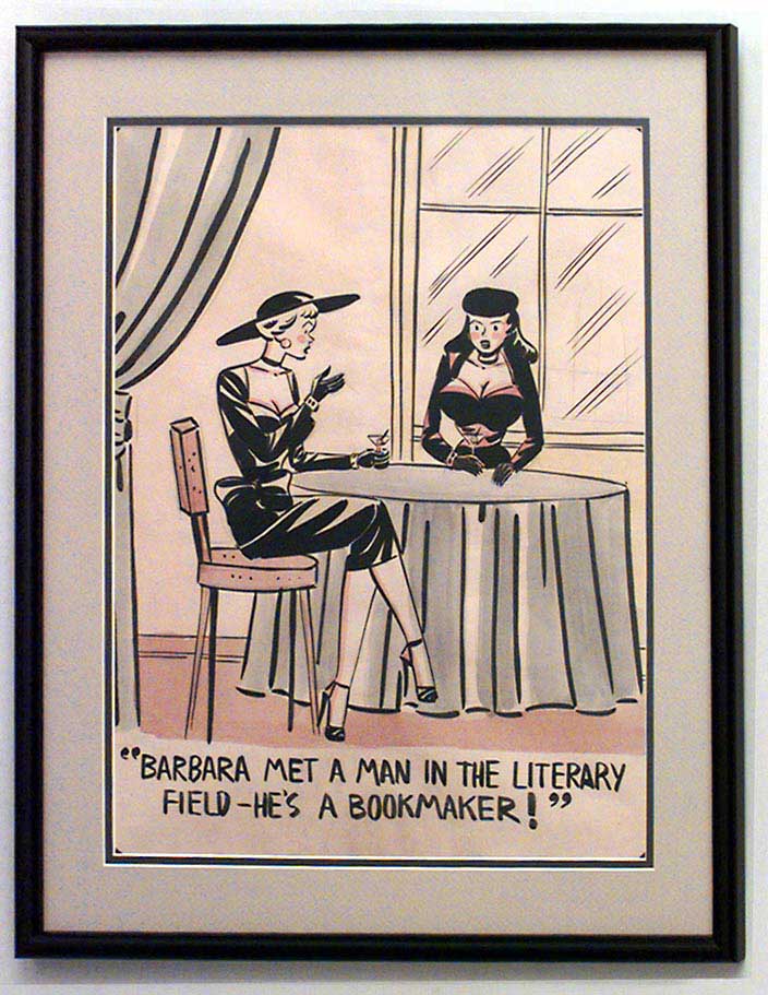 American Mid-Century (unsigned) black-framed caricature watercolor of 2 women chatting ("Barbara met a man in the literary field--he's a bookmaker!").